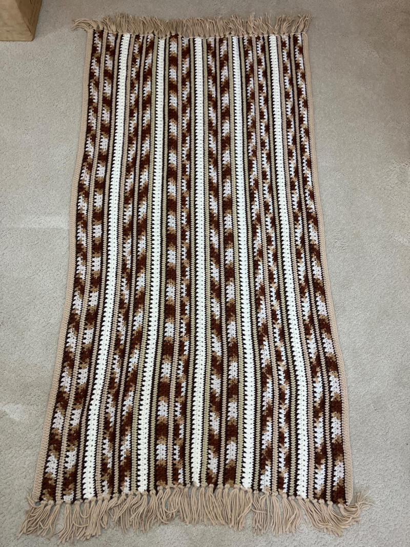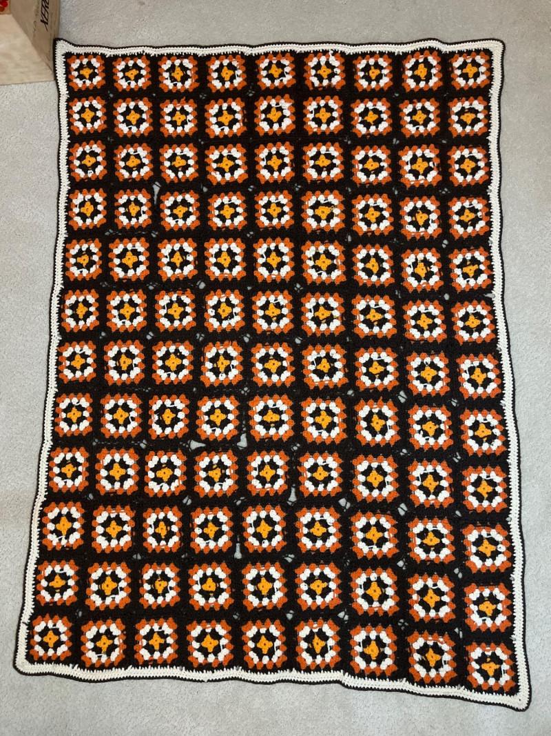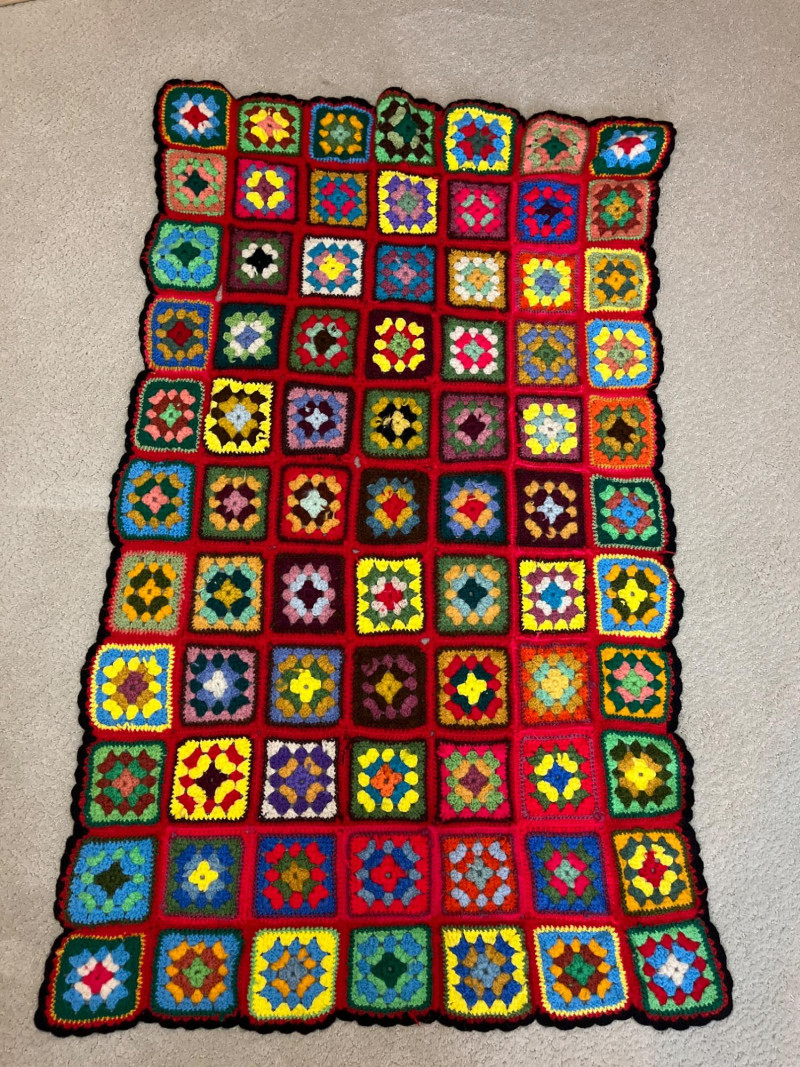 Handmade Crocheted Afghan Blankets - Lot of 5 in Various Sizes The largest of these is the multicolored striped blanket which measures 80" long and 52" wide. The smallest is the black trimmed granny square (last in photos) which measures 50" long and 30" wide.