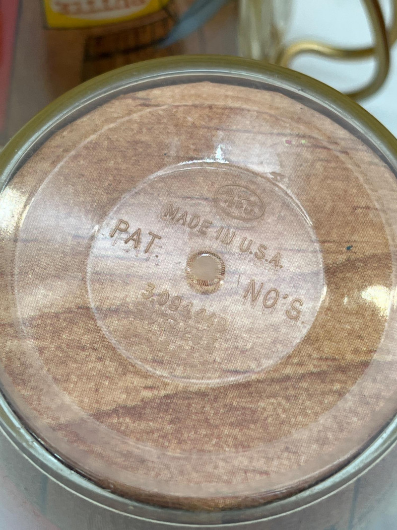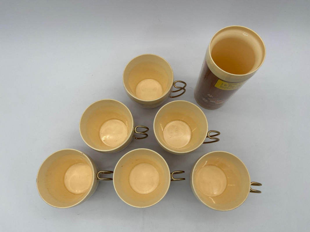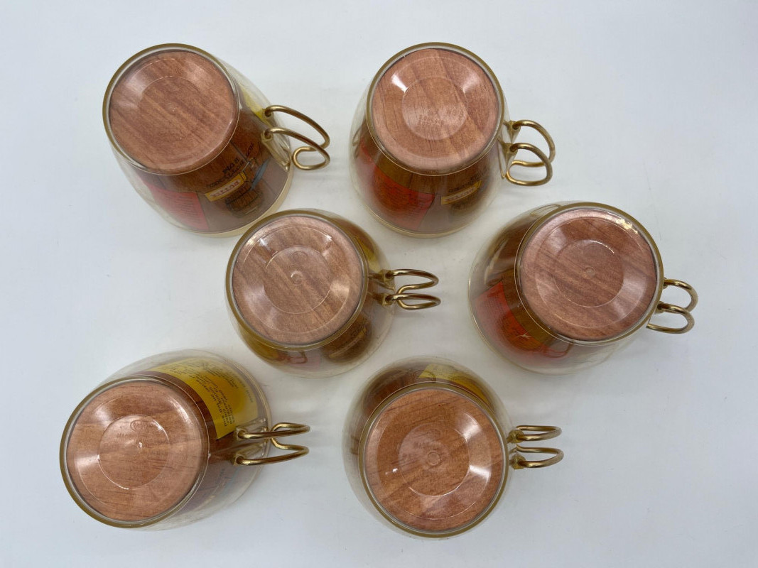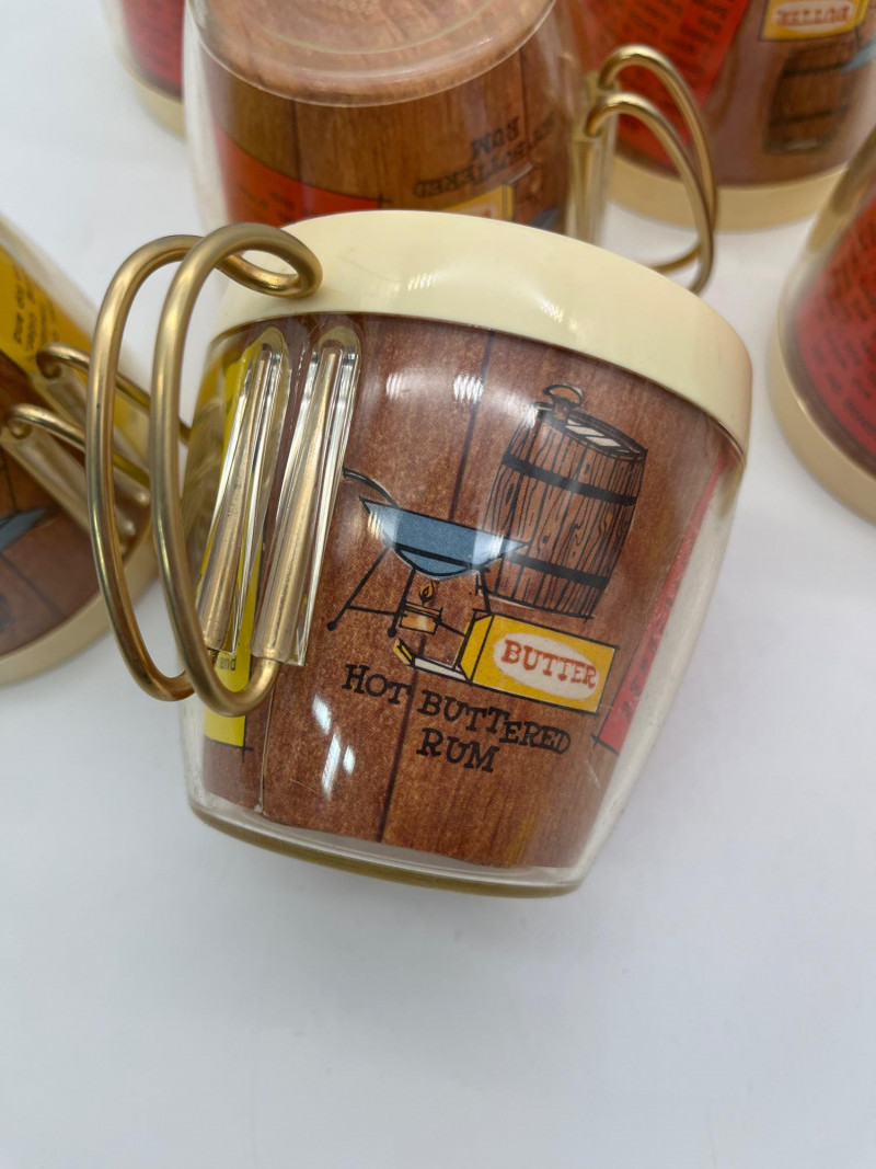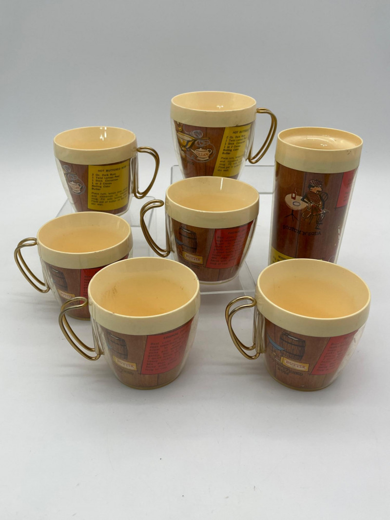 Mid-Century Plastic Insulated Hot Buttered Rum & Eggnog Recipe Mugs This set includes 6 short mugs with brass handles and one tall cup without handle. These are in good vintage condition - one mug has a very small crack on the outer, clear plastic and many have light stains inside.