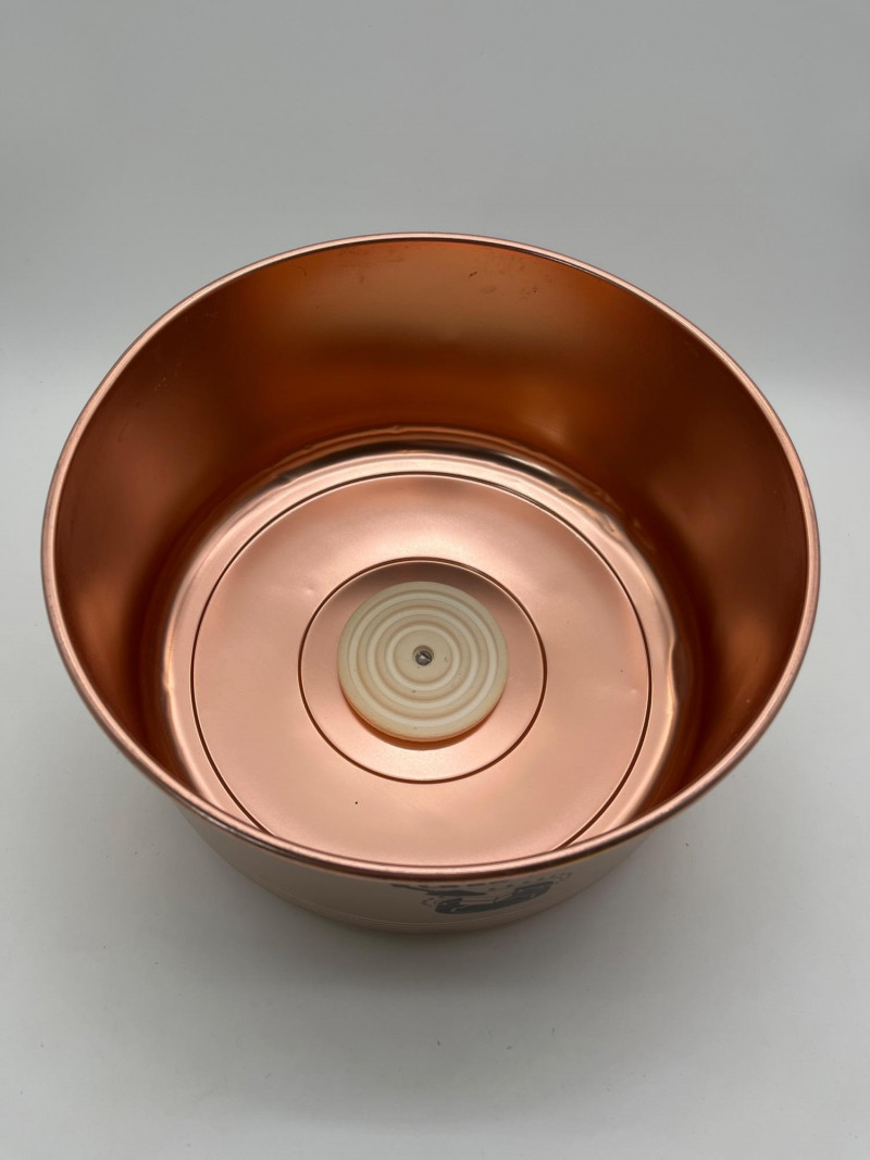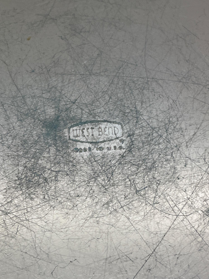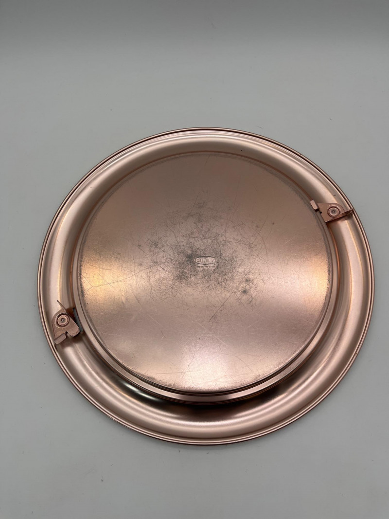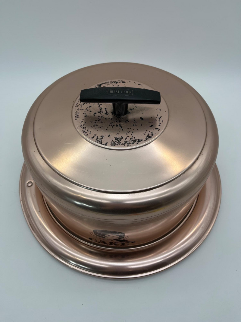 West Bend Copper Finish Cake Plate with Lid / Carrier The bottom plate is 14" wide and the lid locks onto the plate. It is in great vintage condition with just some minor dents and scratches. See photos for detail.