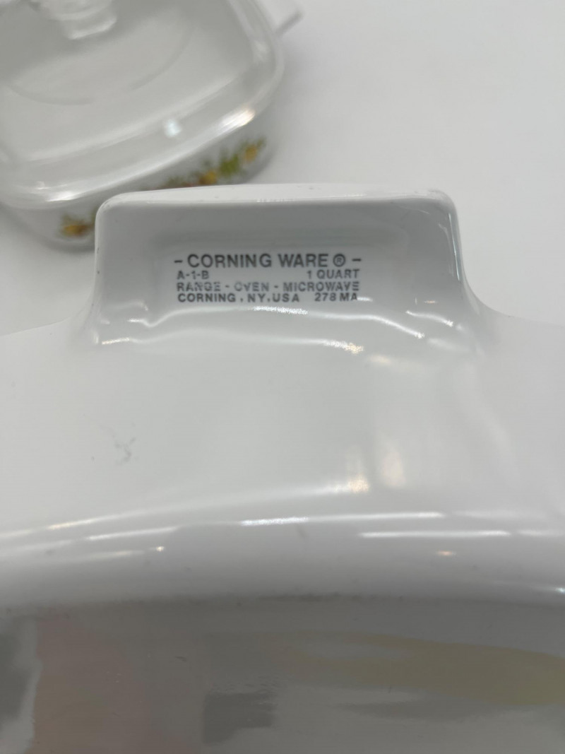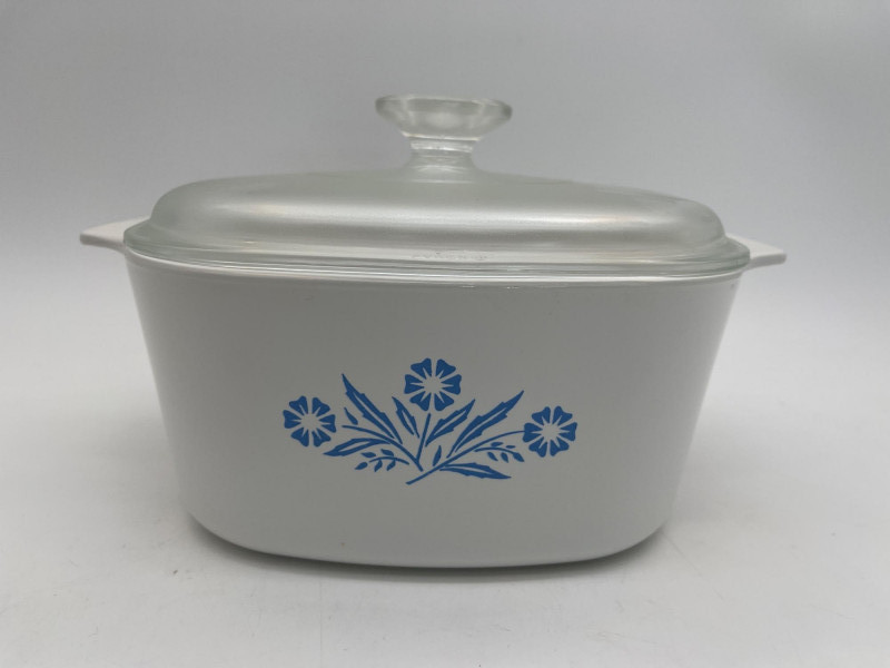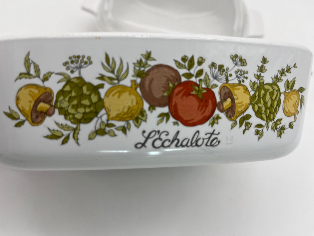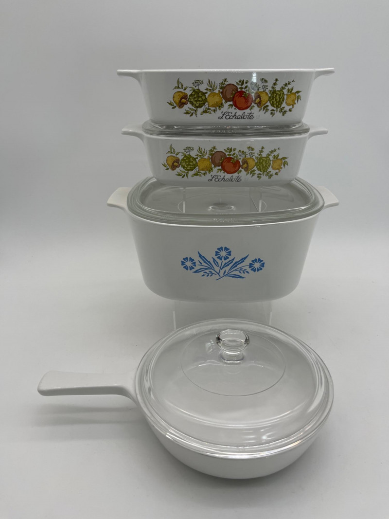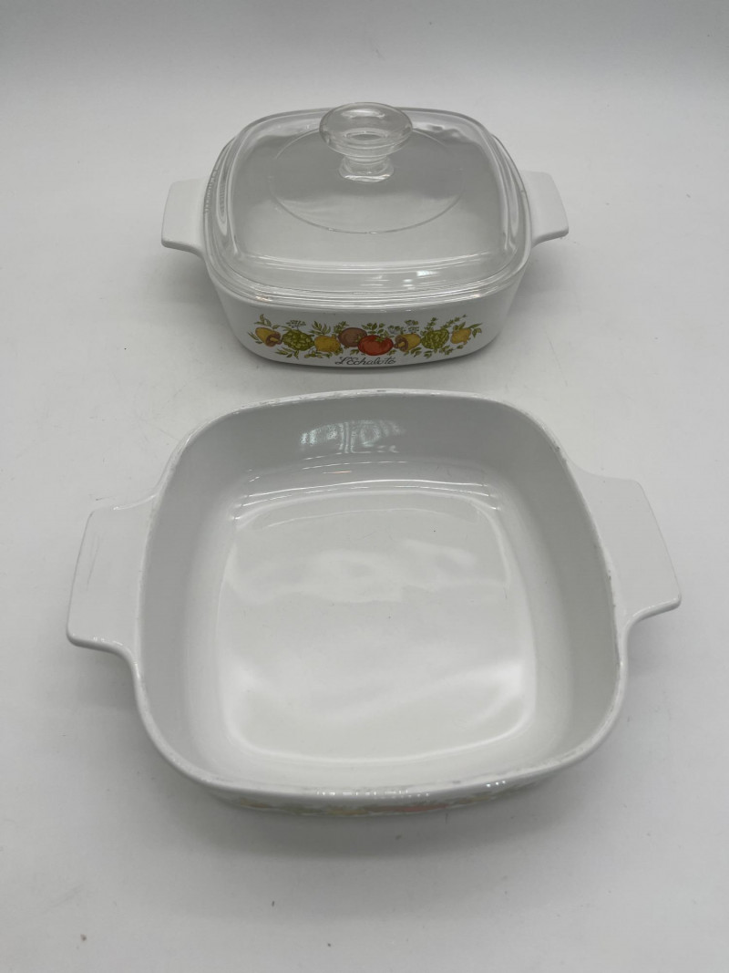 Vintage Corning Ware Casserole and Roasting Dishes with Pyrex Lids These are all in good condition with no major chips and no cracks. There are two of the smaller "Spice of Life" dishes but only one lid.