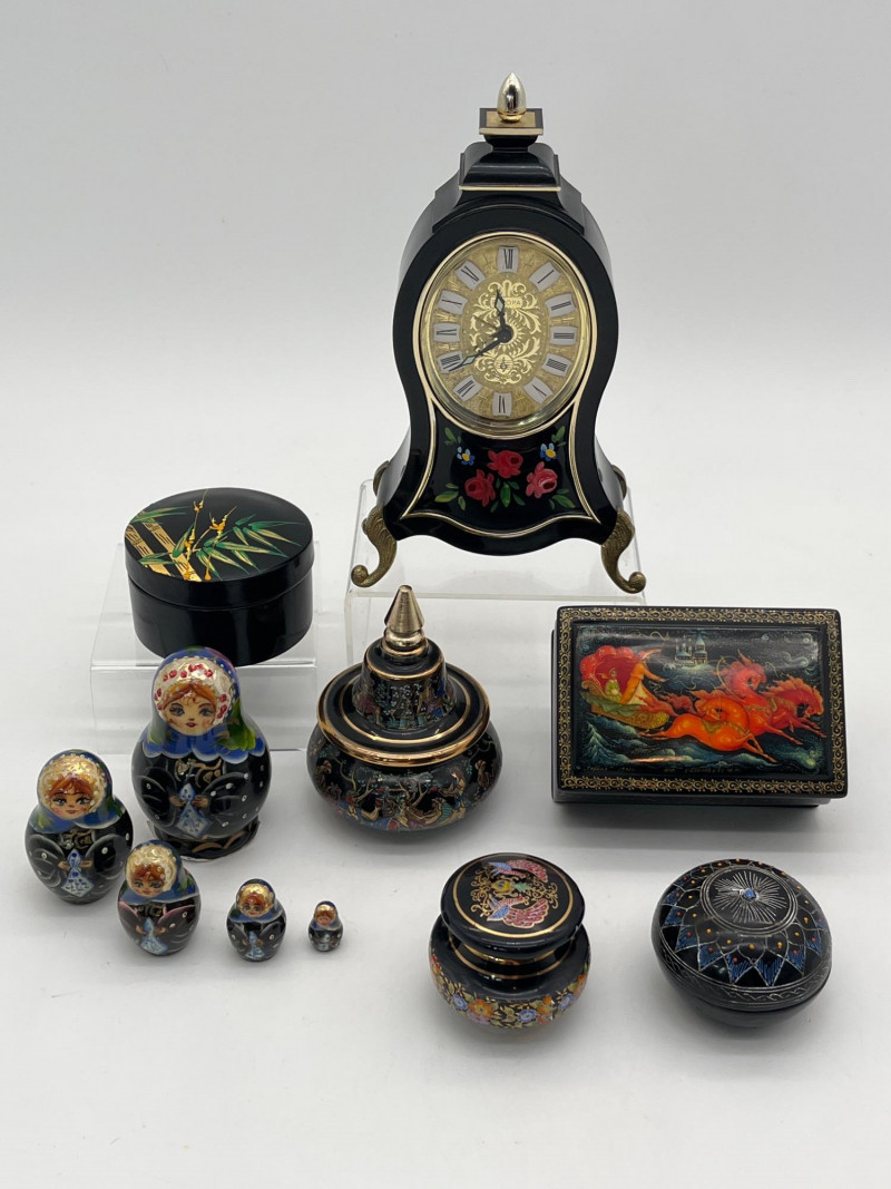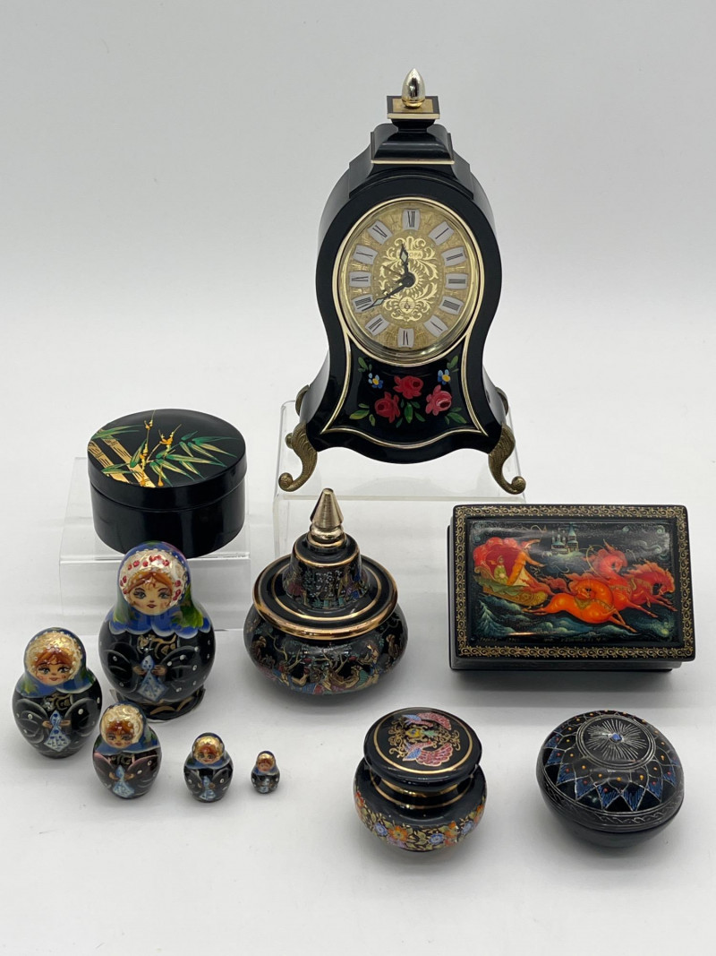 Lot # 34 - Europa Wind-Up Mantel Clock Nesting Dolls and Various Knick Knacks