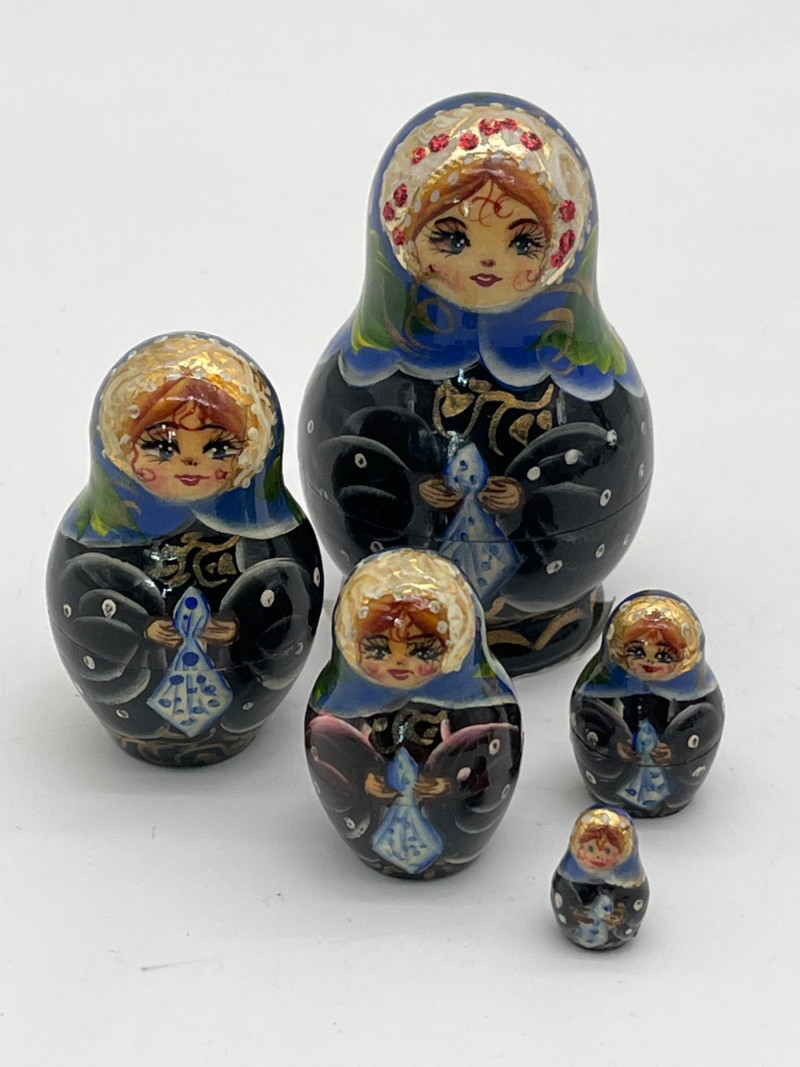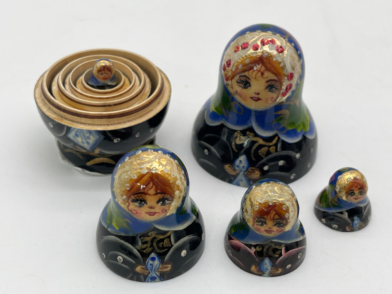 Europa Wind-Up Mantel Clock Nesting Dolls and Various Knick Knacks The clock is 6.5" tall The tallest of the nesting dolls is only 3 3/4" tall and the smallest is about 1/2".