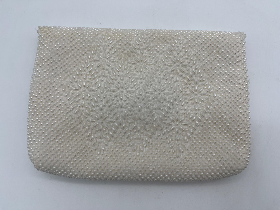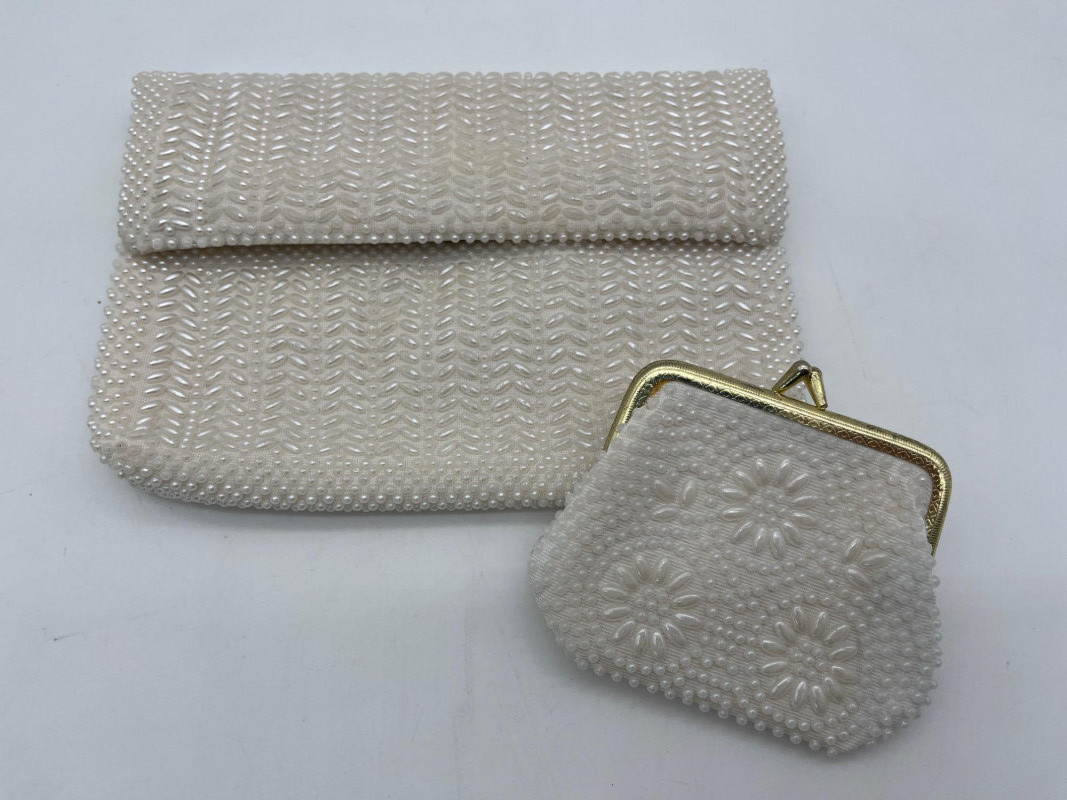 Vintage Beaded Purses, Clutch, and Eel Skin Wallet Lot All pieces are in good condition with the only exception being the white beaded purse needing its chain strap reattached.