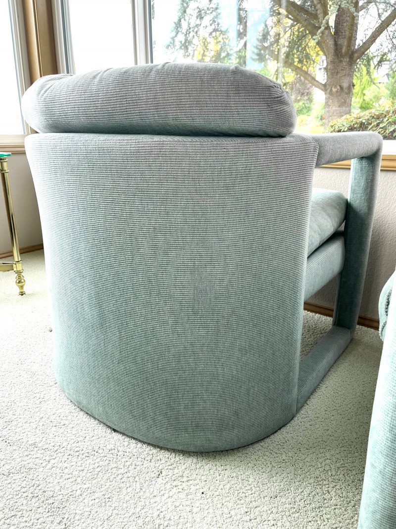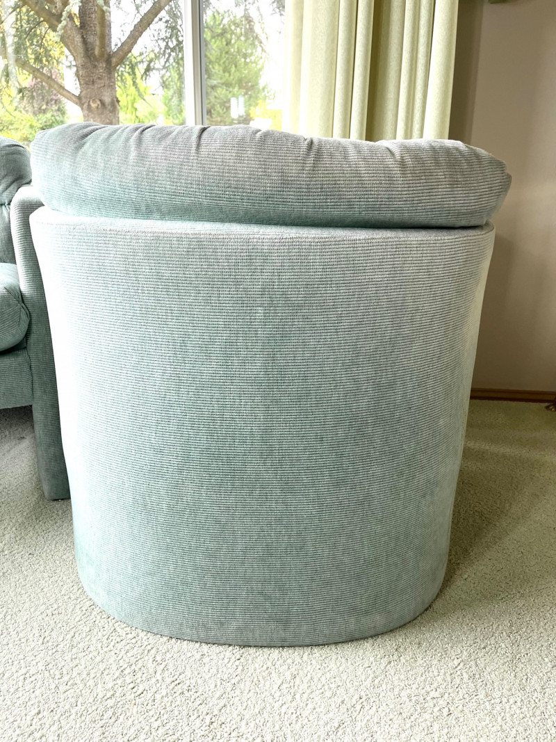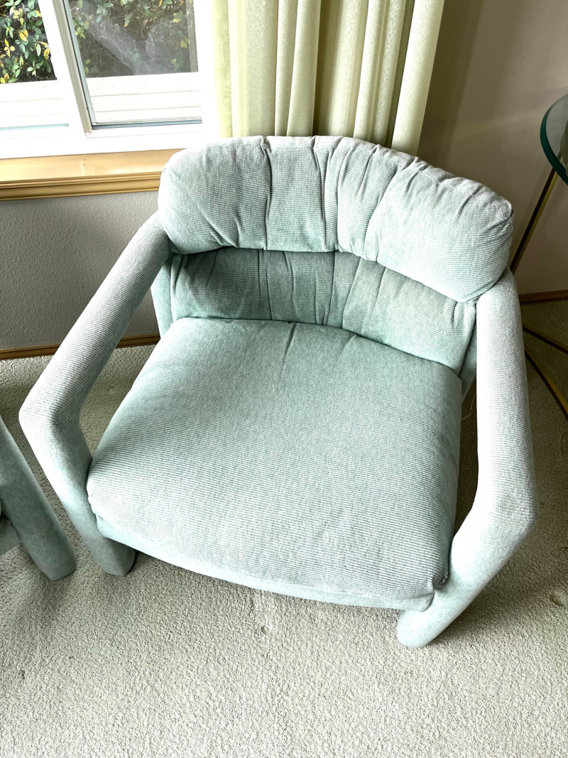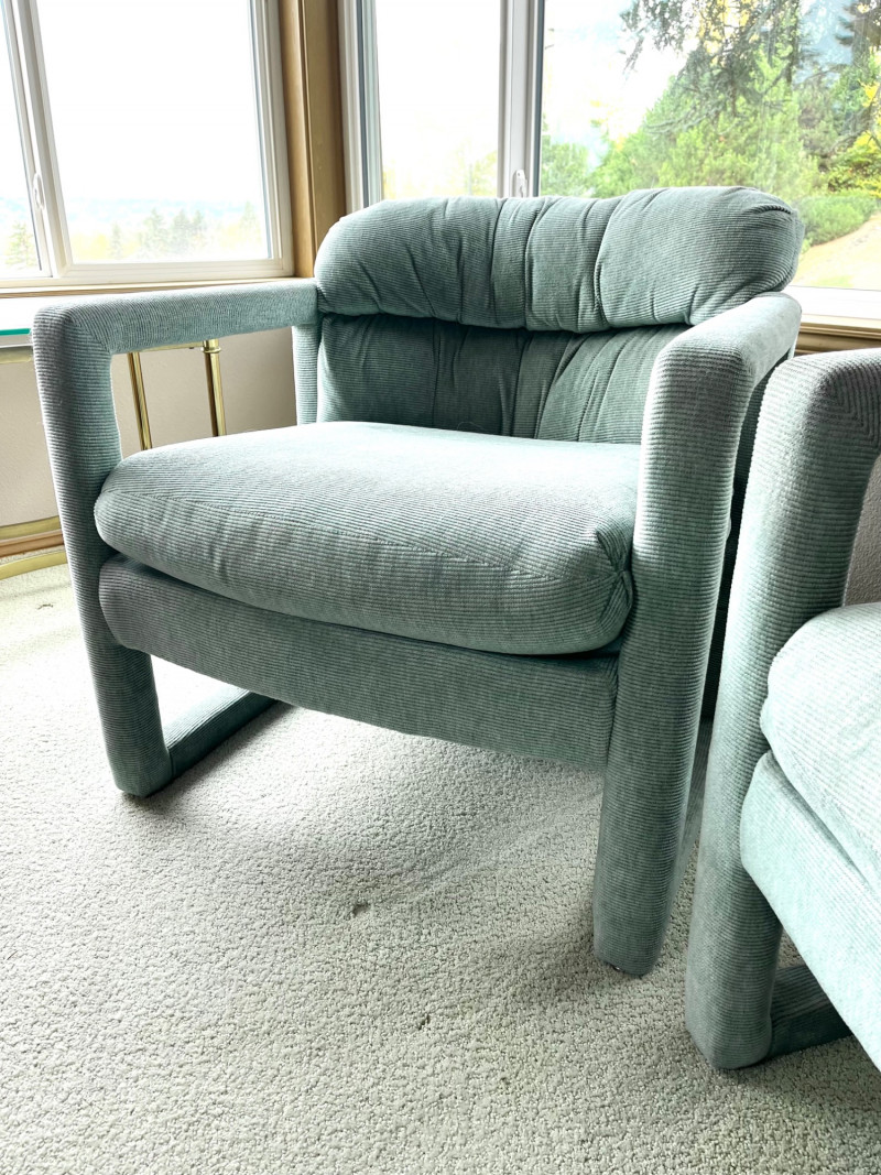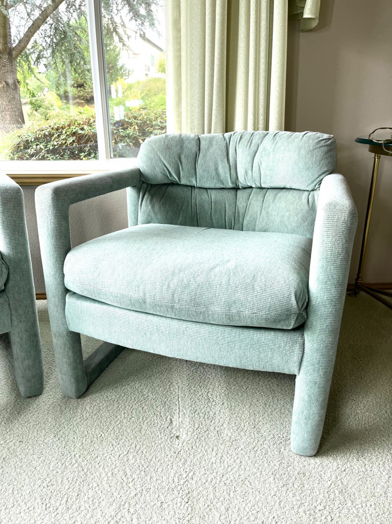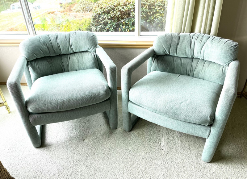 Matching Light Sage Green Upholstered Occasional Chairs 29" wide and 28" tall at their backs. These are in good condition with no stains or tears.