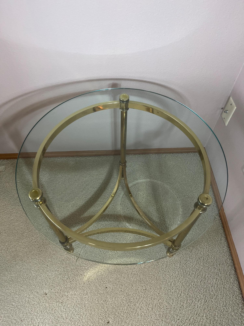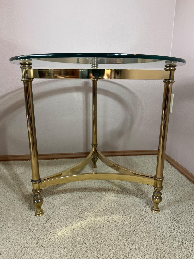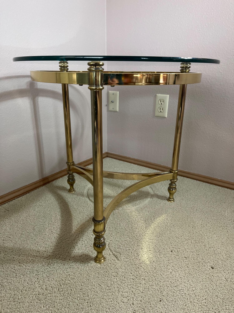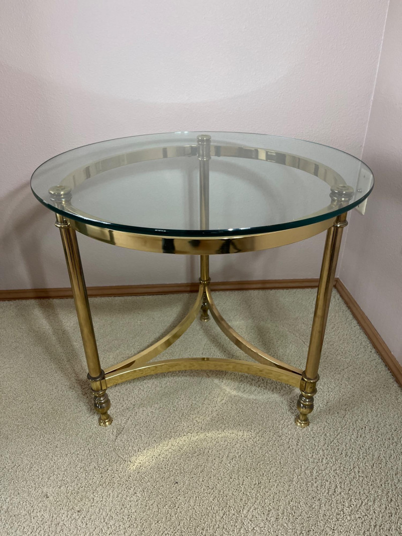 Elegant Brass with Glass Top Round Brass End Table In very good condition. The glass top is very heavy.