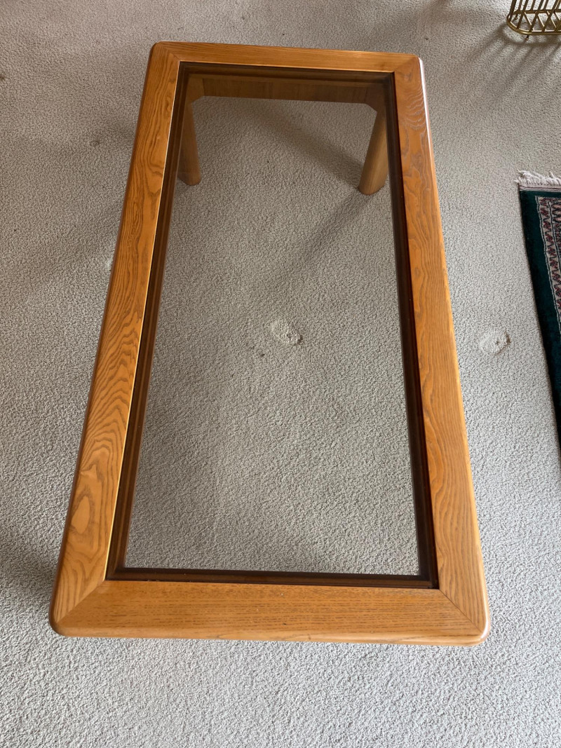 Large Rectangle Oak and Tinted Glass Glass Coffee Table In good condition.