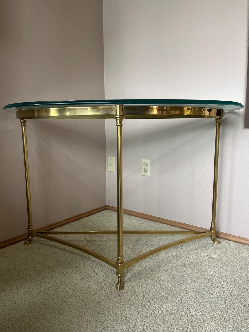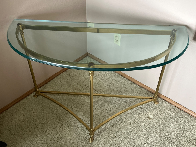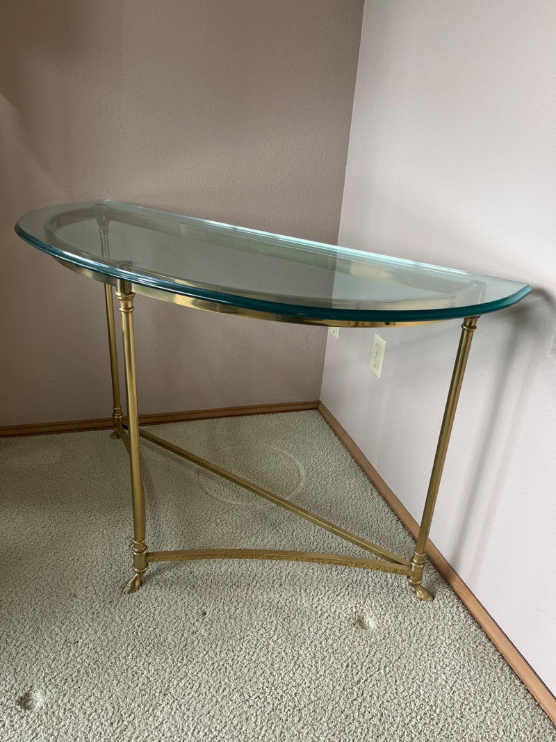 Elegant Brass with Glass Top Sofa Table Measures 43" long and 17" deep. The glass is very heavy and has a beveled edge.