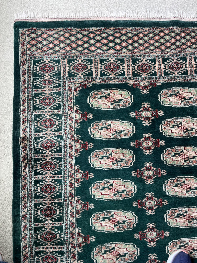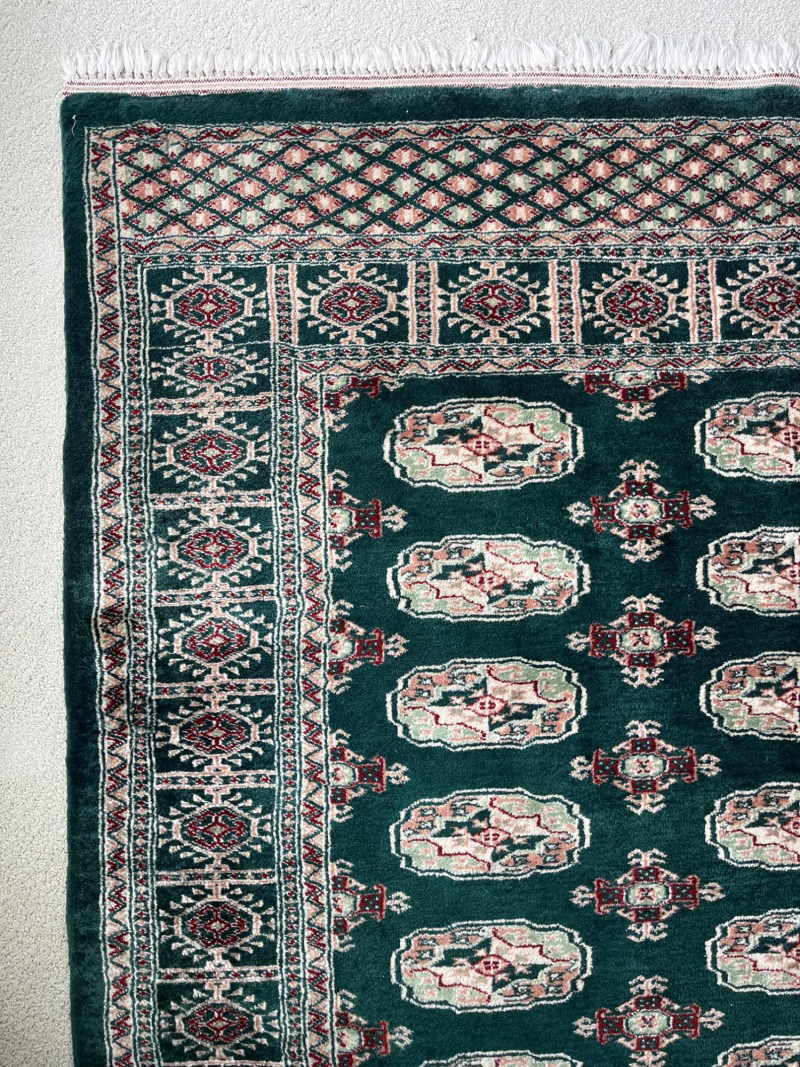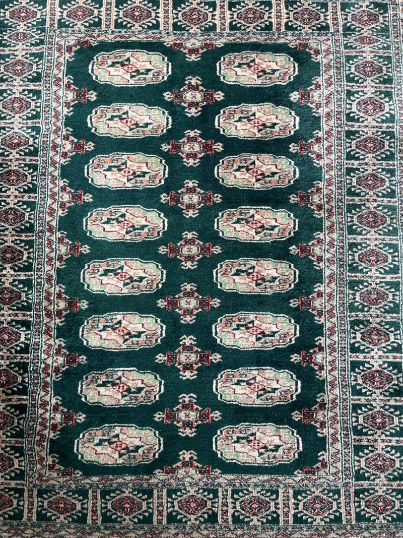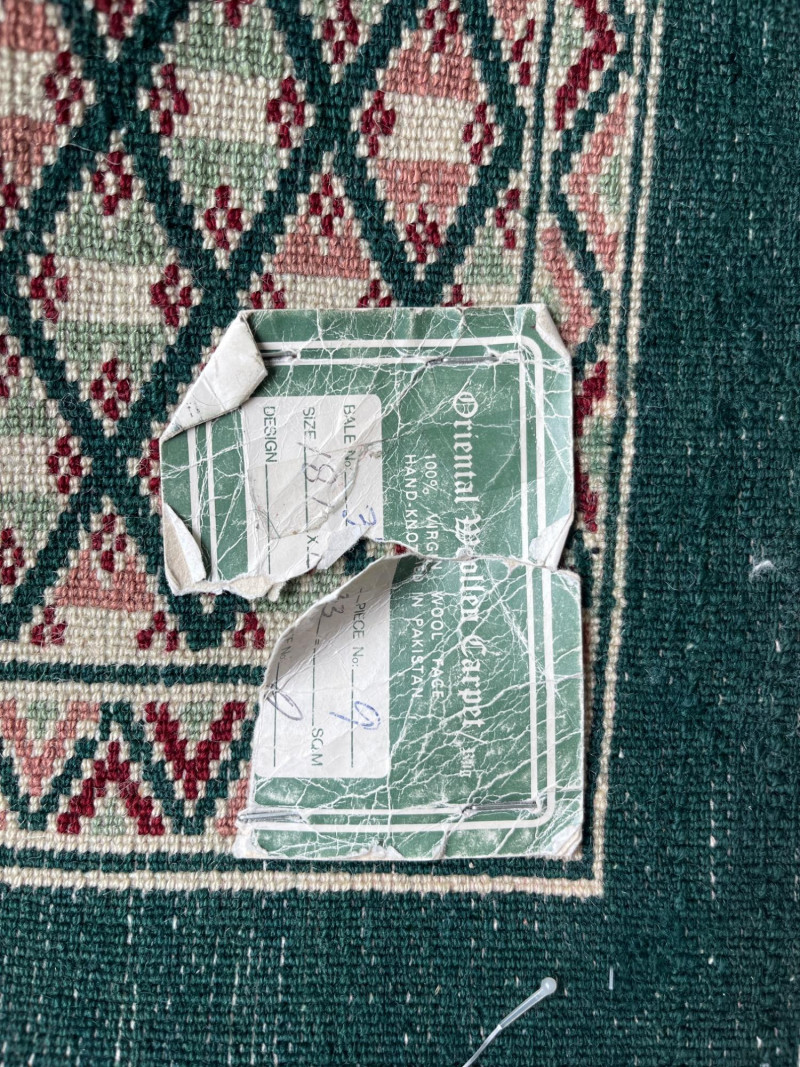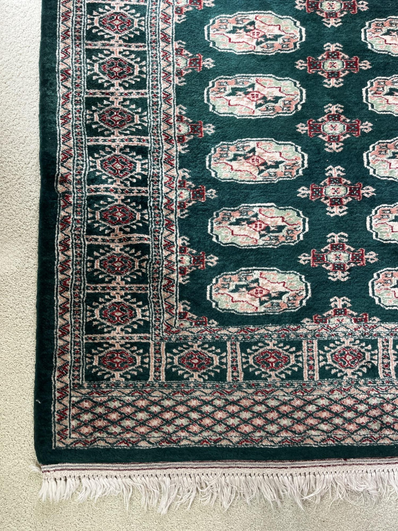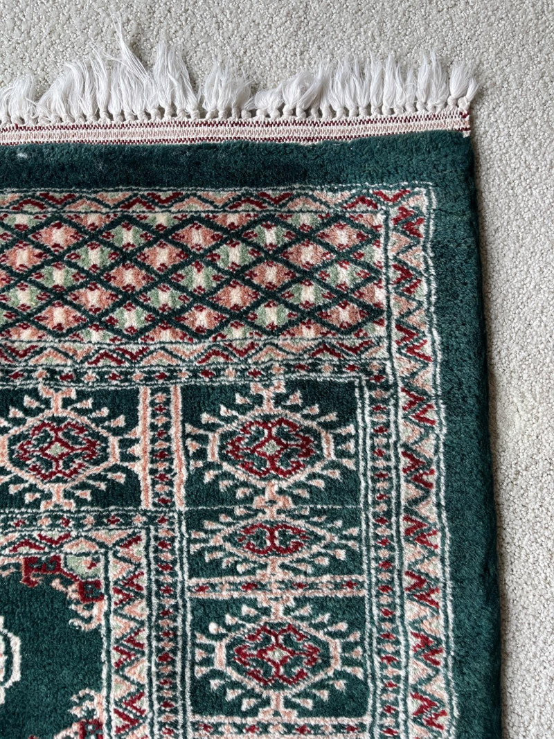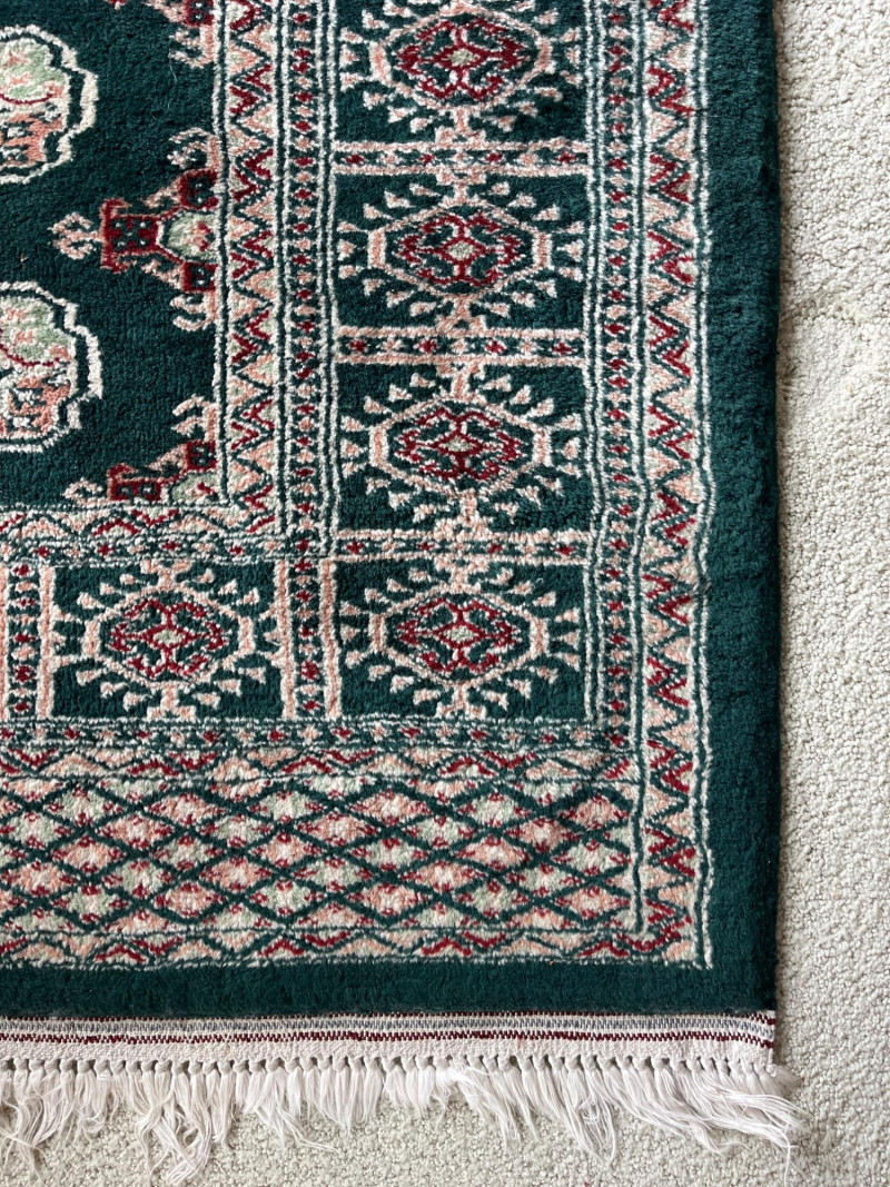 Emerald Green Ornamental Oriental Wool Rug 73" x 52" Measures 73" long with a 2" fringe at each end and 52.5" wide. I see no stains and it has minimal wear.