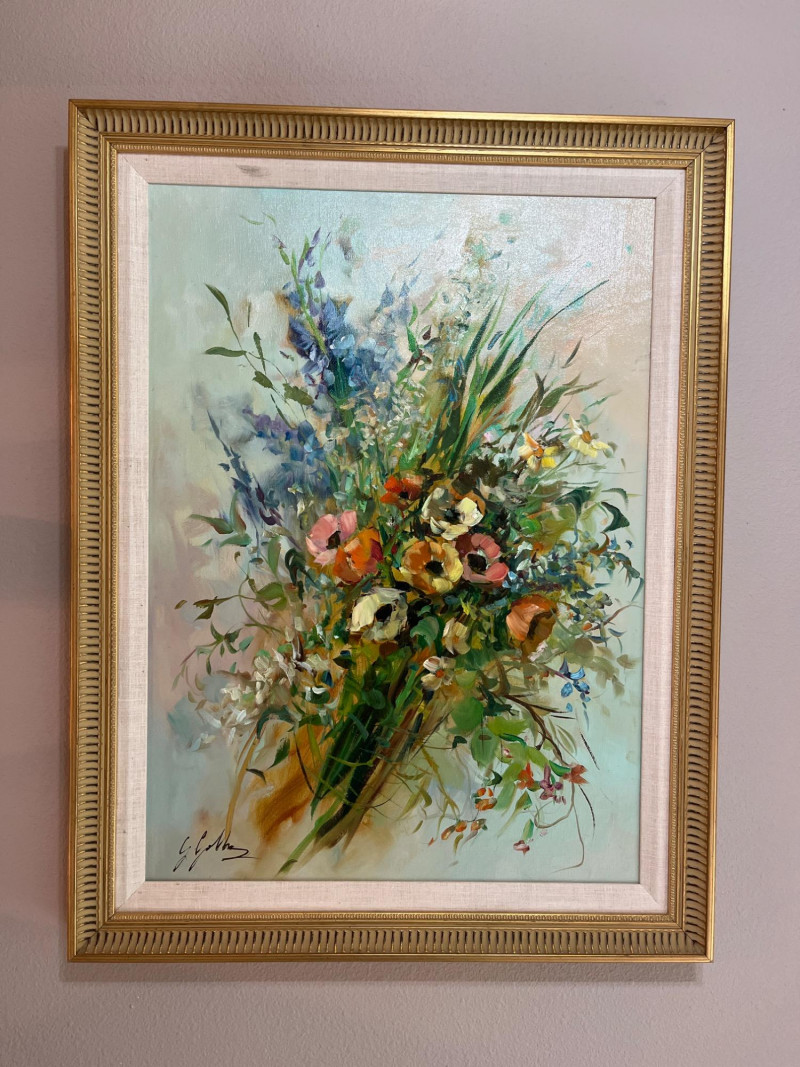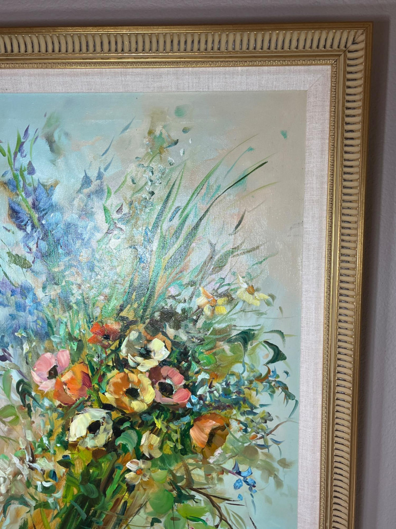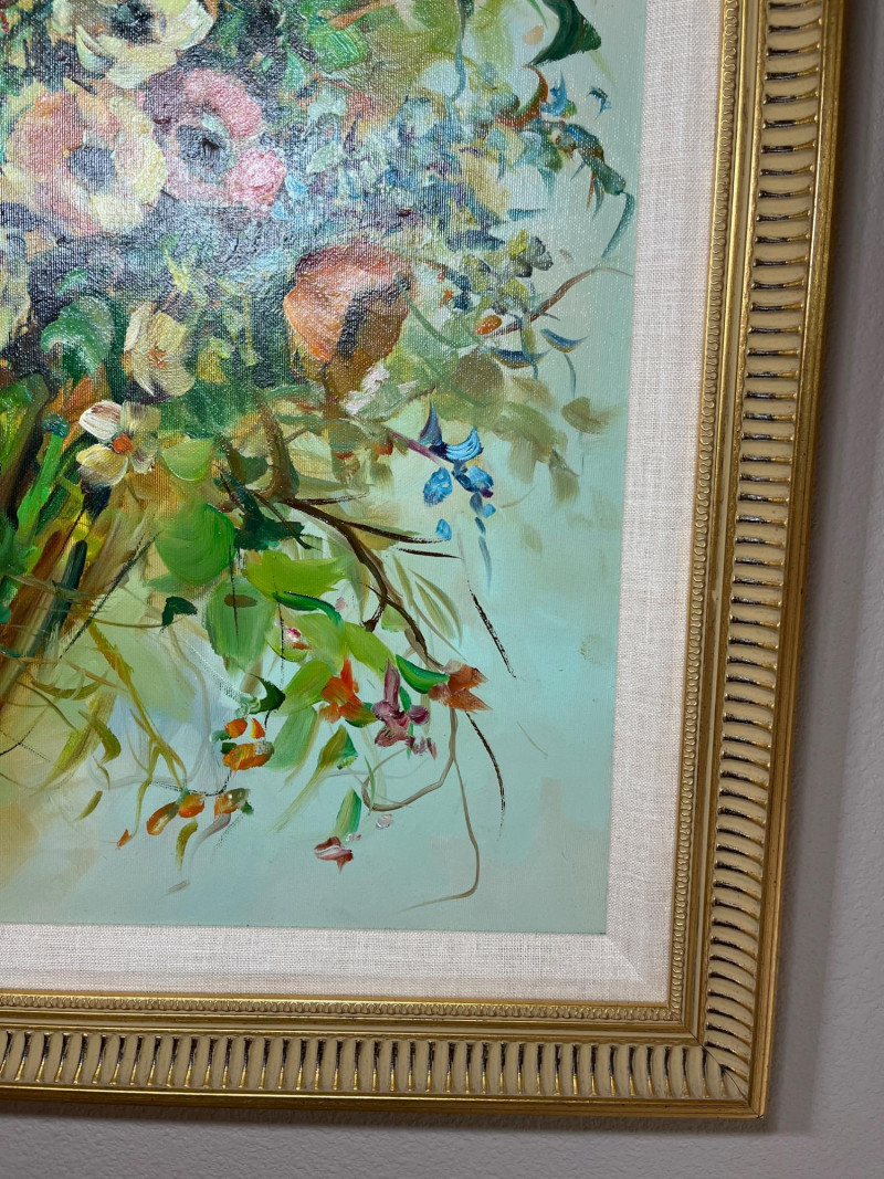 Professionally Framed Floral Painting on Canvas Signed by Artist Frame measures 24" across and 31.5" tall. I can't make out the name of the artist but the date is from 1991.