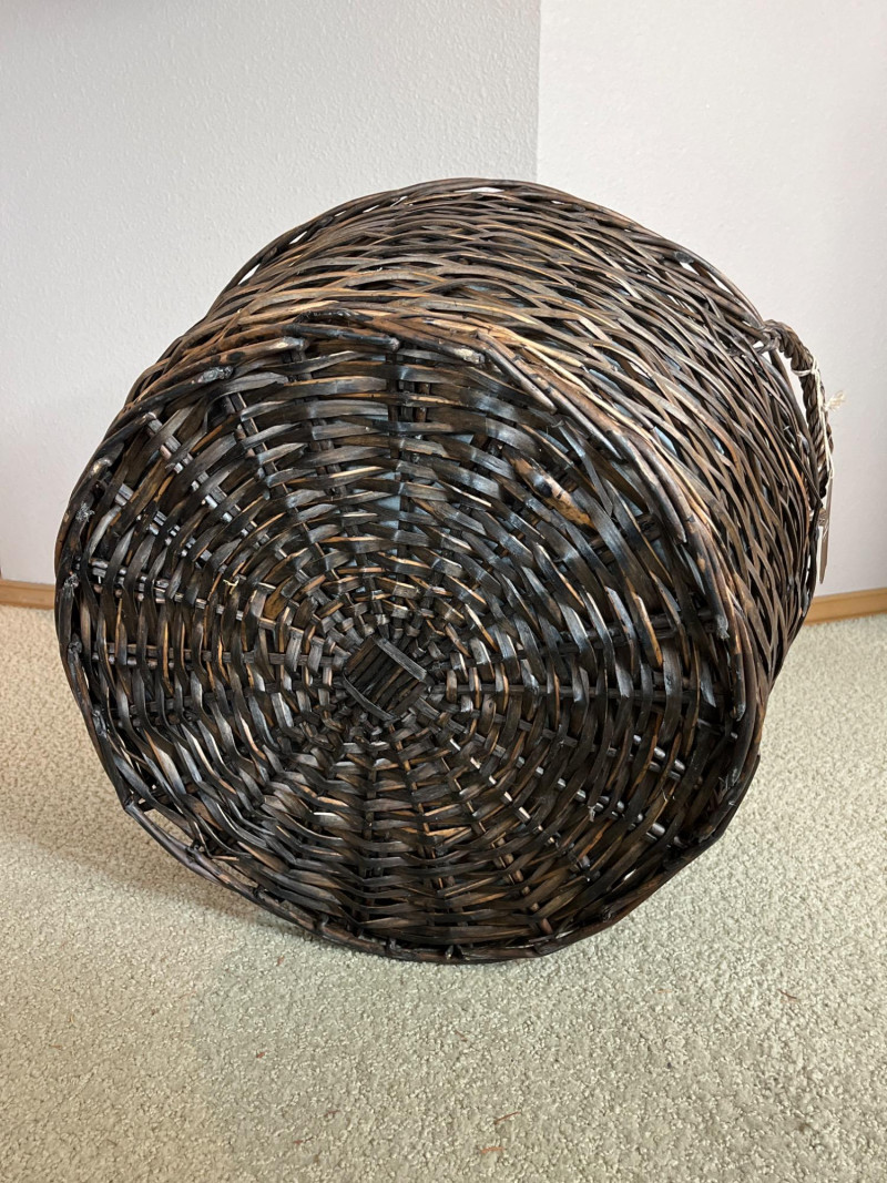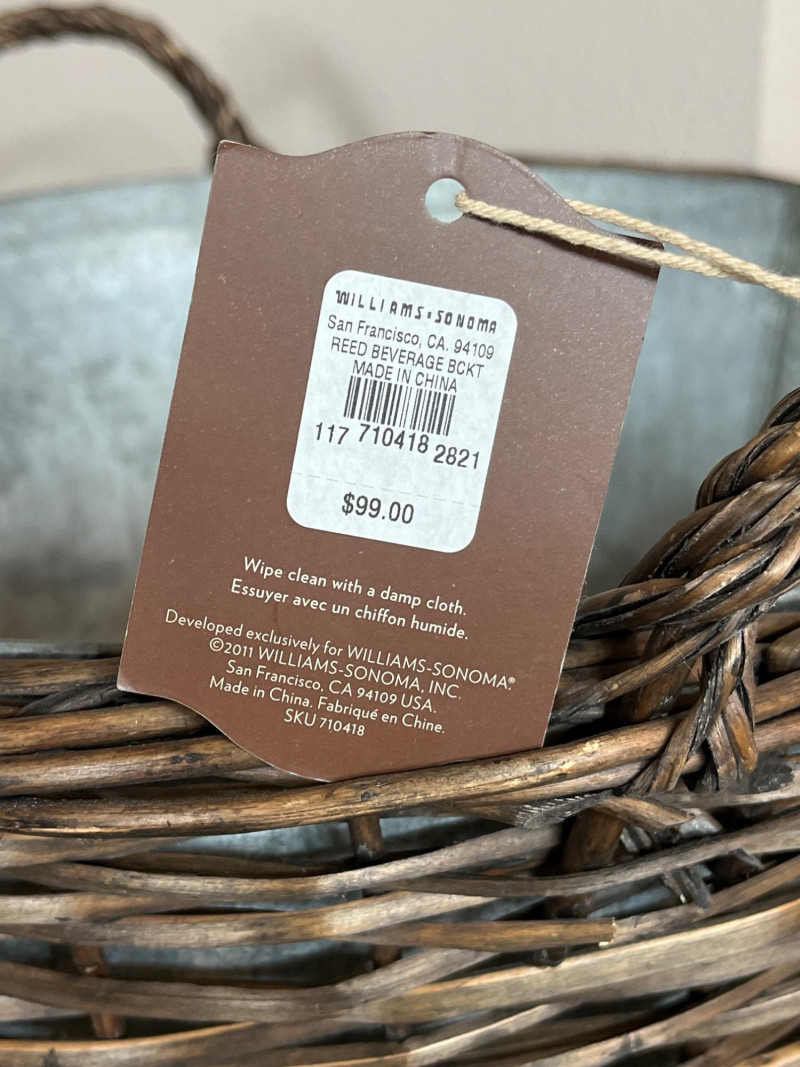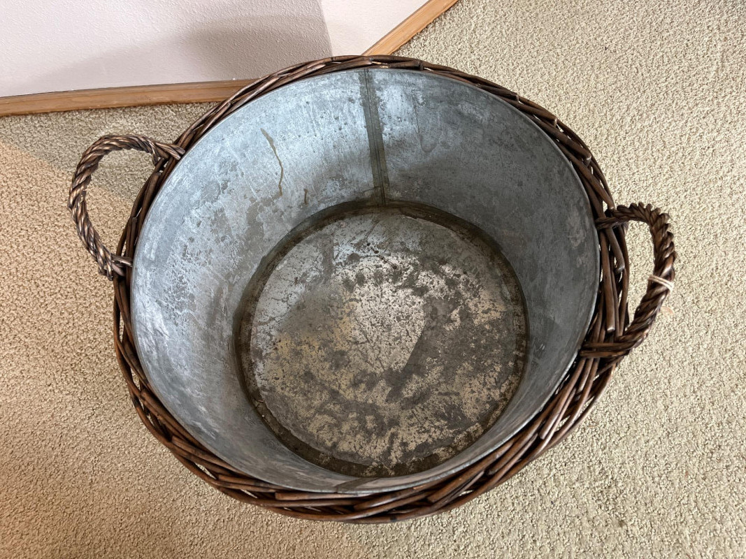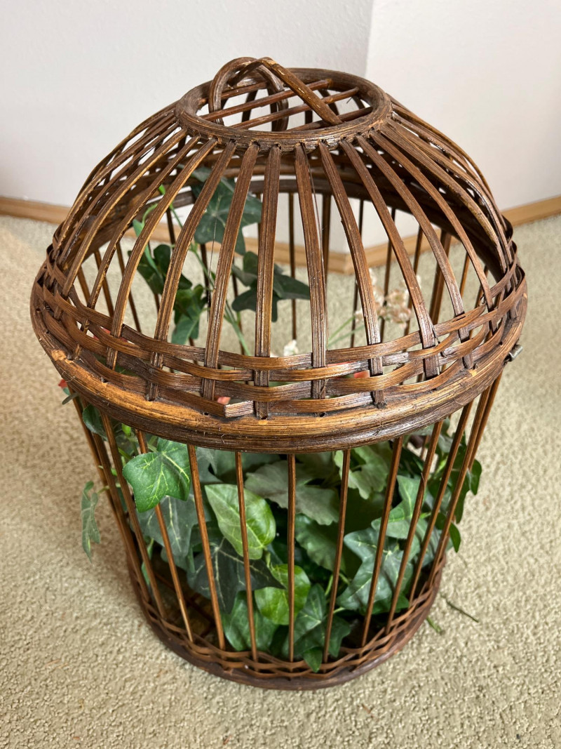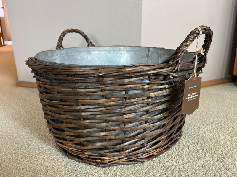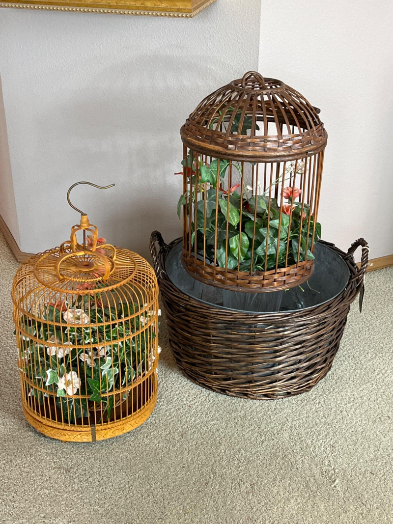 Decorative Wicker Bird Cages and Williams Sonoma Basket with Bucket The bird cages measure 17" and 20" tall and the basket/bucket is 19" wide. The bucket inside the basket looks to be a galvanized steel.