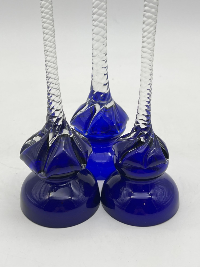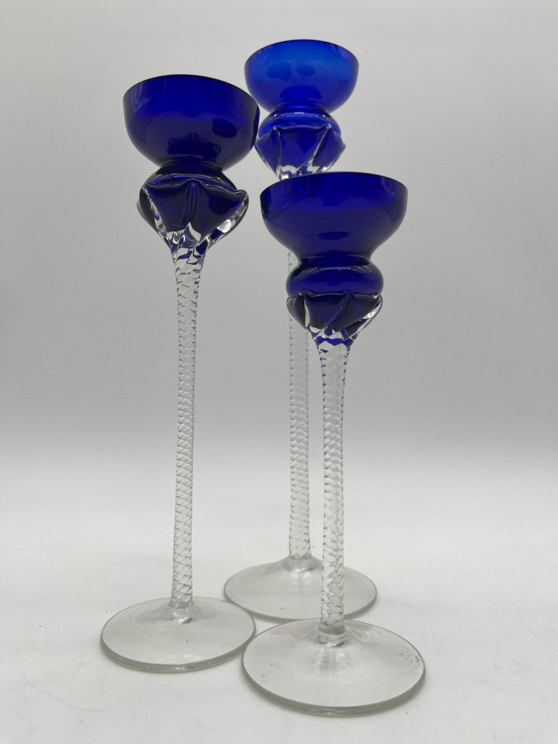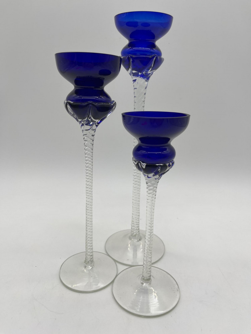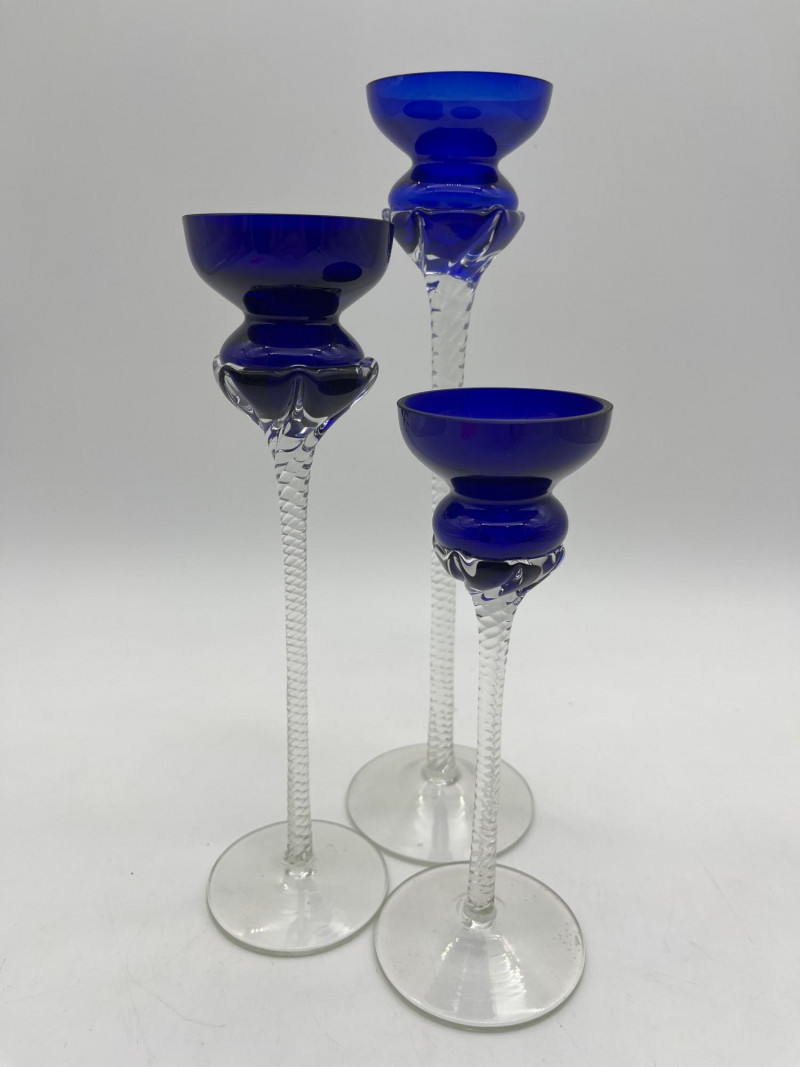 Cobalt Blue and Clear Art Glass Candle Holders Tallest is 10.5" tall and the shortest is 8". All three are in good condition with no damage.