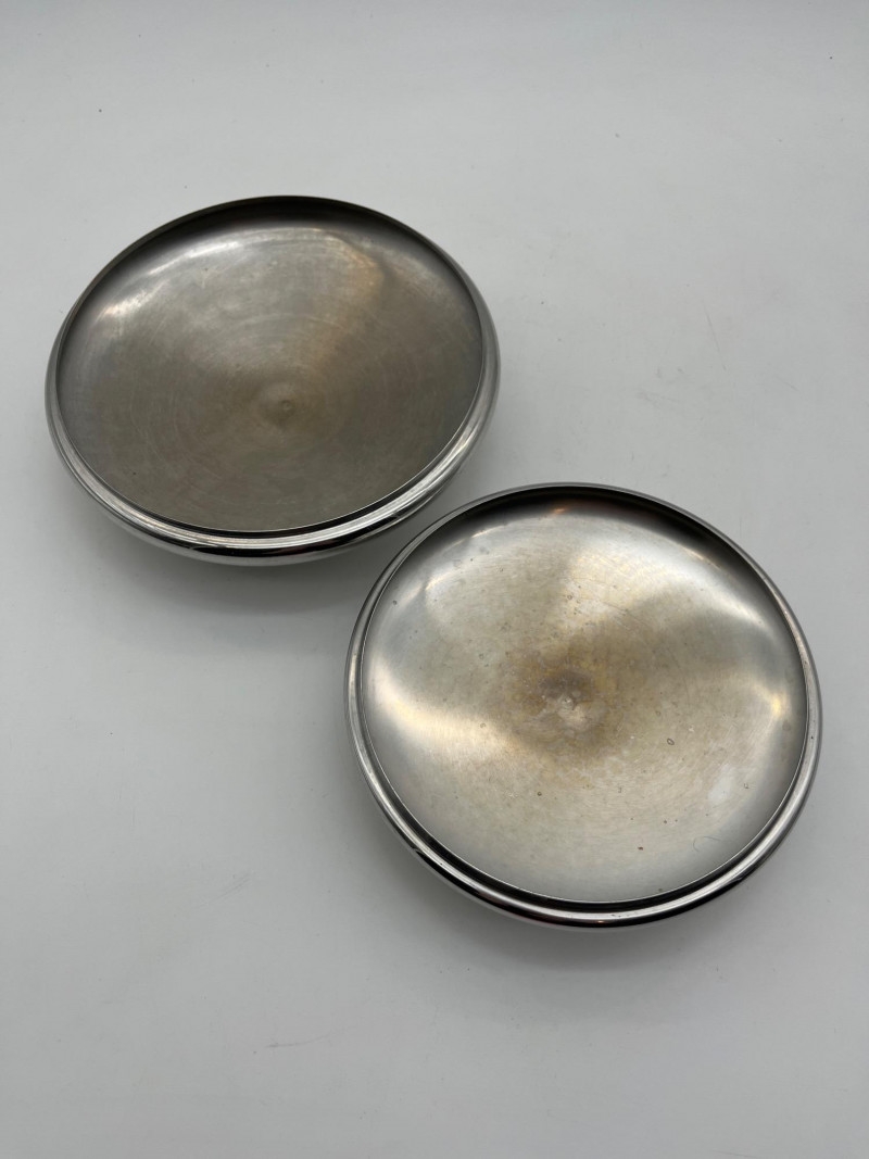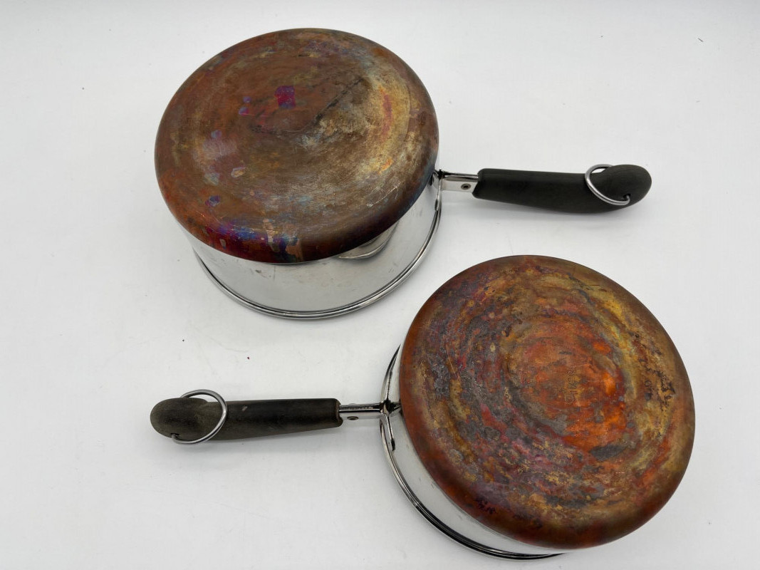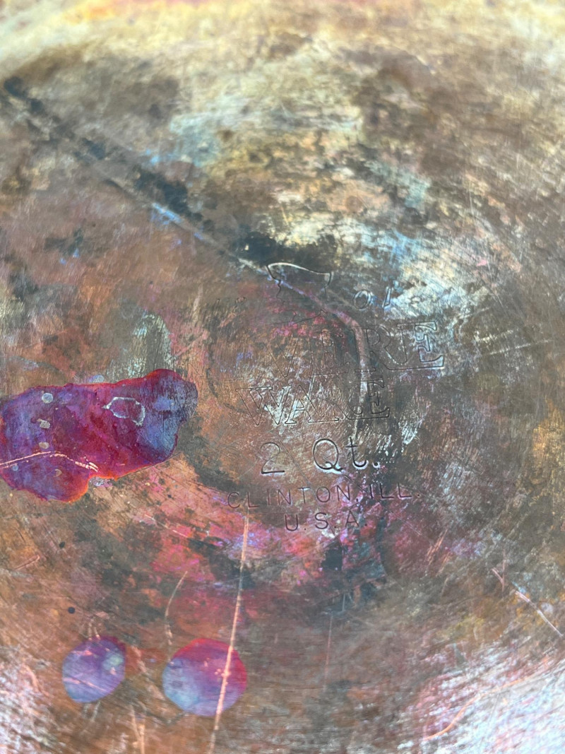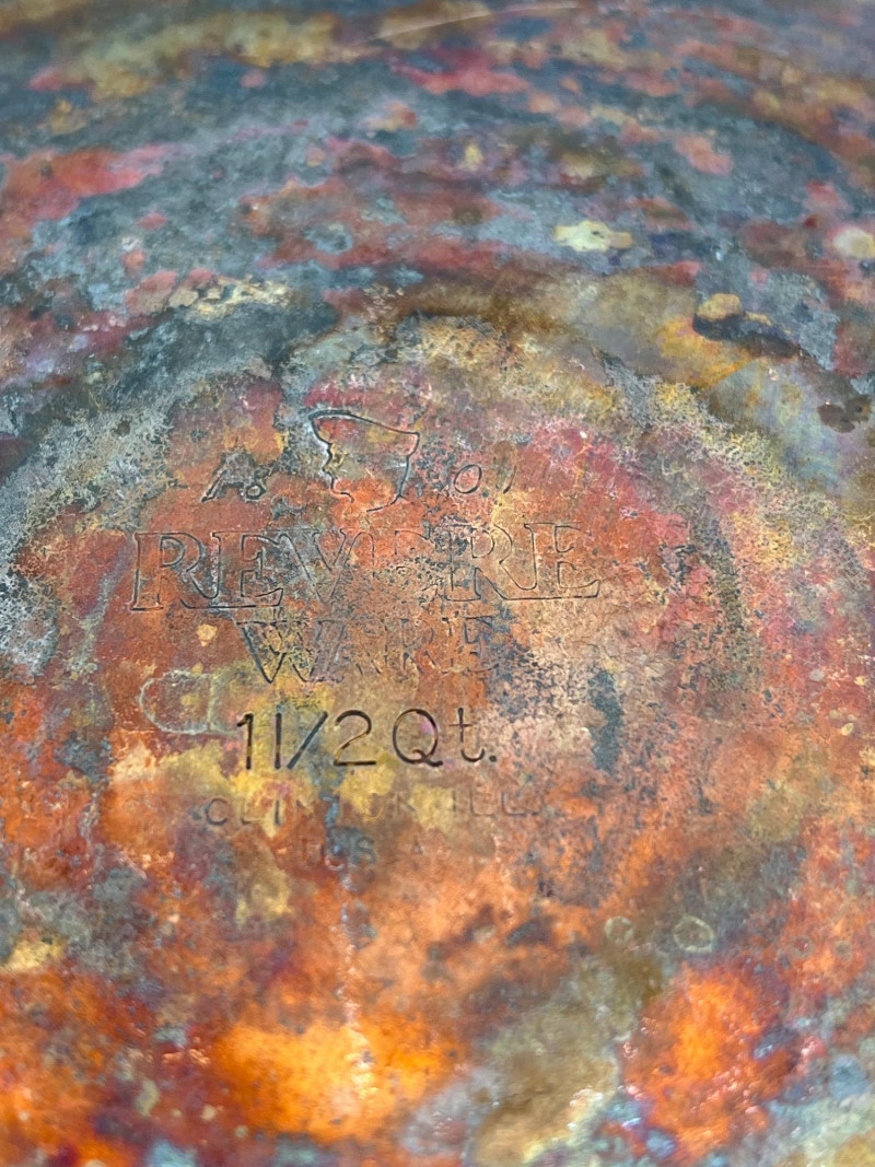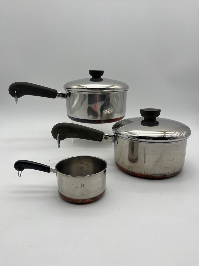 Copper Bottom Revere Ware 1.5qt and 2qt Pans and 1 Cup Measuring Pan These are in good condition, they just need a good scrub. No dents and handles feel stable.