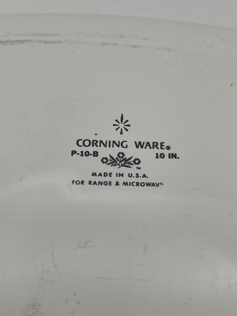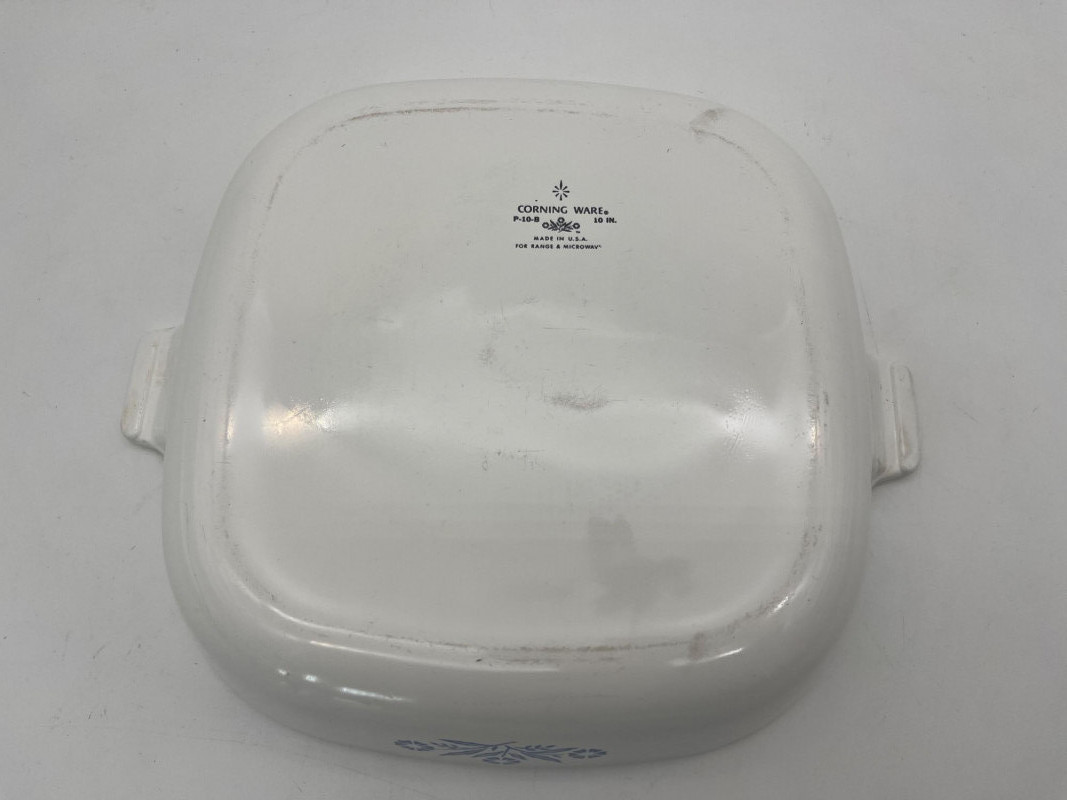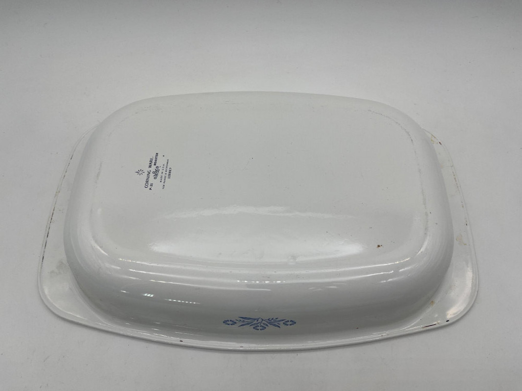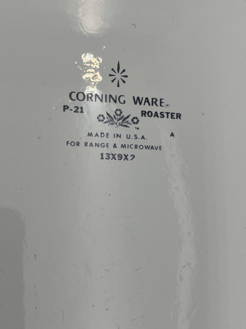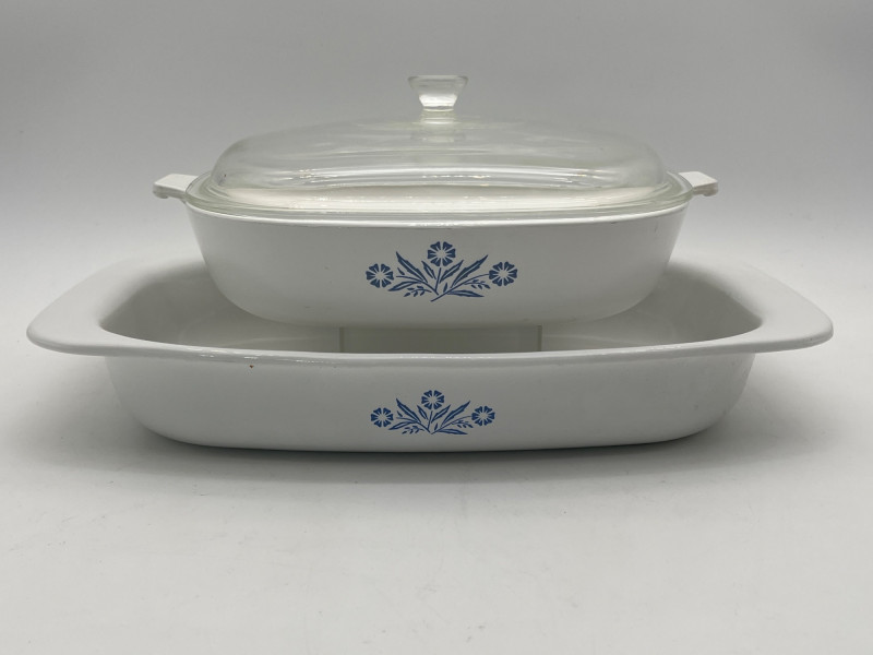 Corning Ware Blue Cornflower Roaster and Casserole Dishes The roaster and casserole dishes are in good condition, just needing a good scrub. The lid for the casserole dish does have a chip on the corner which I show close-up in photos.