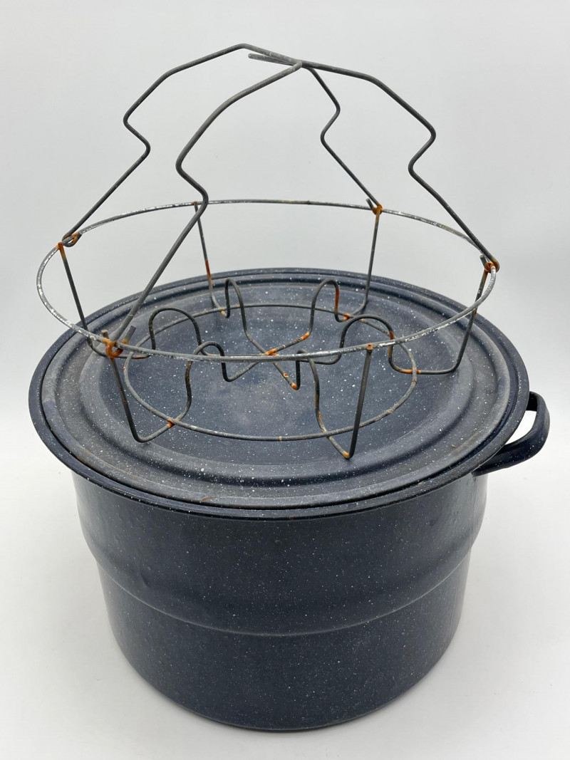 Blue Granite Ware Canning Water Bath Pot with Wire Rack In good vintage condition, just needs a good wash. The wire rack had some rust which you can see in photos.