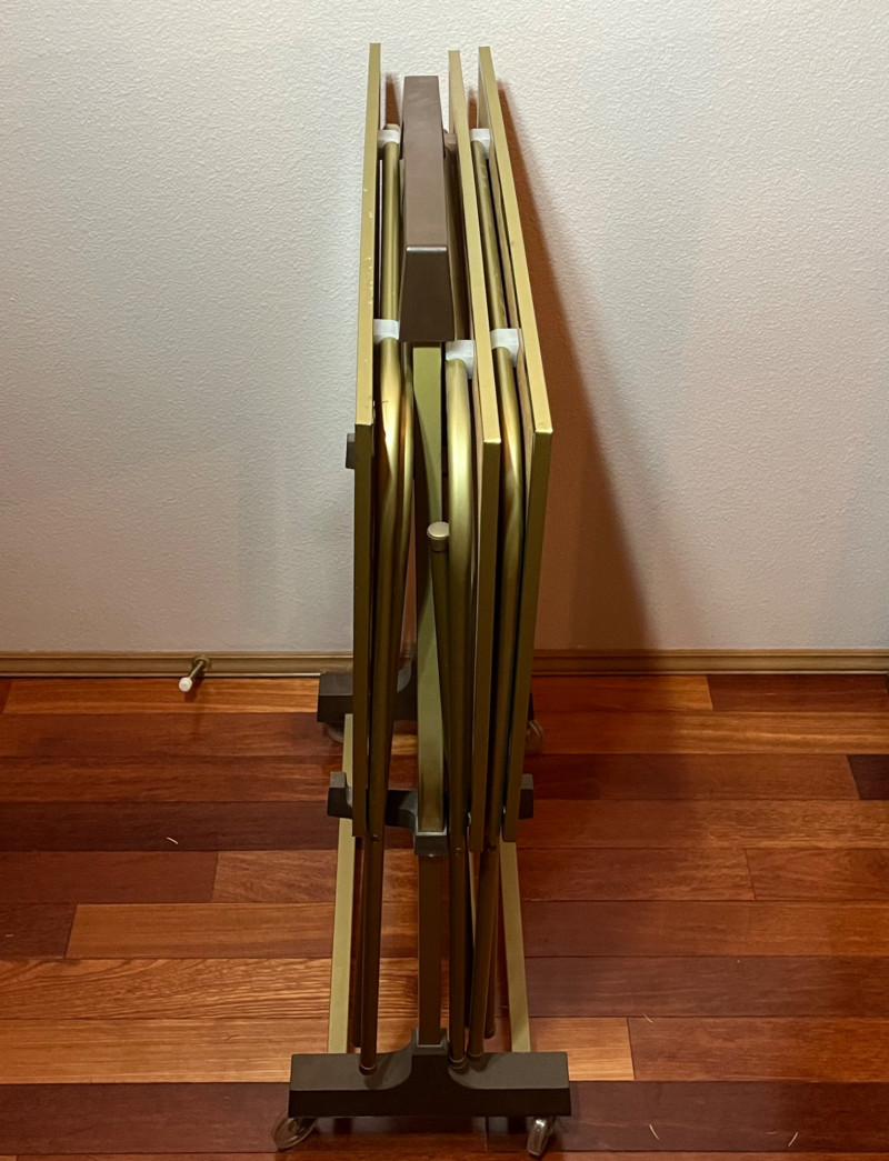 Lot # 82 - Set of 3 Mid-Century Wood Tone and Brushed Brass TV Trays with Rack