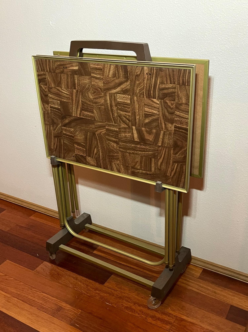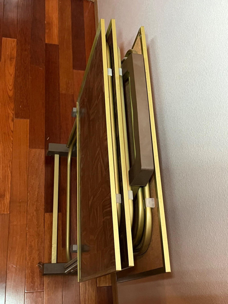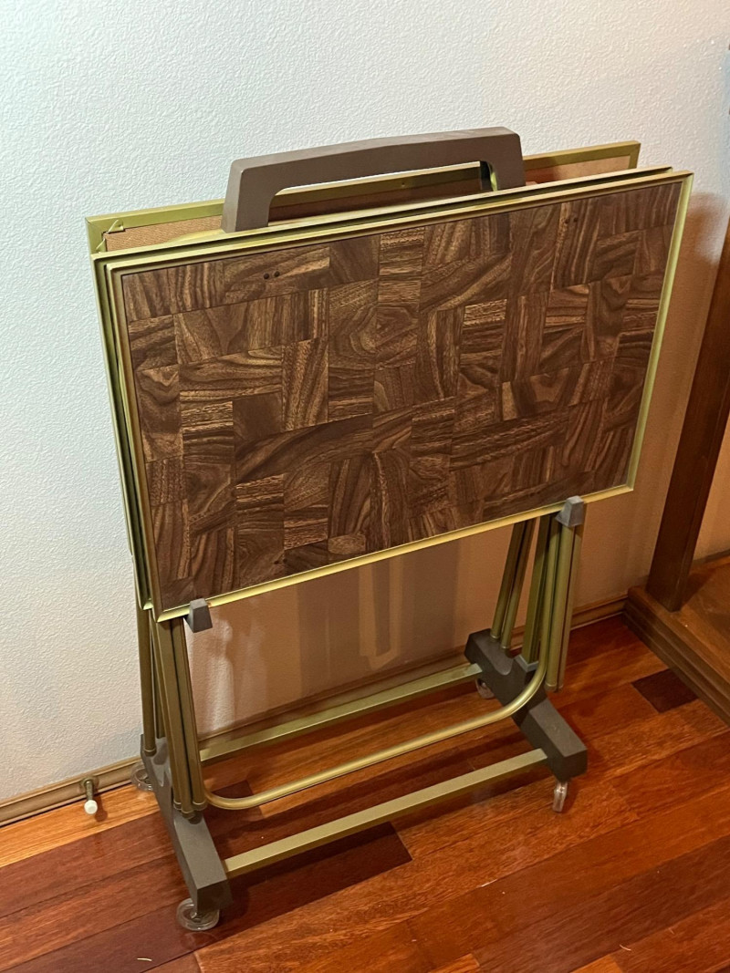 Set of 3 Mid-Century Wood Tone and Brushed Brass TV Trays with Rack All are in good condition.