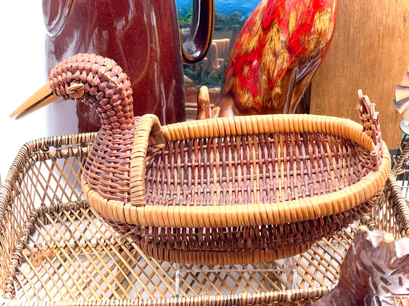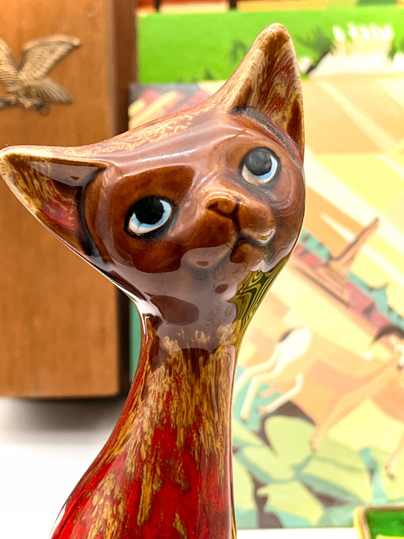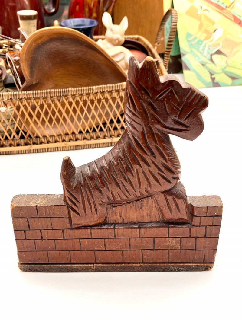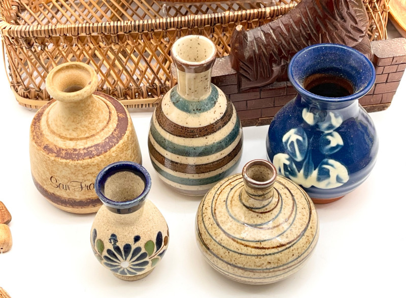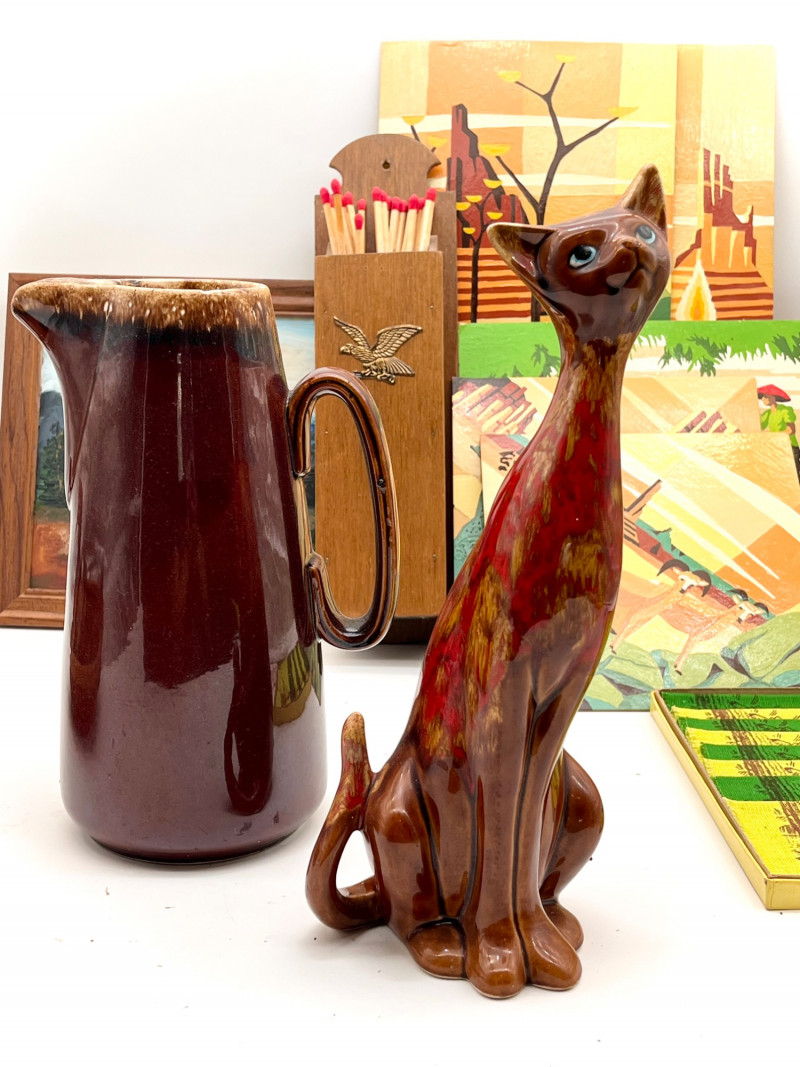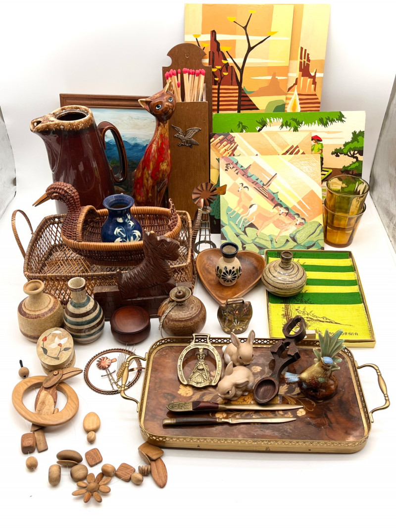 Vintage Earthtones Home Decor and Knick Knacks Lot this fun collection includes various backets, vintage cloth napkins, a Scottie dog door stop, multiple stoneware bud vases, and even a vintage drip glaze ceramic cat! If you're a fan of mid-century through the 1970's, this lot was created just for you!