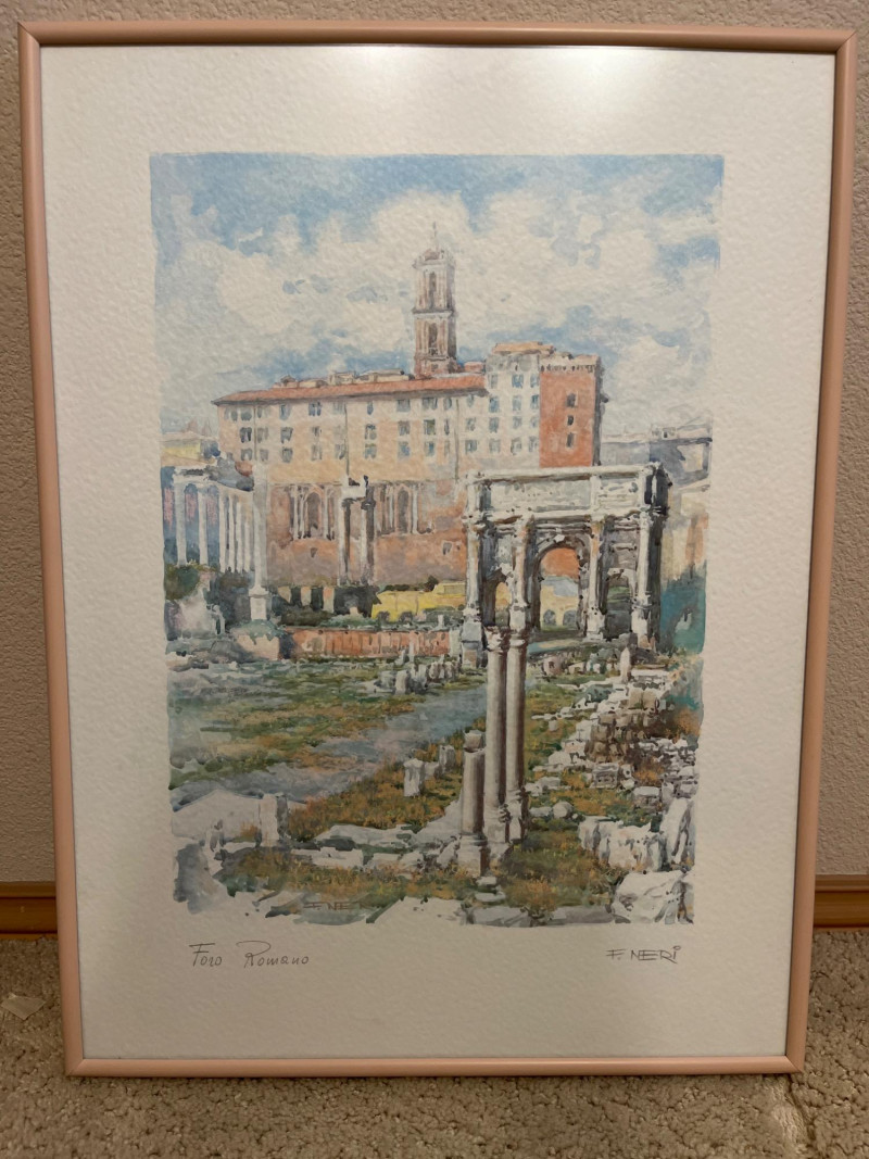 Professionally Framed Artist Signed 1980's Art Gold framed (floral) piece measures 34.5" wide and 27.5" tall. Pink framed (building) piece measures 18.5" tall and 14" wide.
