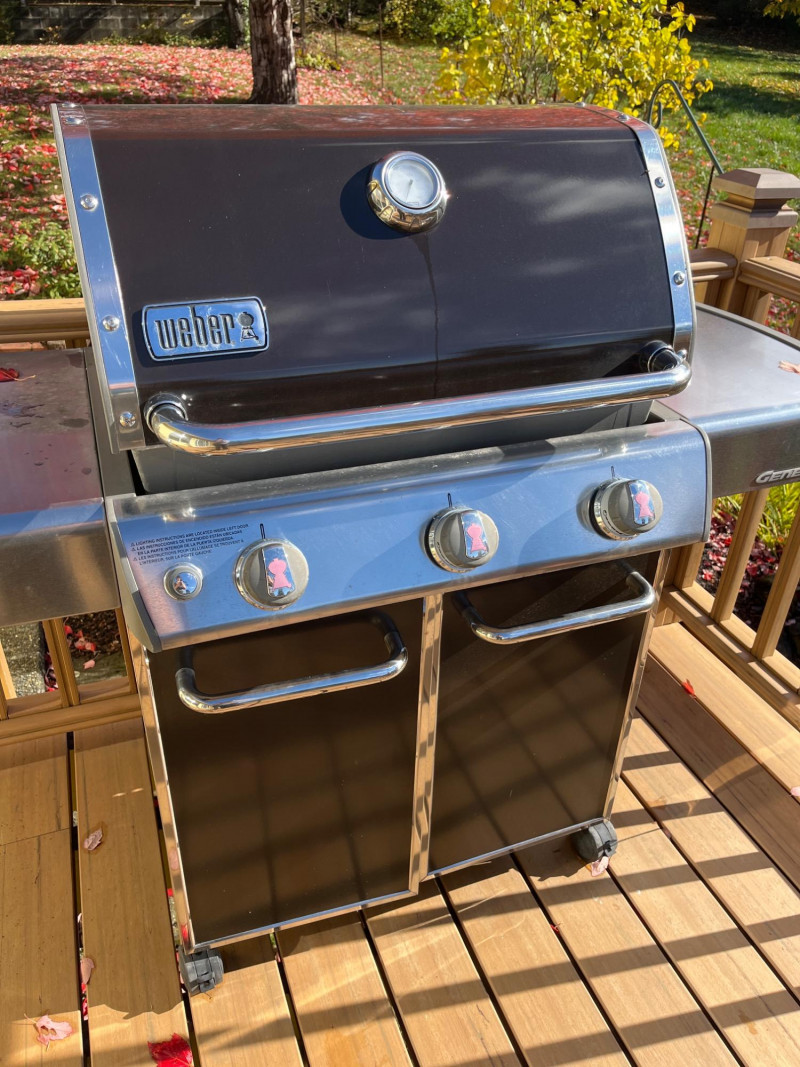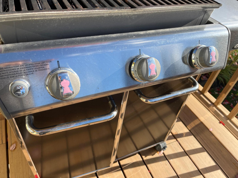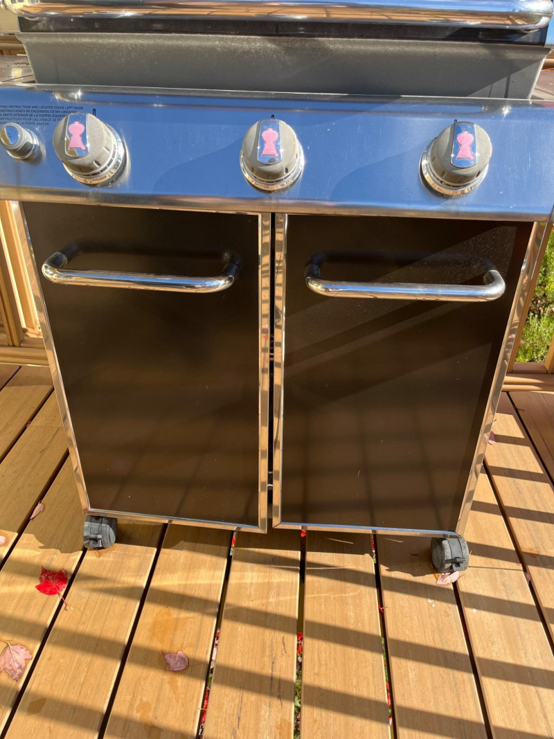 Weber Gas Grill with Cabinet and Side Tables Grill area is 27" x 20". No propane tank and has not been tested.