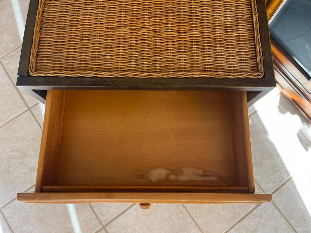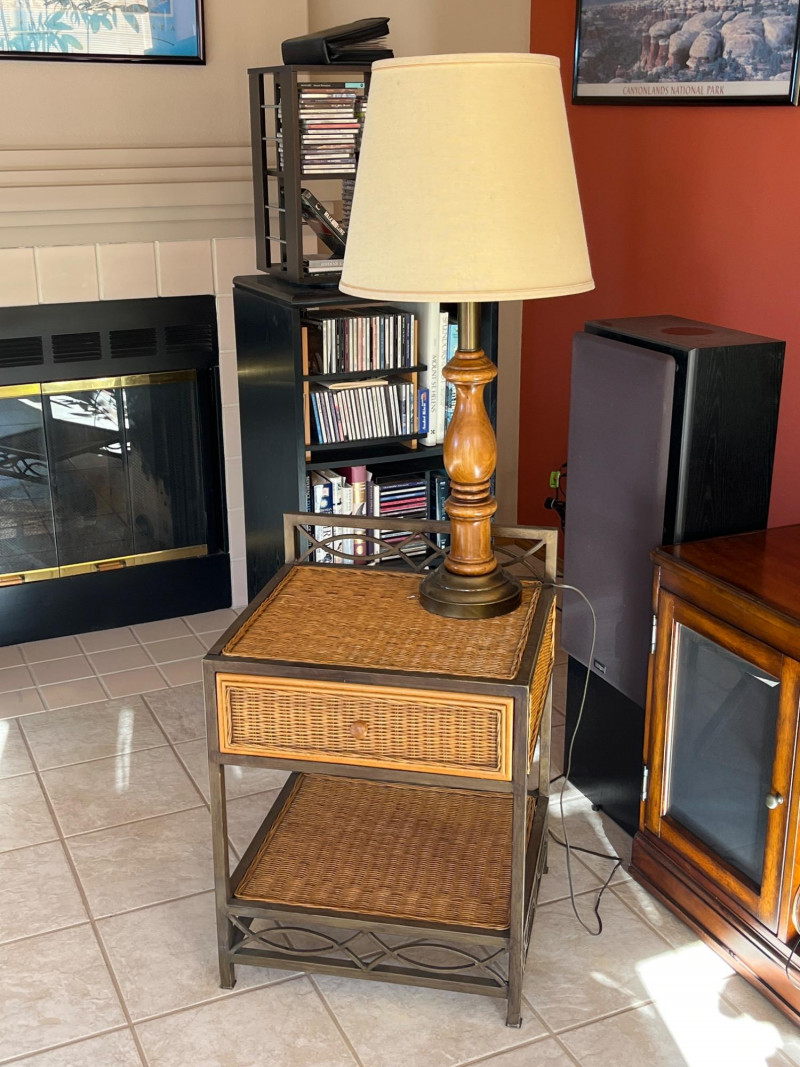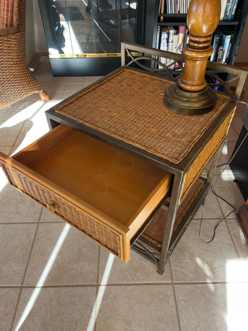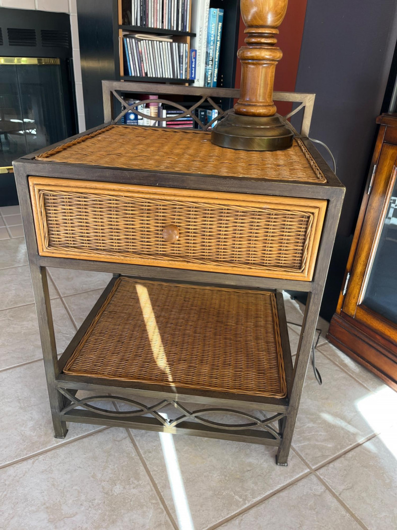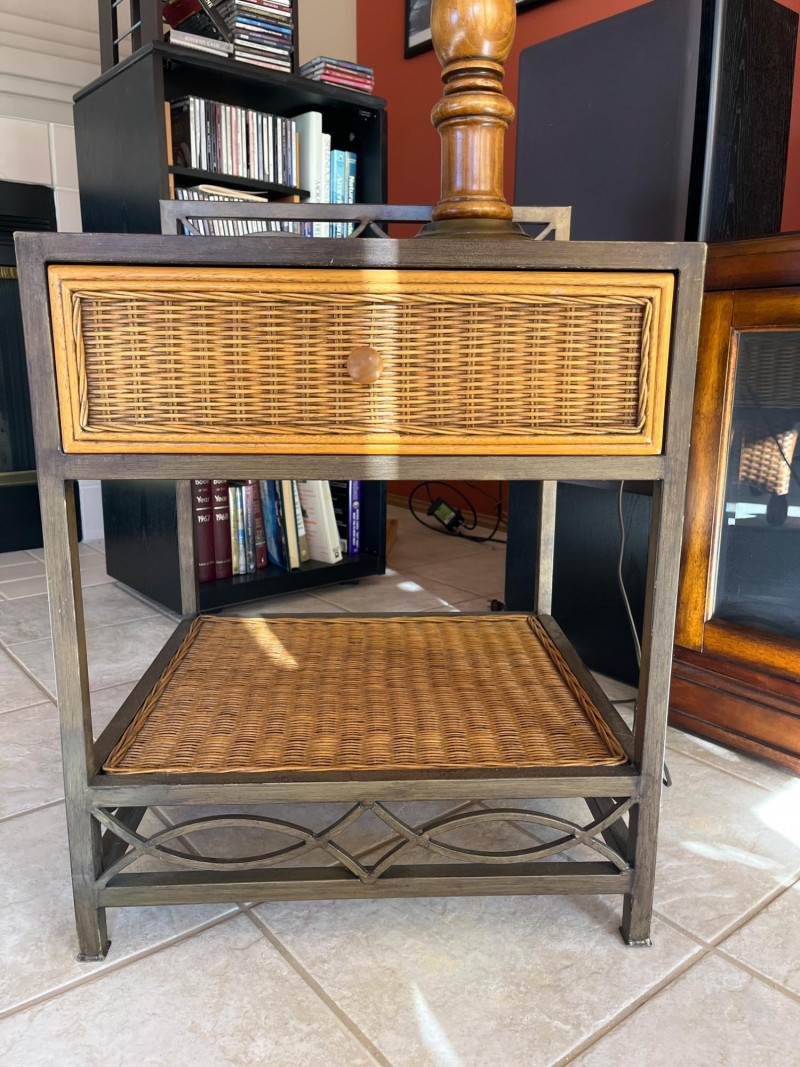 Metal and Wicker Table with Wood and Brass Lamp Lamp is 35" tall Table is 24" tall, 18" wide and 20" deep. There is a water stain inside the bottom of the drawer, shown in photos.