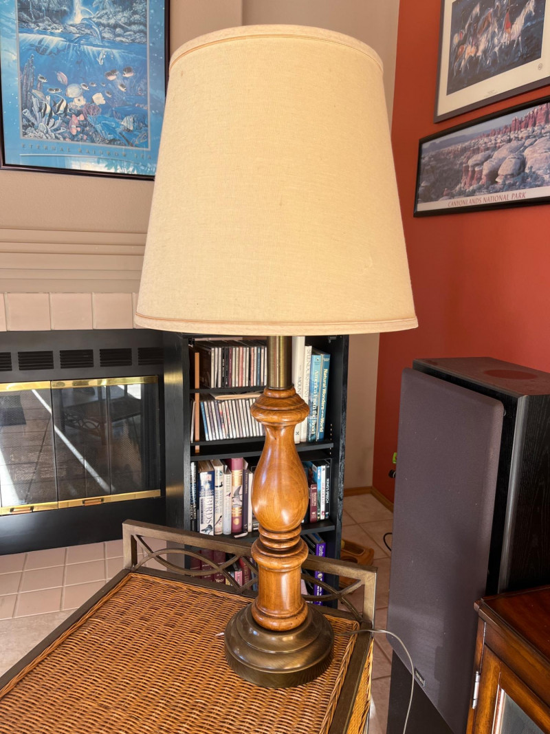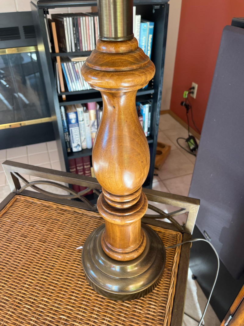 Lot # 96 - Metal and Wicker Table with Wood and Brass Lamp