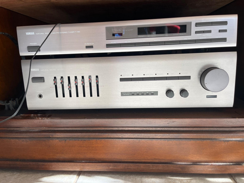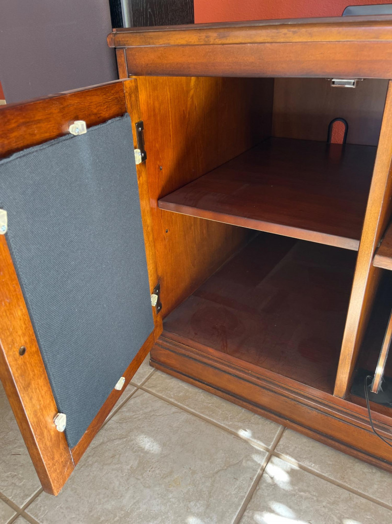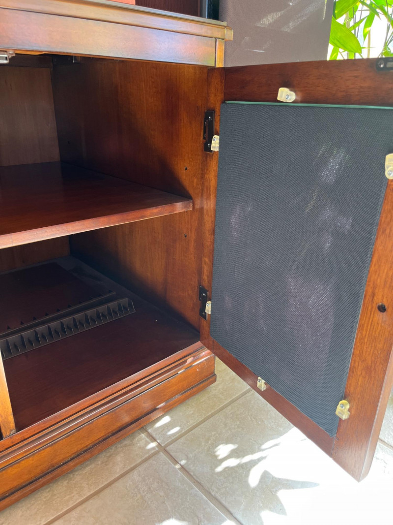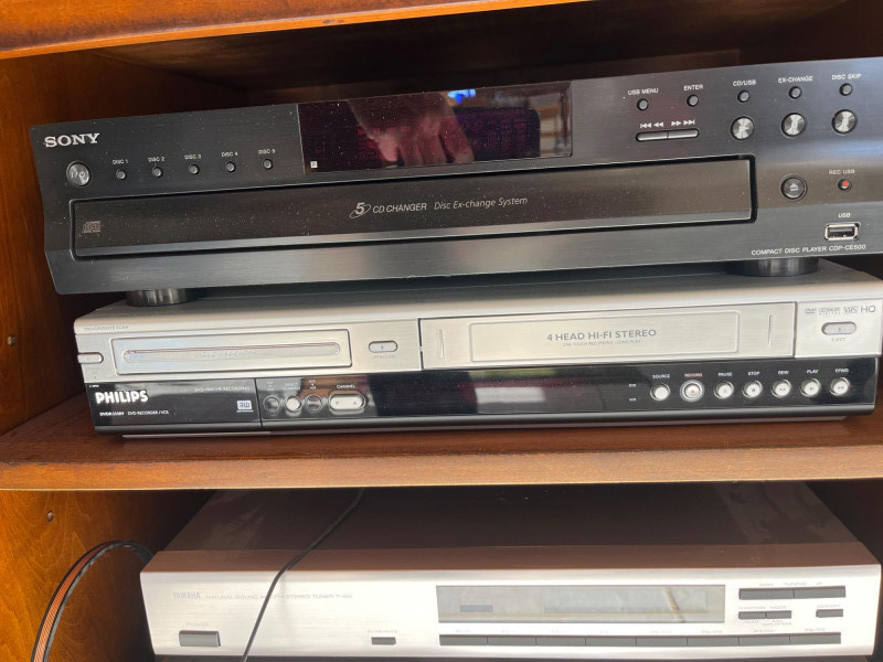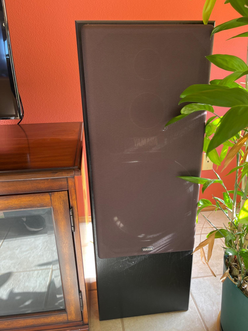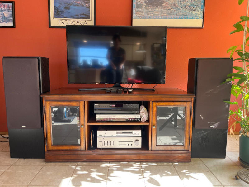 48" Samsung TV with Yamaha Tuner/Speakers, DVD and VCR This lot comes with the cabinet, 48" Samsung TV, Yamaha tuner with speakers, Philips VCR/DVD player, and Sony 5 CD Changer. All connecting wires and power cords included. Measurements: Speakers are 40" tall Cabinet is 57" wide and 24" deep.