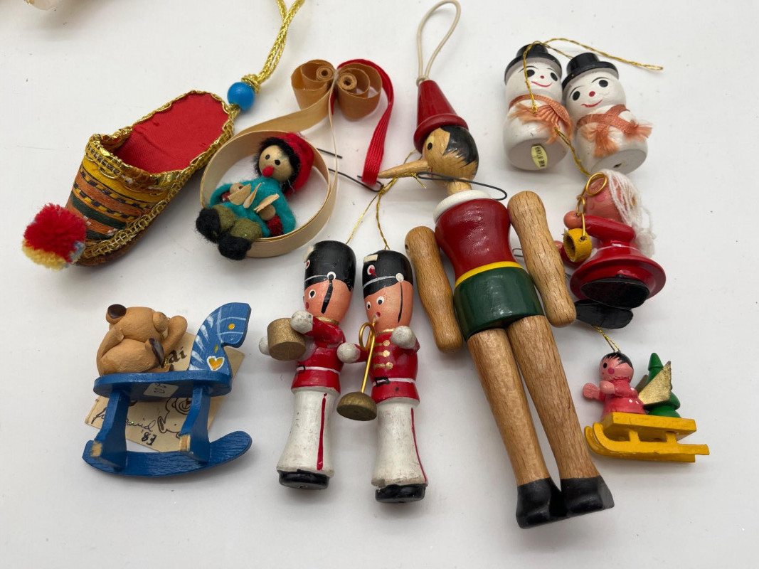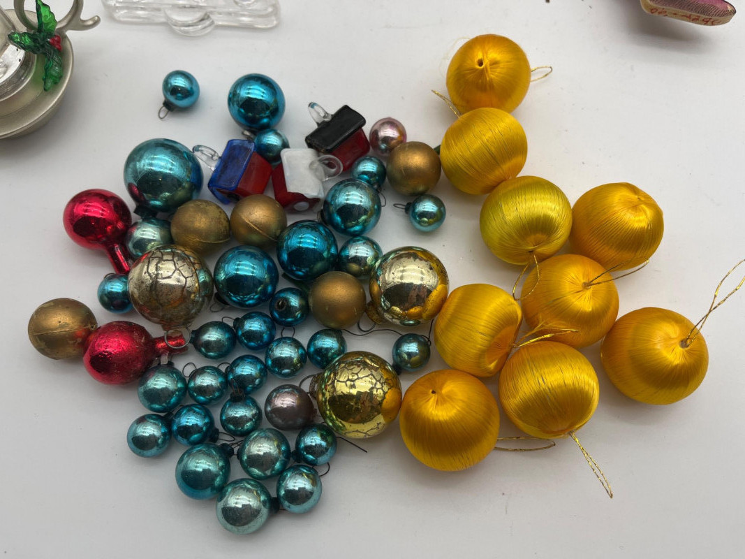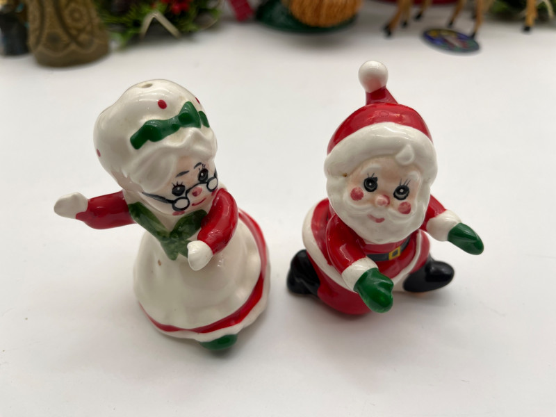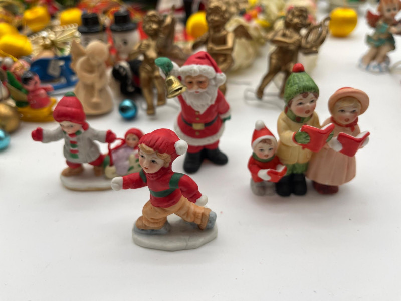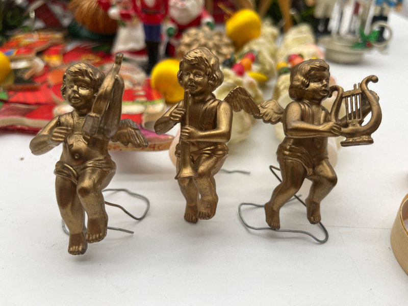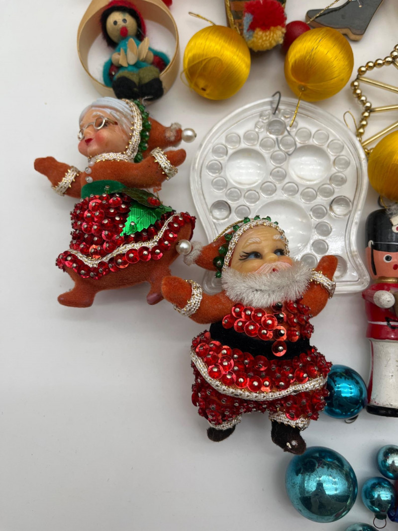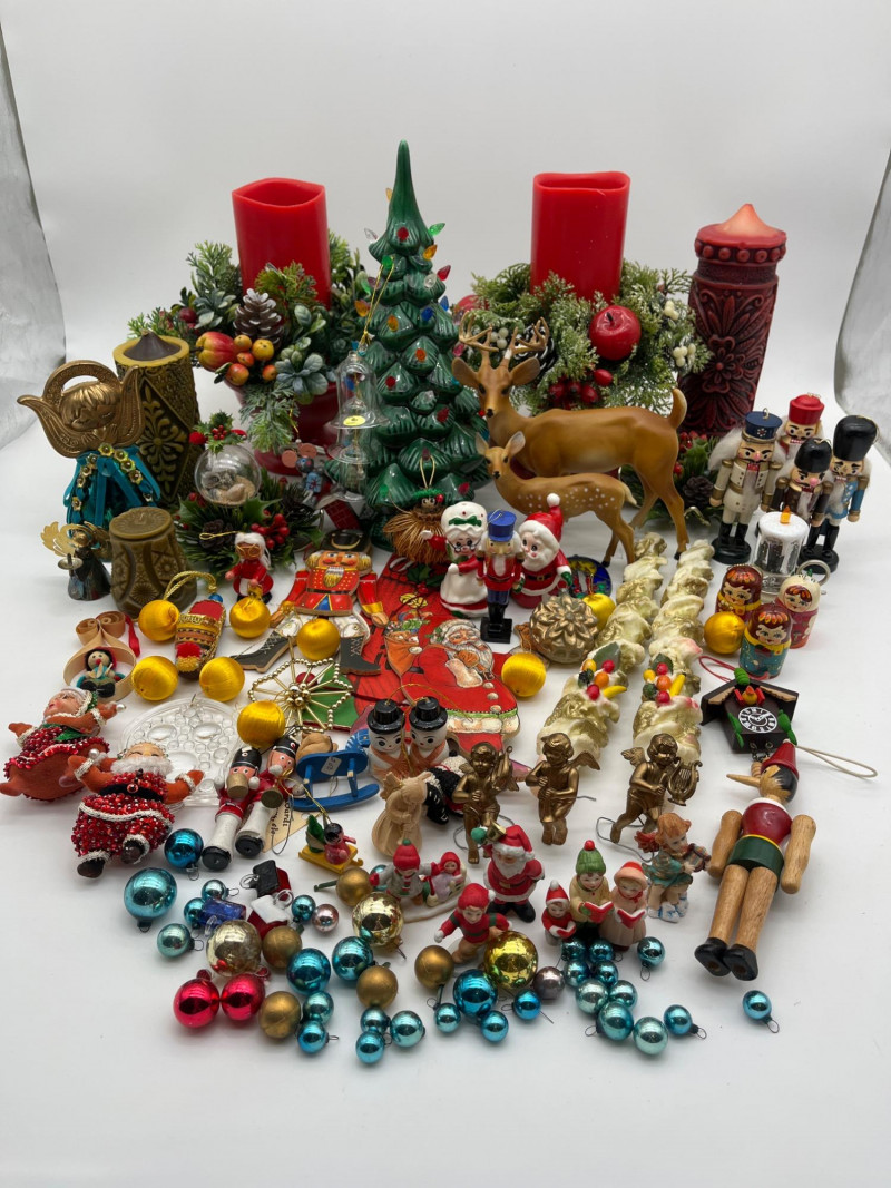 Vintage Christmas Lot Featuring Ceramic Tree with Lights This lot is packed full of vintage Christmas decorations and ornaments. A few highlights include a ceramic tree with lights, miniature Lefton ceramic figurines, molded tapered and pilar candles, wooden nutcracker and other ornaments, and much more! Tree with lights measures approximately 12" tall.