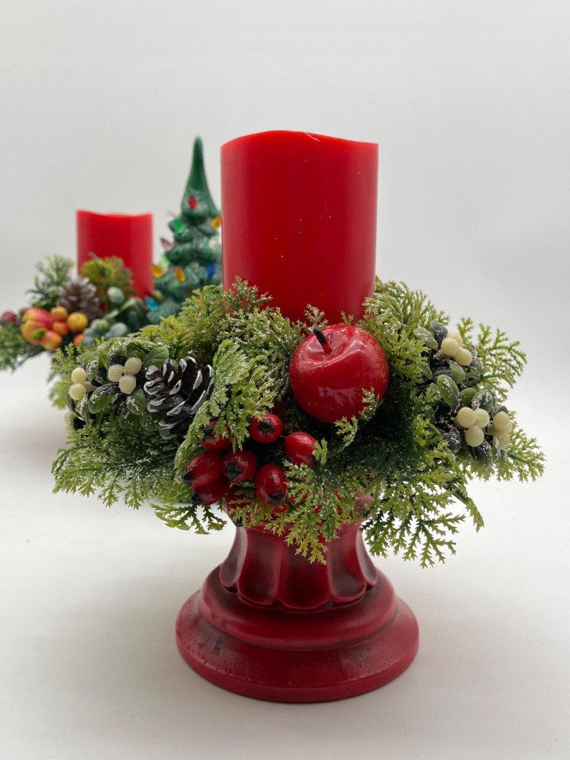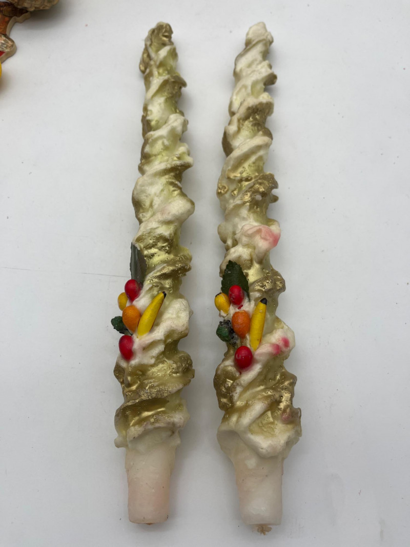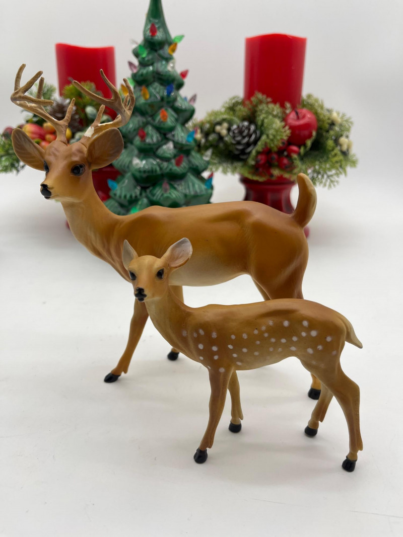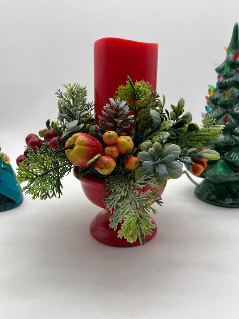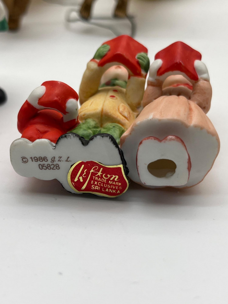 Vintage Christmas Lot Featuring Ceramic Tree with Lights This lot is packed full of vintage Christmas decorations and ornaments. A few highlights include a ceramic tree with lights, miniature Lefton ceramic figurines, molded tapered and pilar candles, wooden nutcracker and other ornaments, and much more! Tree with lights measures approximately 12" tall.