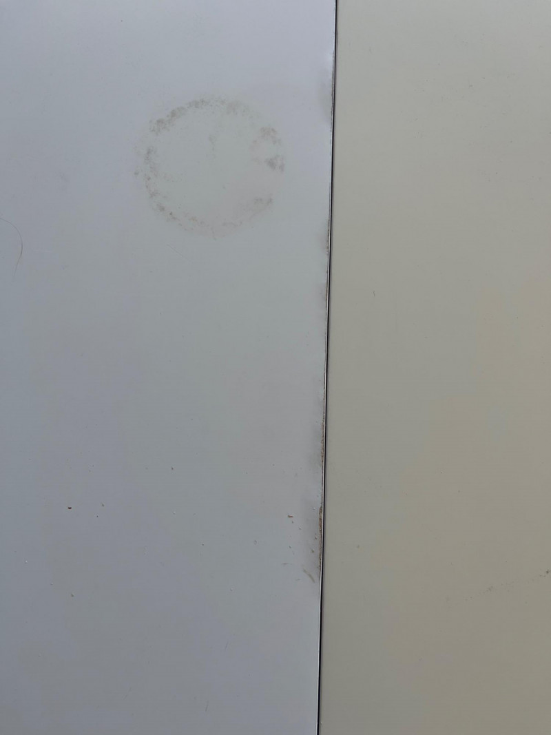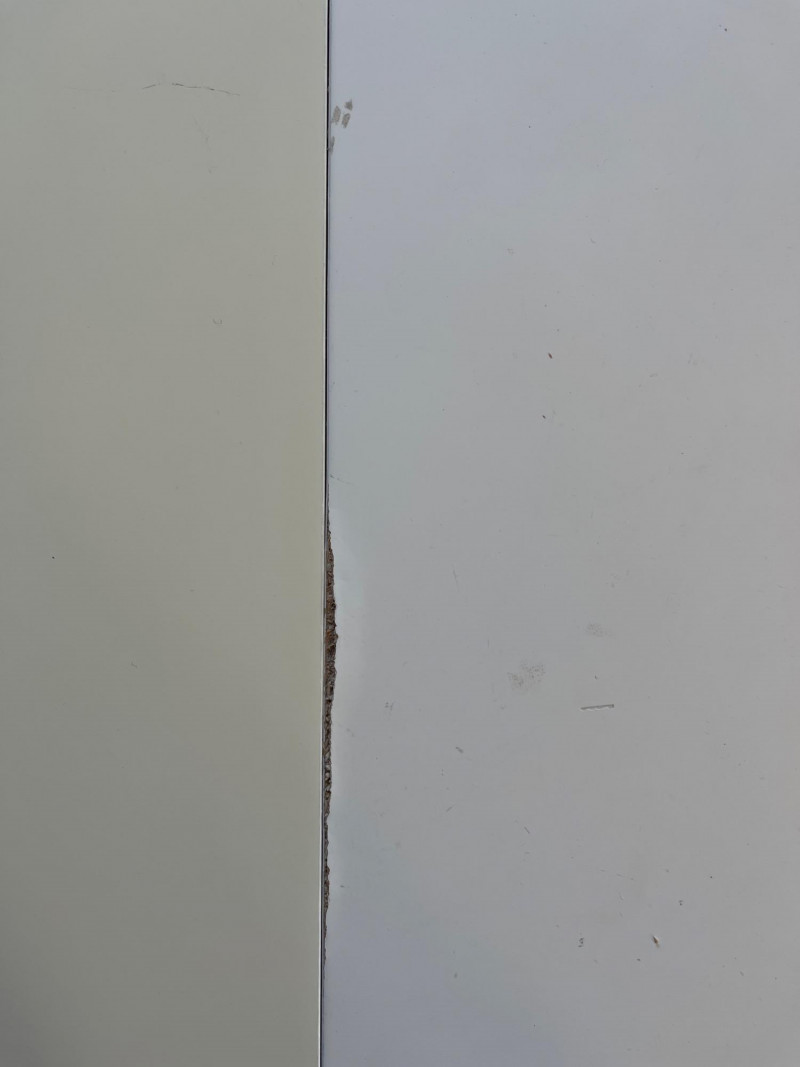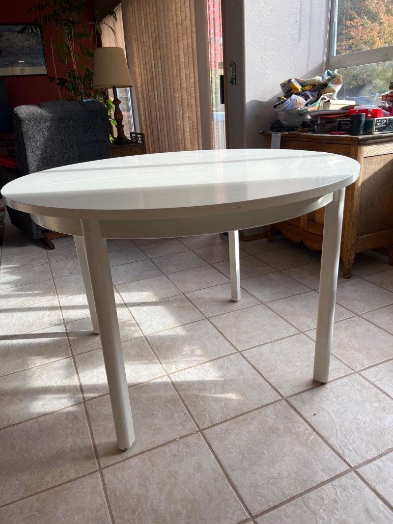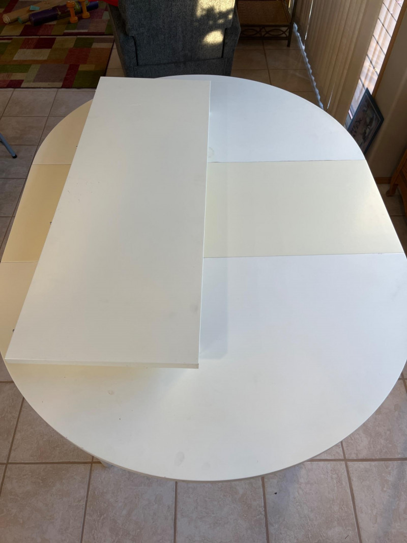 43" Round White Formica Table with Two Extension Leaves Table Great sturdy table for crafts! Both 16" extensions are a faded yellow rather than bright white like the table. There is some damage to the Formica as shown in photos.