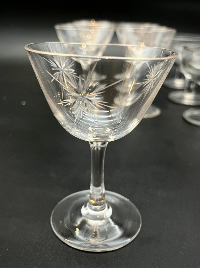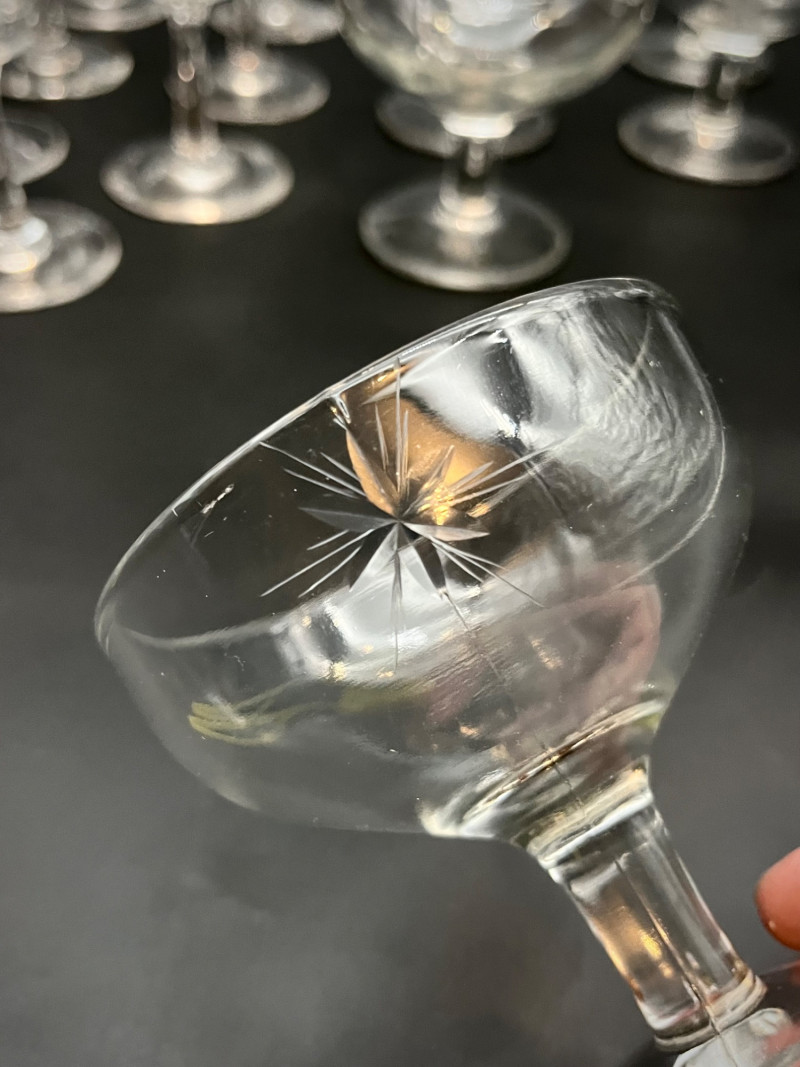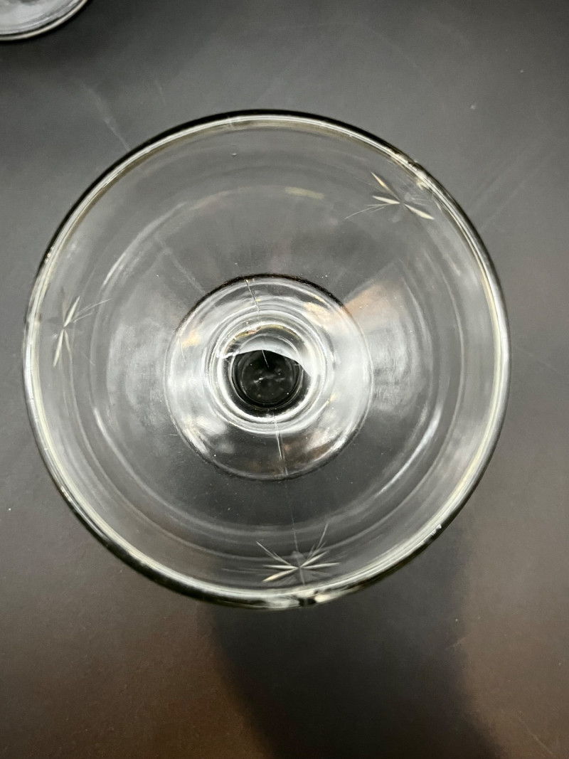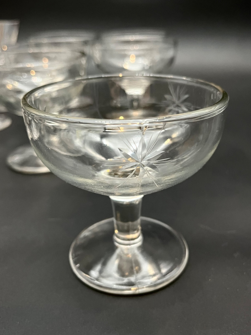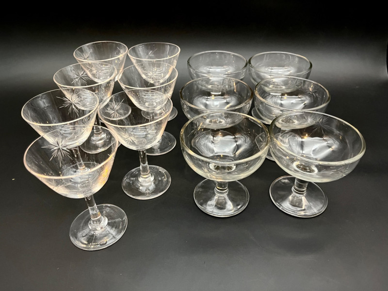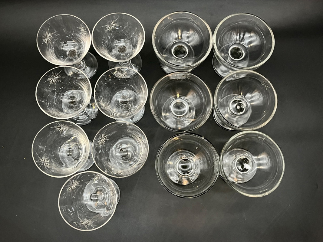 Starburst Design Champagne Glasses The taller six glasses are crystal and of a thinner construction than the shorter six that are pressed glass and thicker. The taller are 4 1/4" tall and the shorter are 3 1/2" tall. One of the taller glasses has a small chip on the rim.