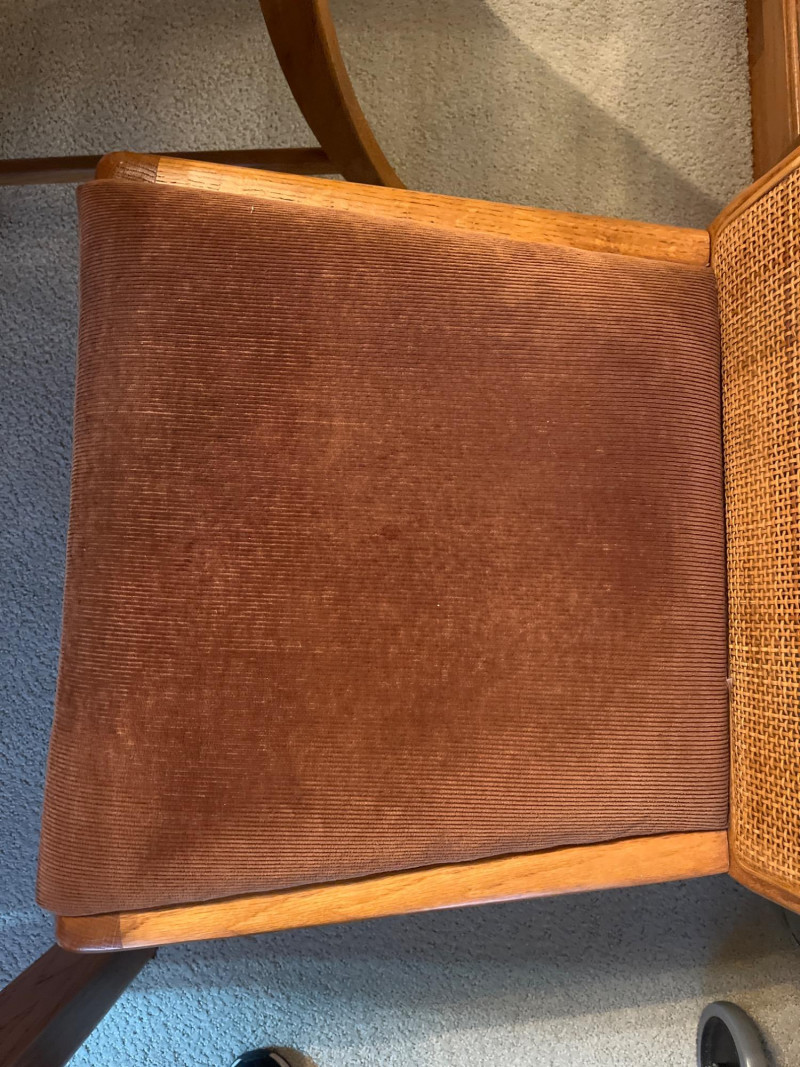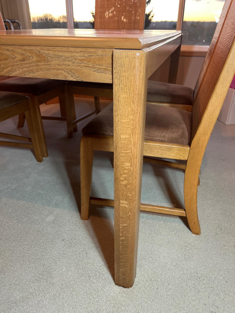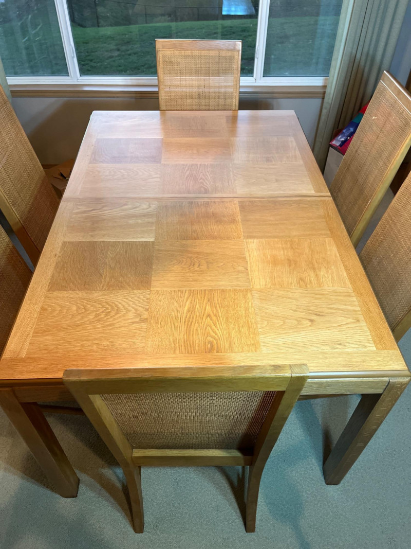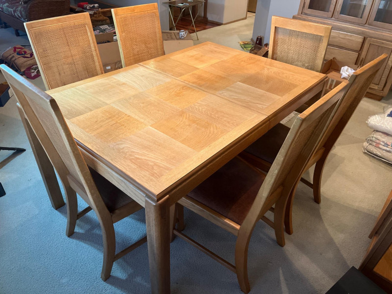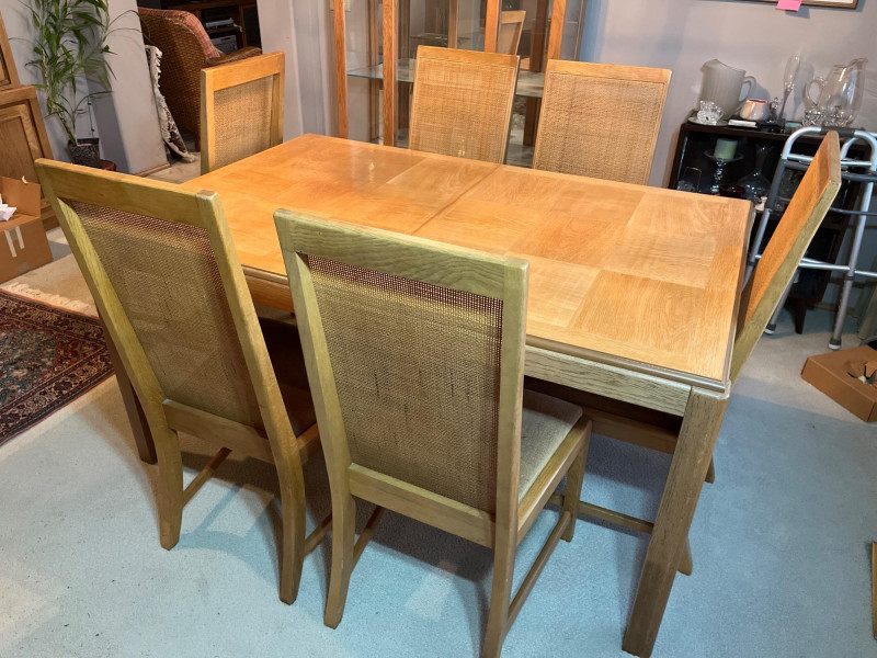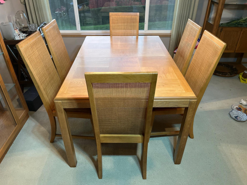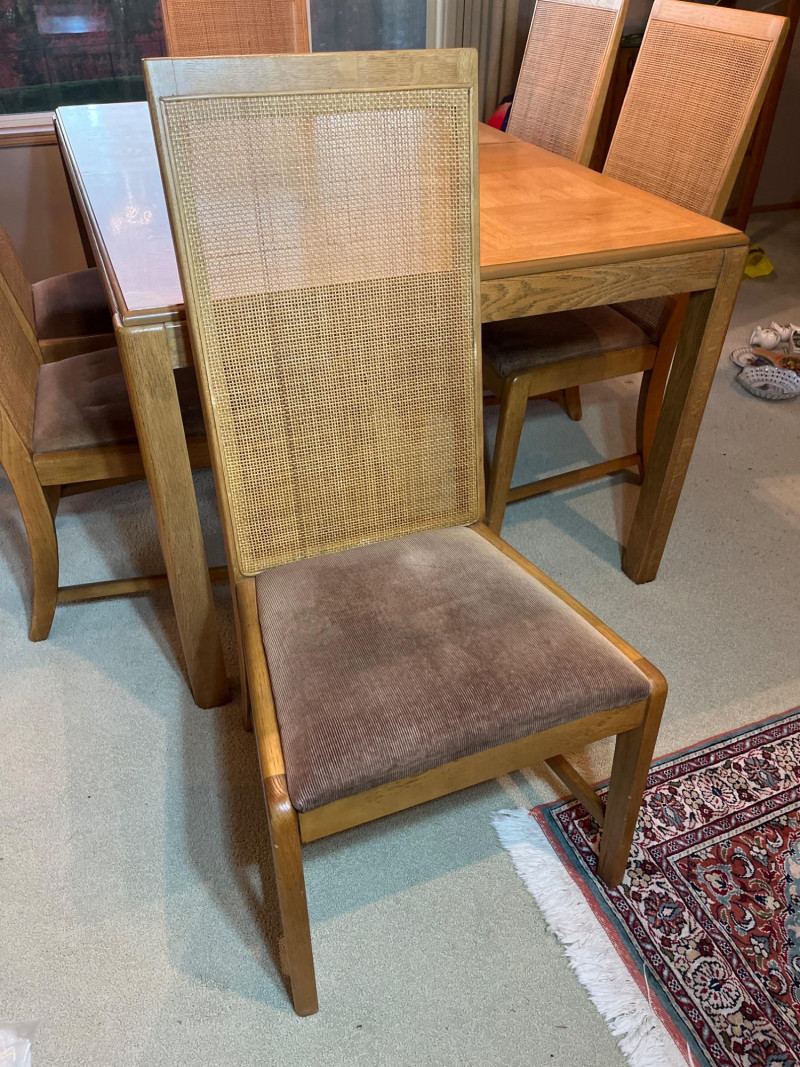 Oak Formal Dining Table with Six Cane Backed Chairs and Two 18" Leaf Extensions Without the extensions, the table is 39" wide and 59" long. The chairs are 40.5" tall at their backs. The cloth seats are all in good condition with no rips or tears but some minor stains that most likely just need a cleaning. The table top is in very good condition.