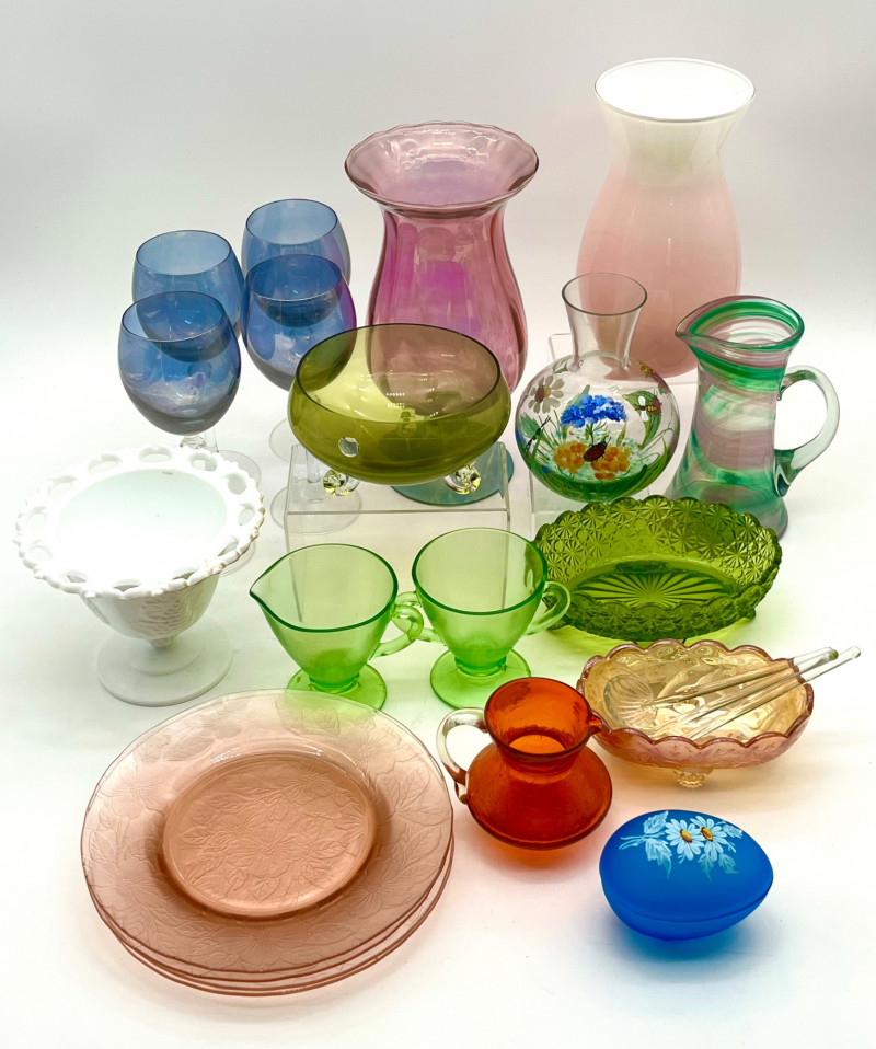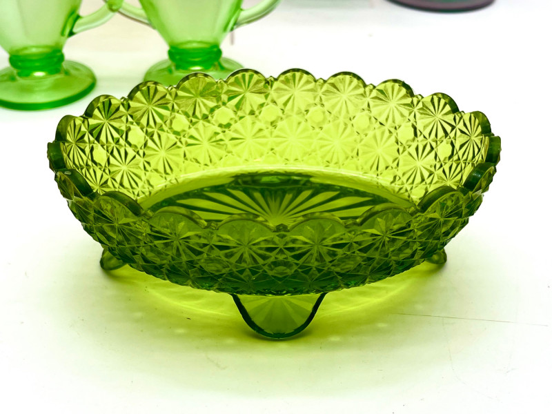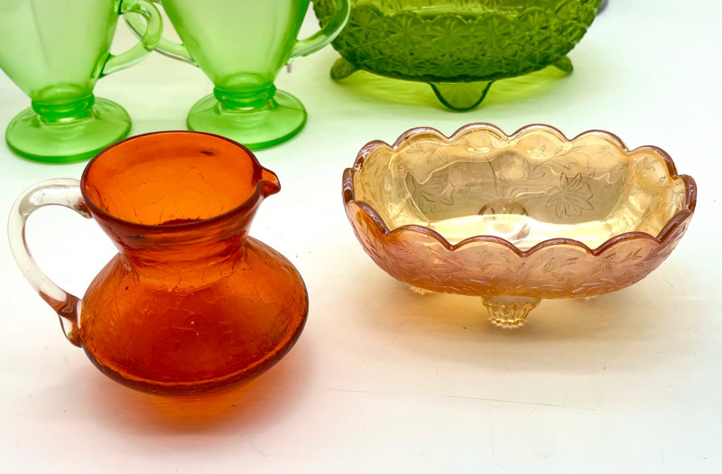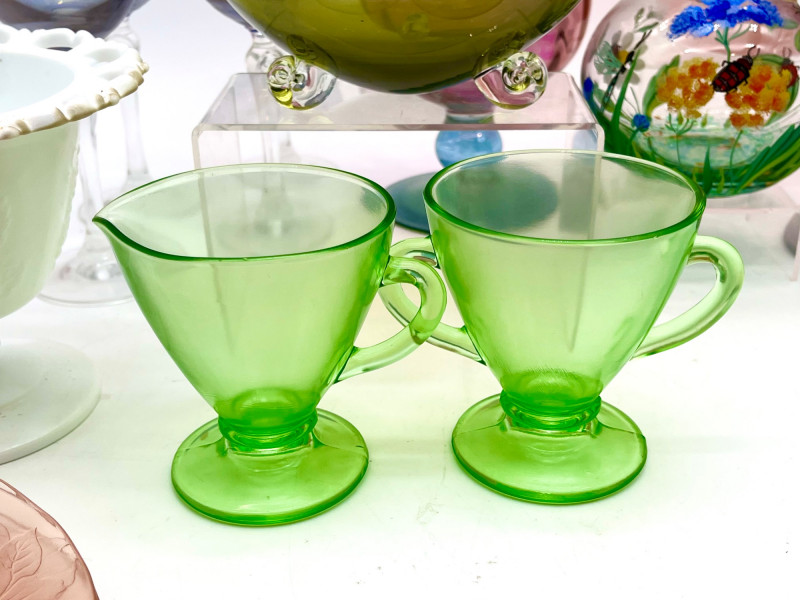 Lot # 7 - Colorful Glass Lot Featuring Uranium Glass Creamer and Sugar Bowl