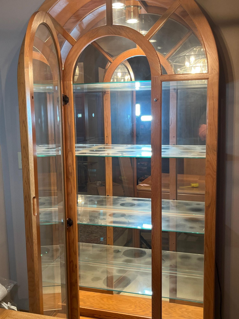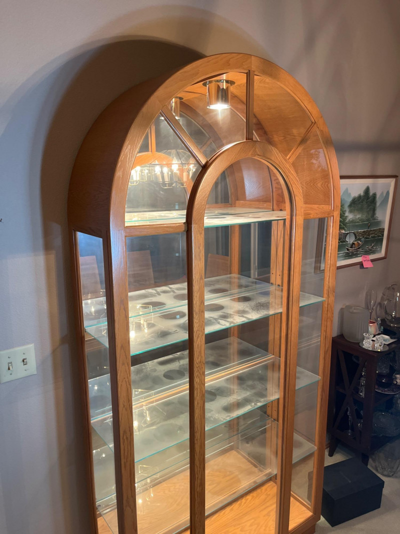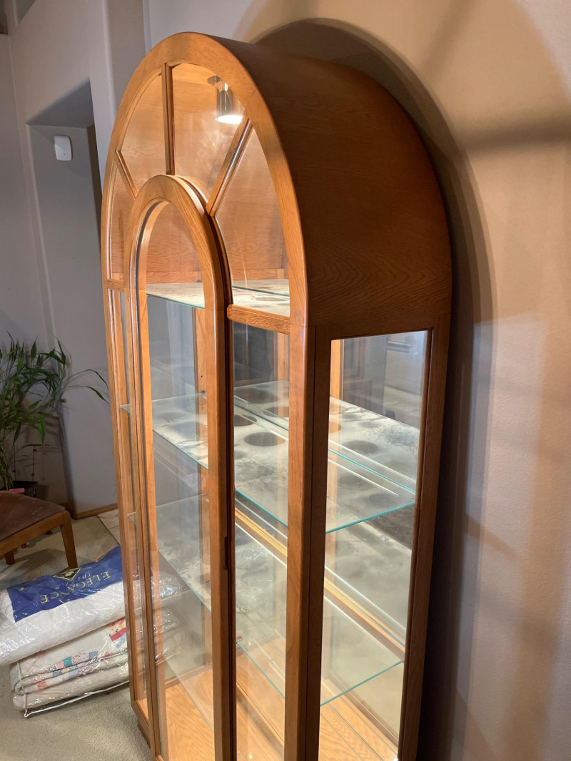 Glass Lighted Oak Curio Cabinet with Four Glass Shelves This is a gorgeous piece from the 1980's. The door opens just in the center and its design and materials make this a much sturdier curio that most I've seen. All of the glass is in excellent condition. Measures 82" tall and 40" wide.