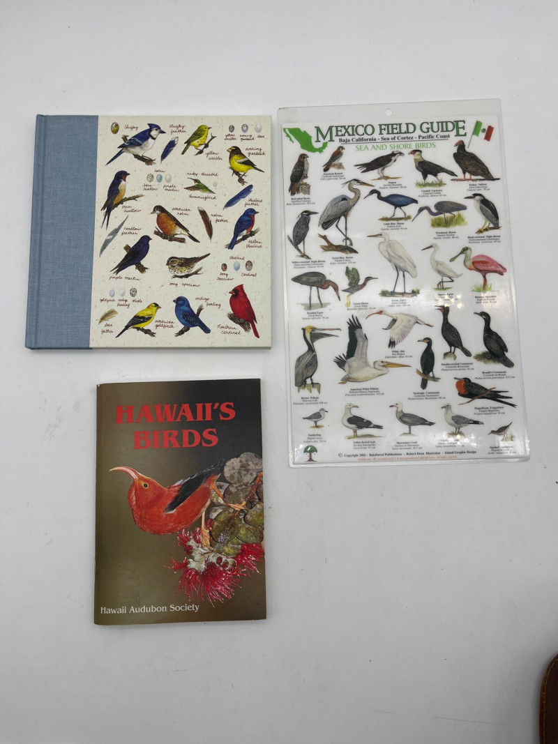 Birdwatchers Lot Featuring Multiple Sets of Binoculars and Books All three sets of binoculars and the monocular have protective cases.