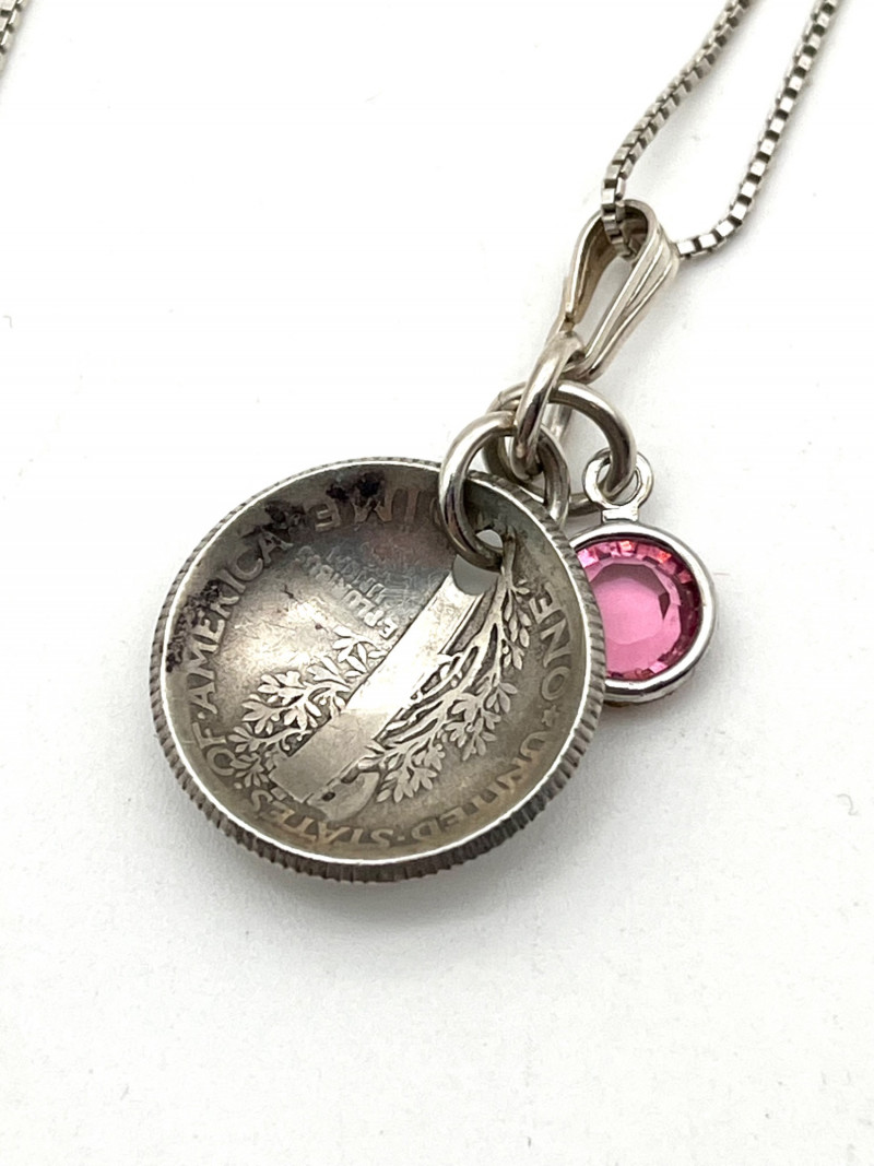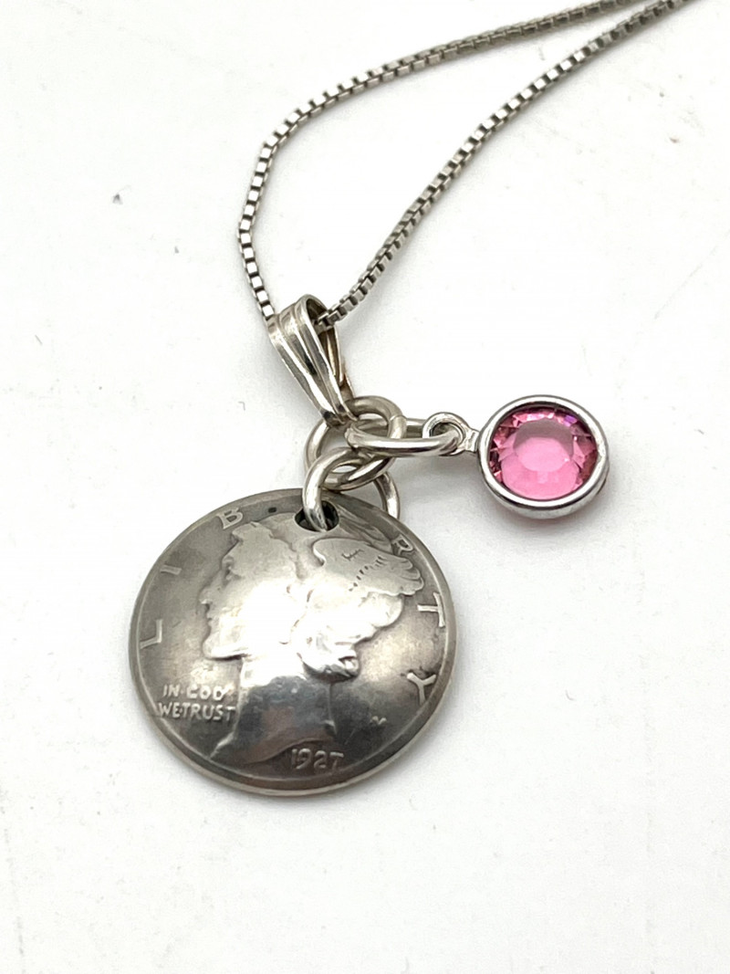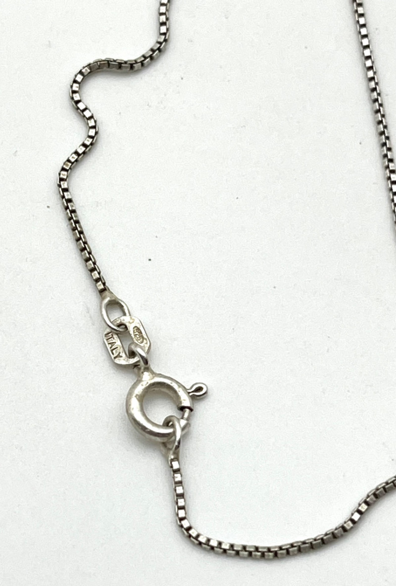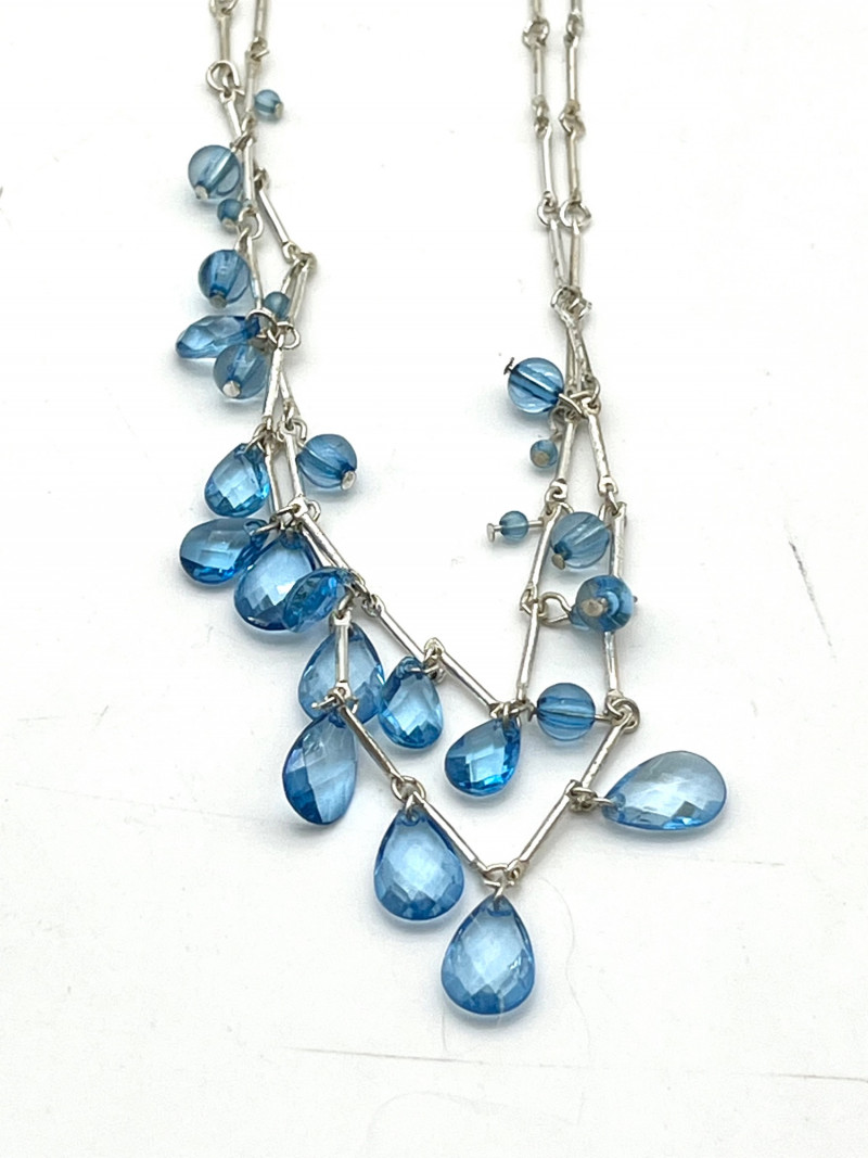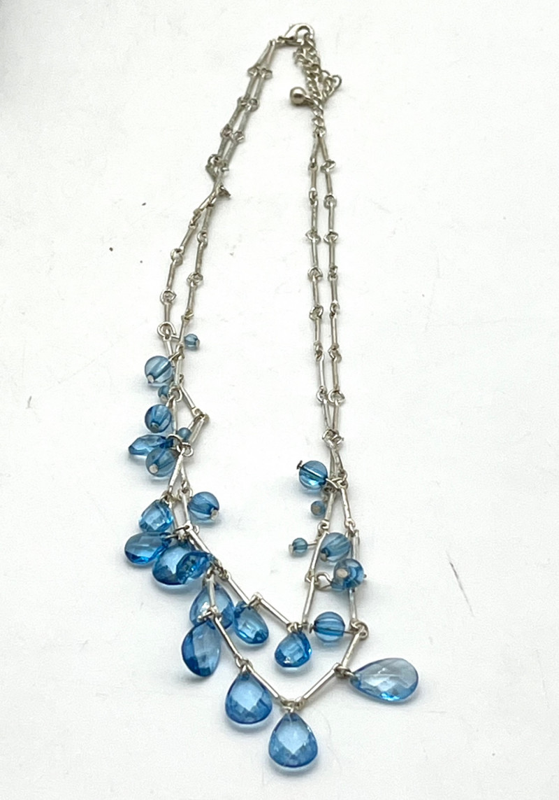 Two Silver Necklaces Silver chain with dime charm is 24" long. Necklace with blue stones is 16" long.
