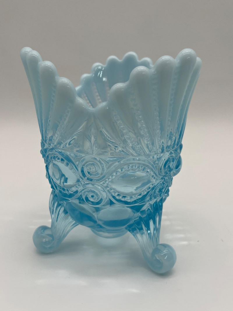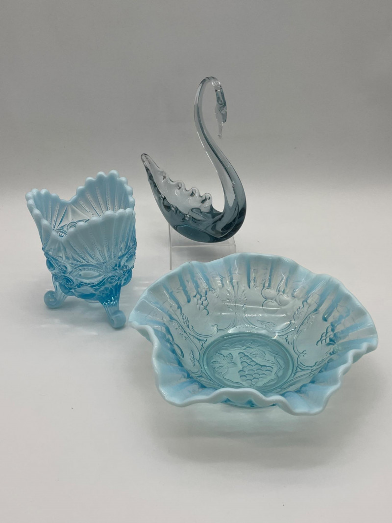 Blue Glass Lot Featuring Fenton Double Crimped Opalescent 9" Ruffle Bowl This lot includes: All three pieces are in good condition with no cracks or chips.