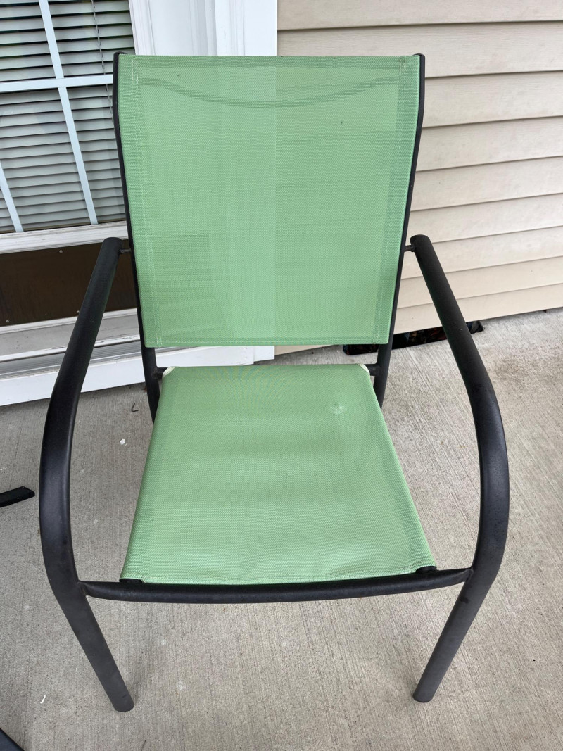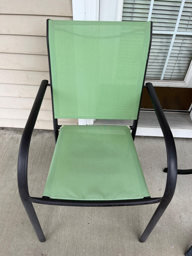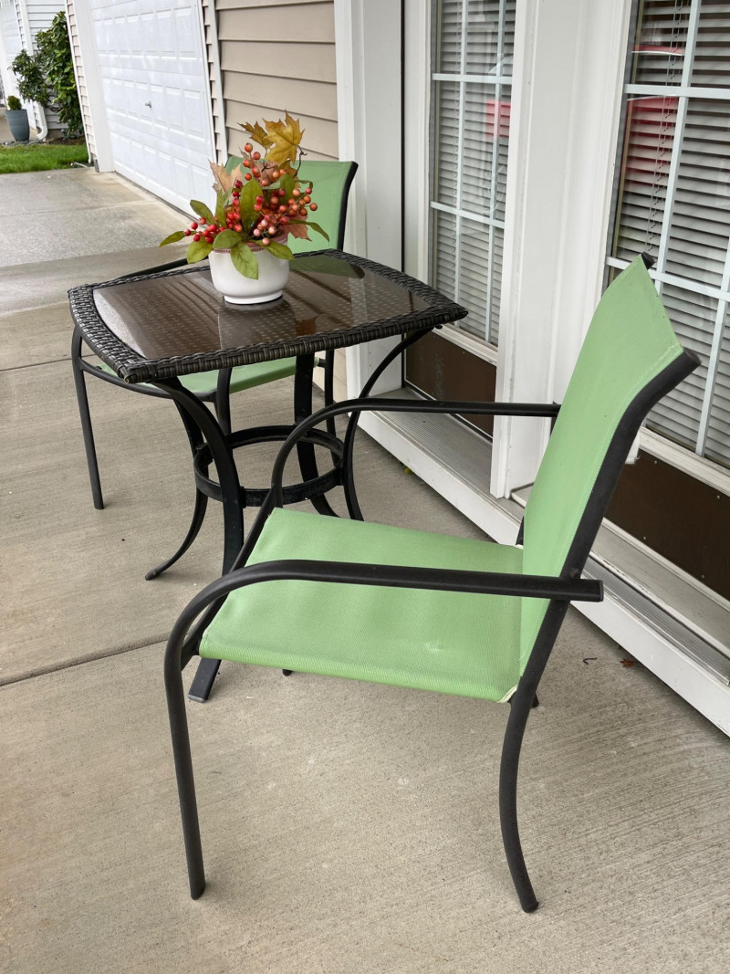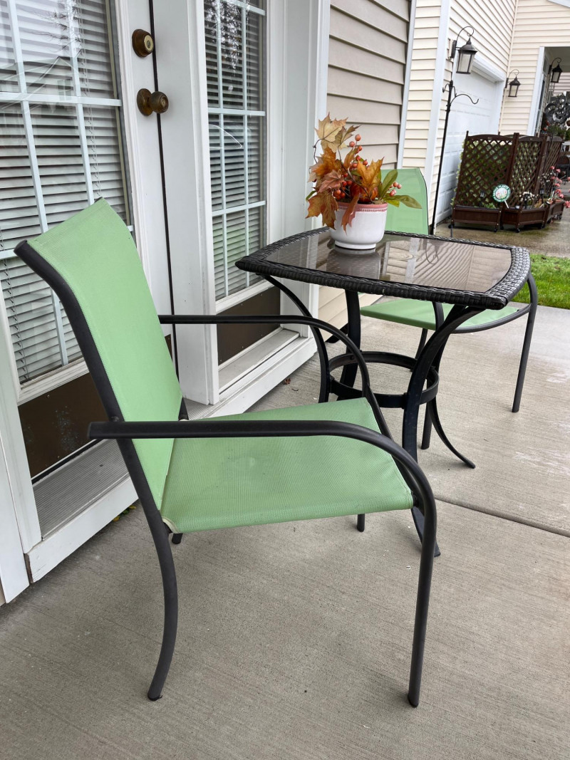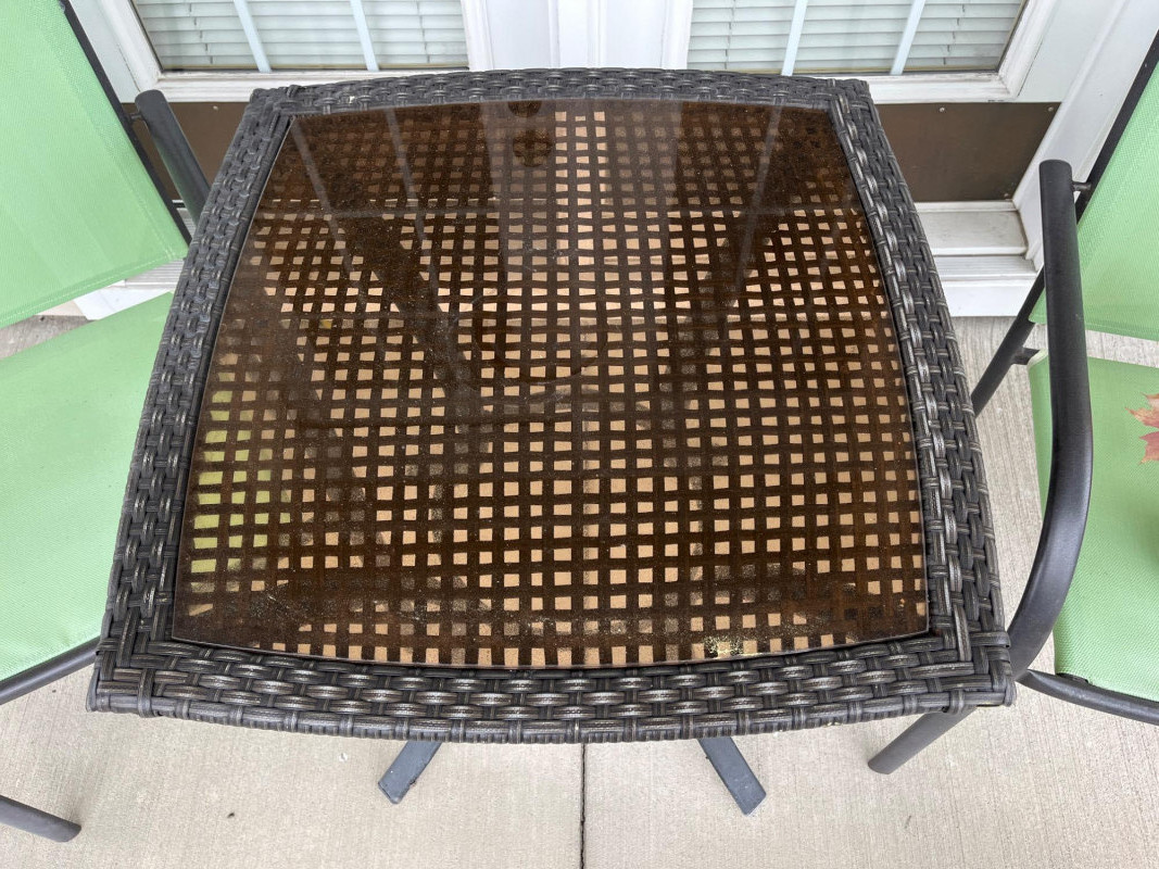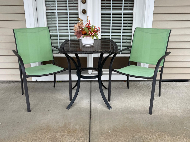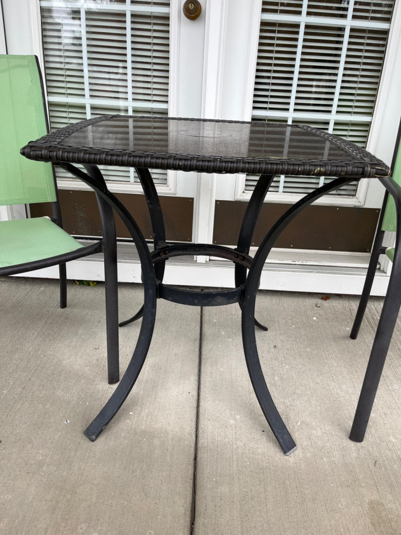 Patio Table and Chairs This is a sweet and simple little patio table and chairs set, perfect for small spaces. They are light weight and easy to move around as needed. Best of all, they're in great condition with no damage seen, just some normal wear.