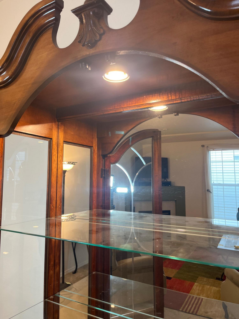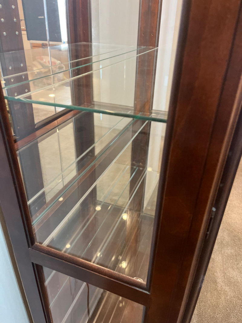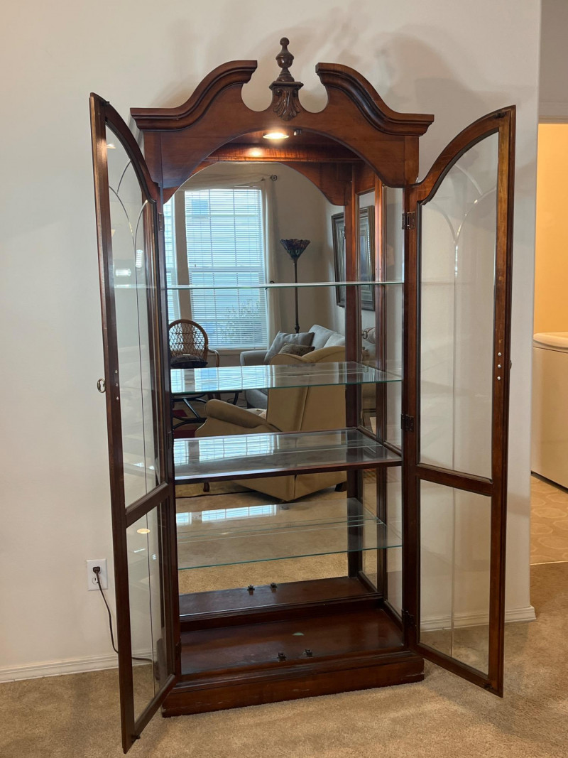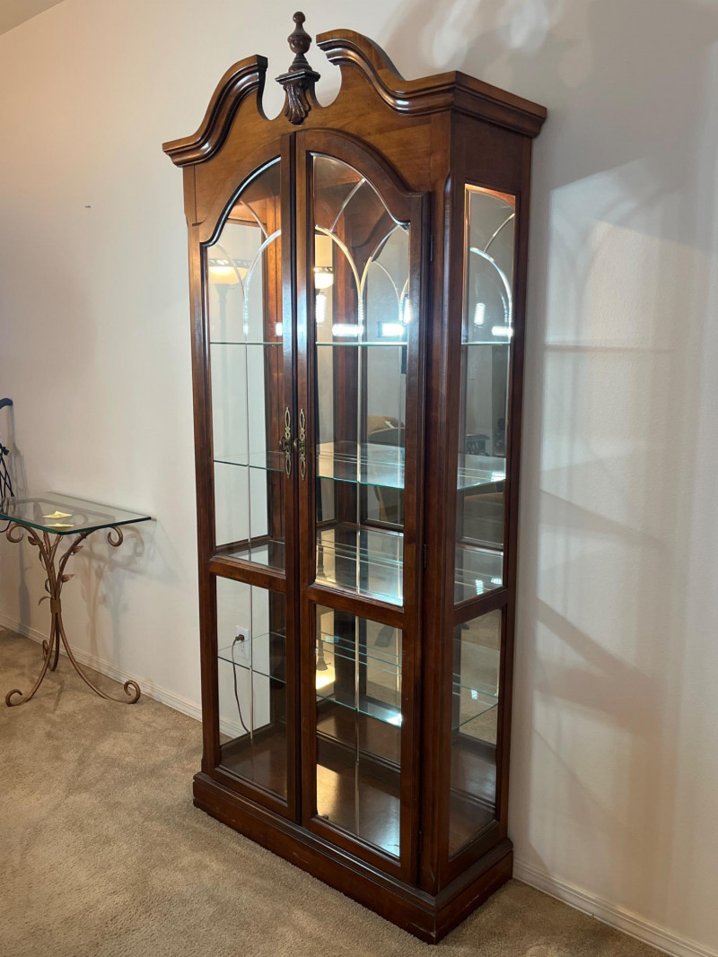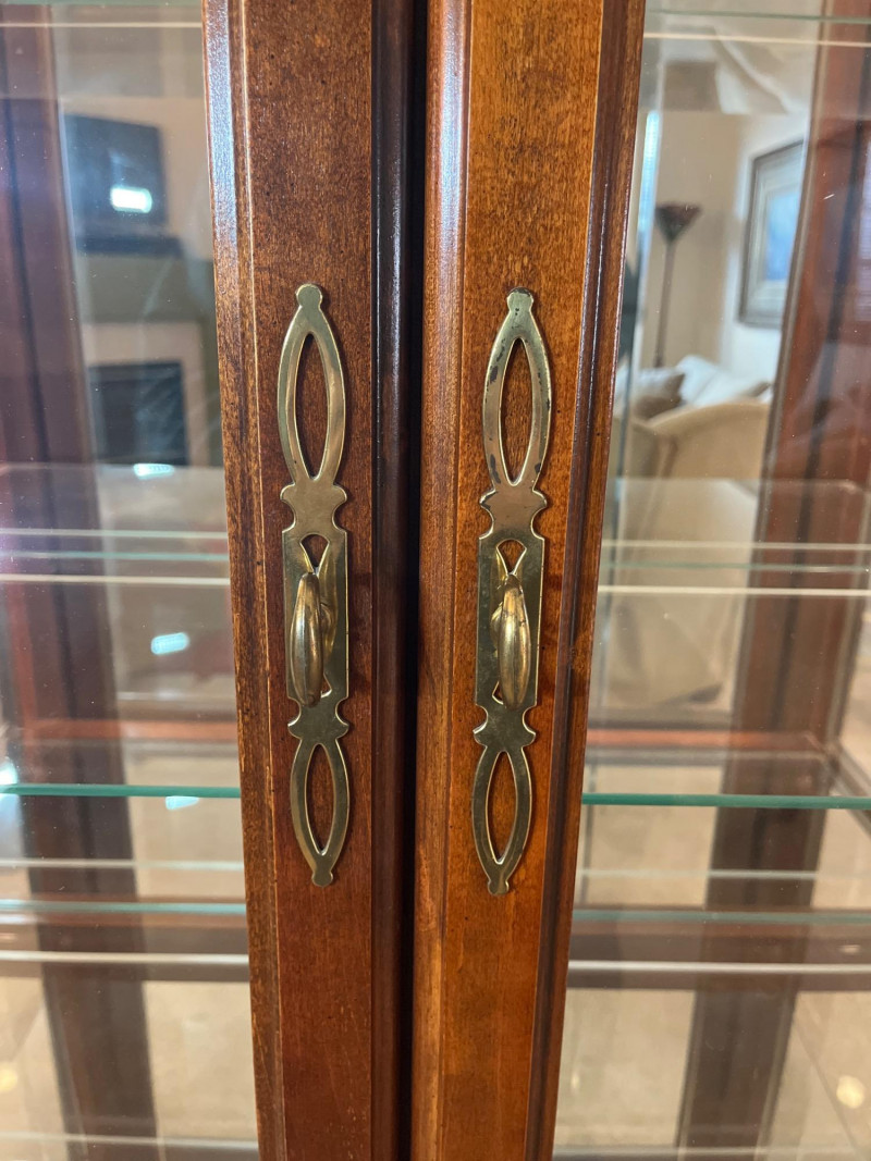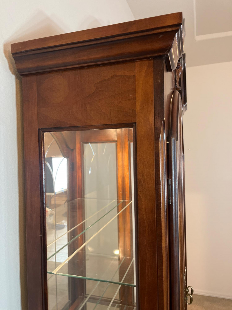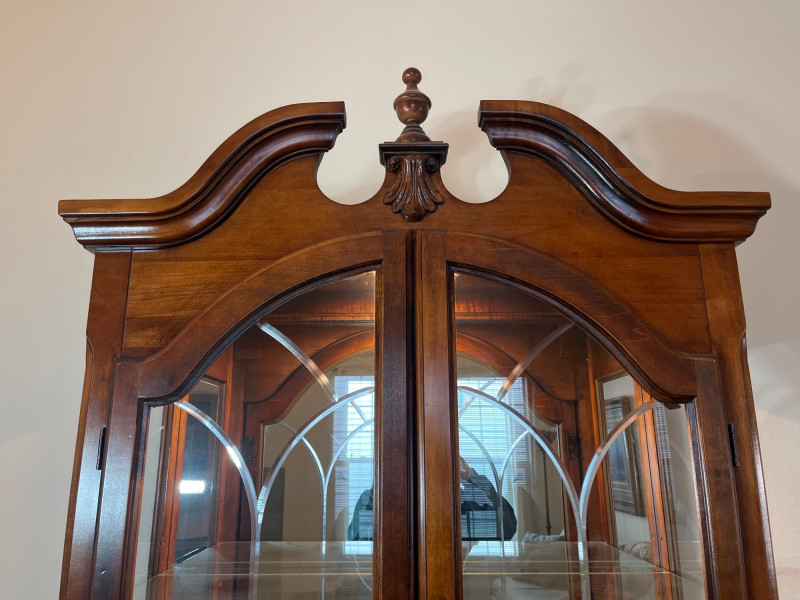 Cherry Wood Curio Cabinet with Beveled Glass Doors & Glass Shelves Stands 82" tall and 33 1/2" wide. In very nice condition with no known damage. A piece like this would easily be the centerpiece of any room and a beautiful way to protect and display your favorite delicate treasures and collectibles.