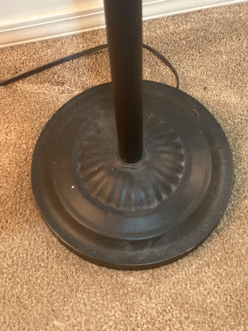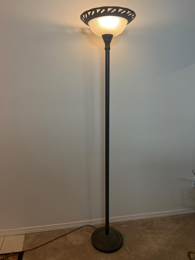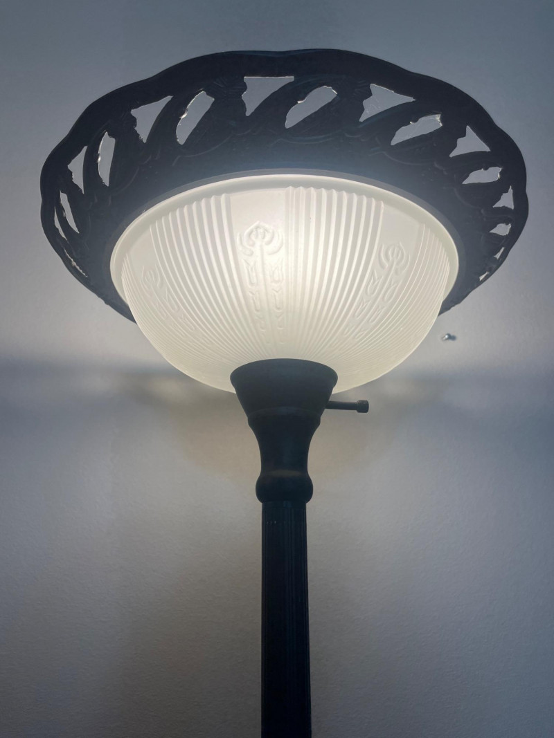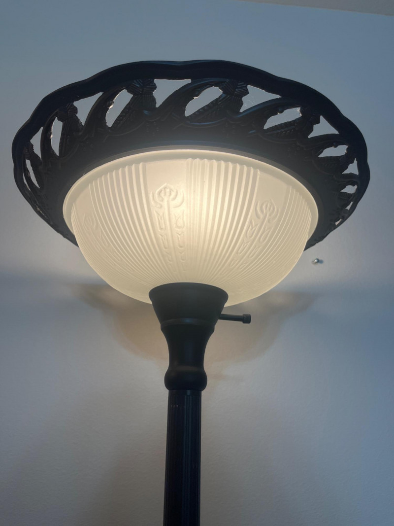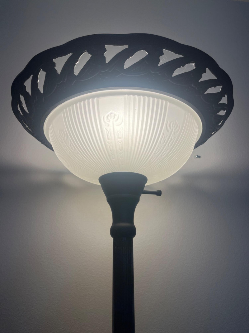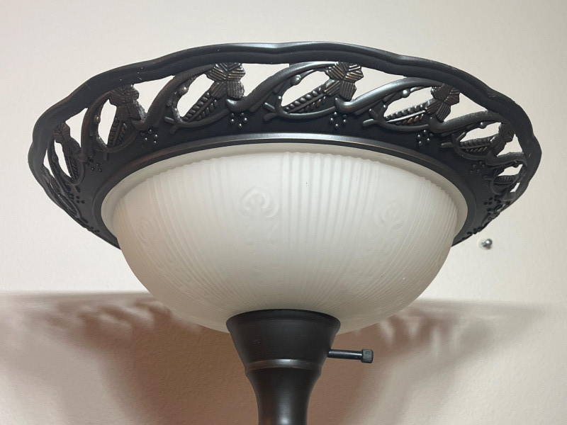 Wrought Iron Styled Floor Lamp with Frosted Glass Shade & 3 Way Switch Lovely lamp with a weighted base, perfect to brighten up any room!