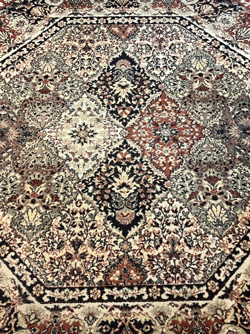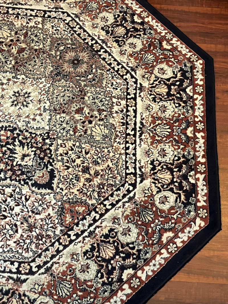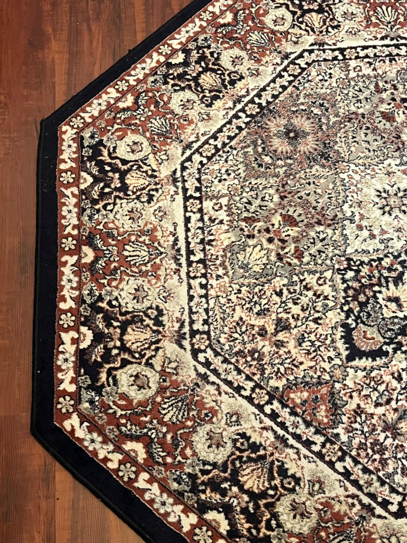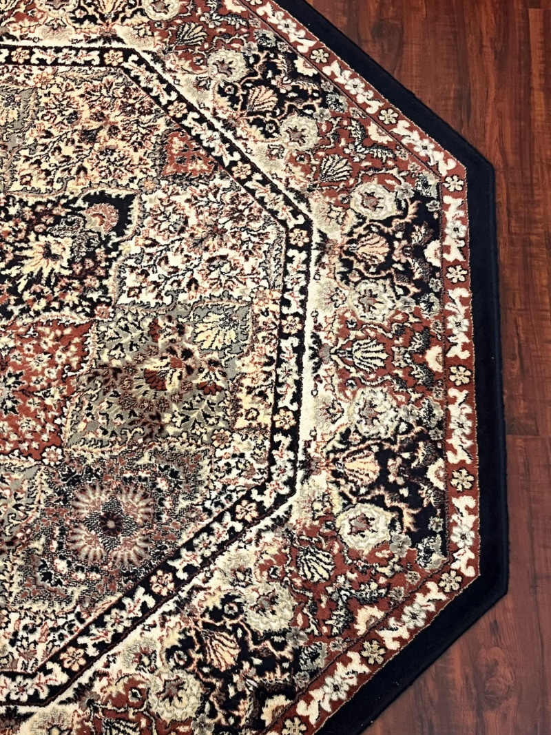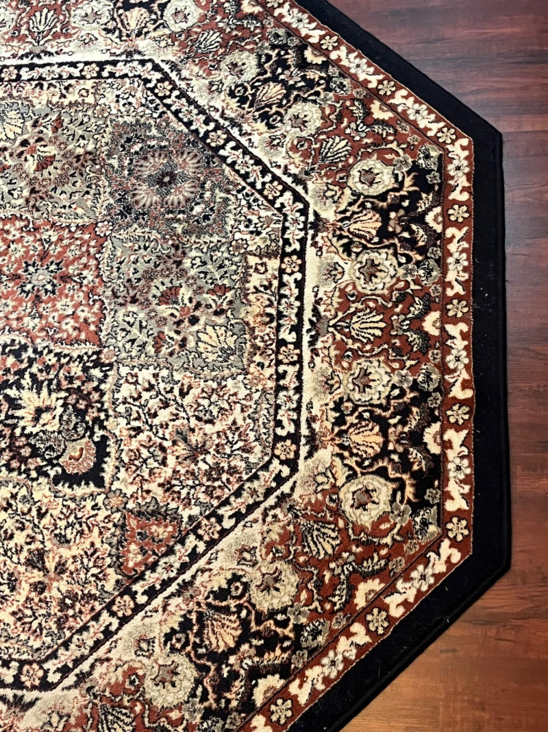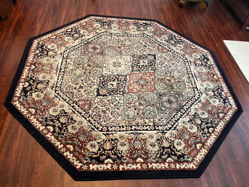 68" Octagonal Rug with Black Trim In good condition with minimal wear.