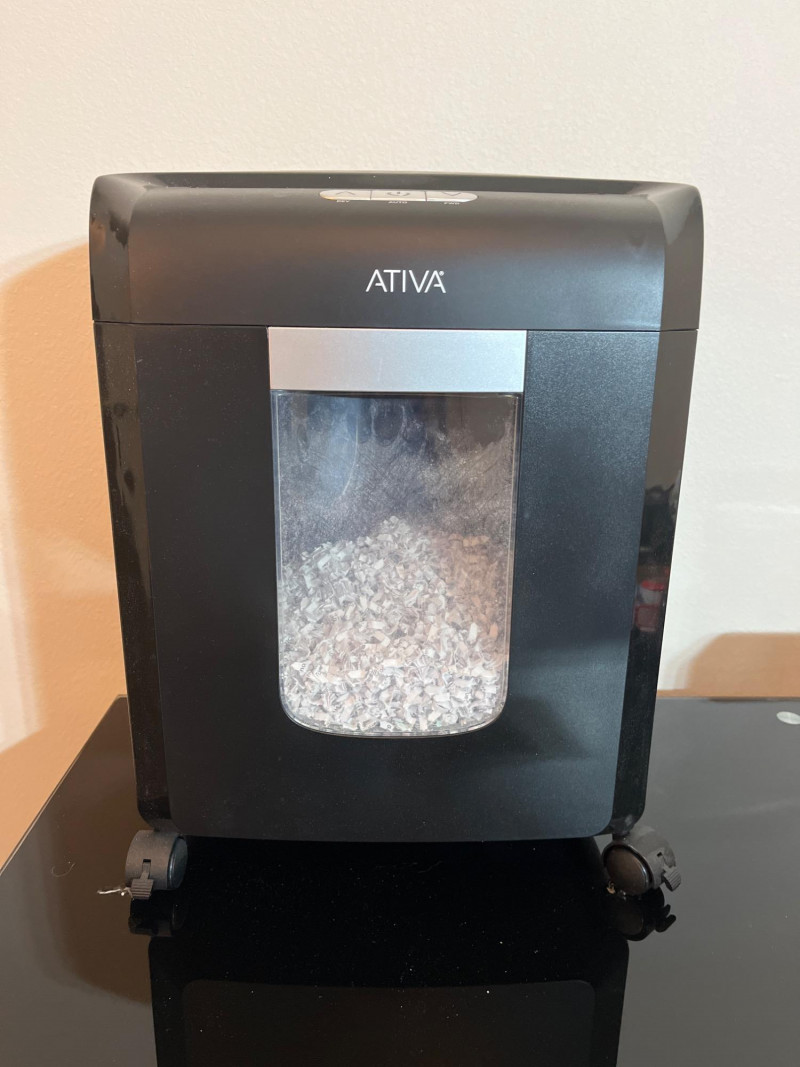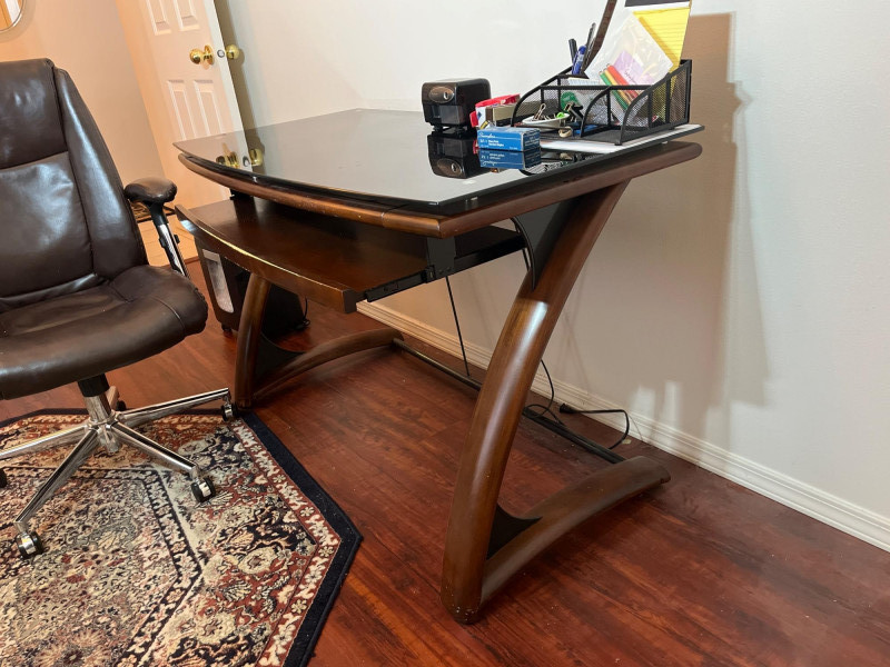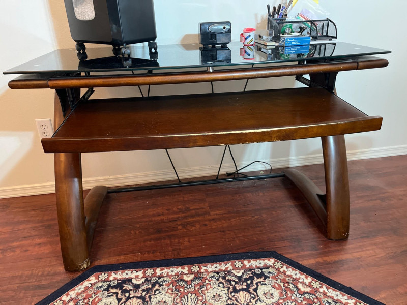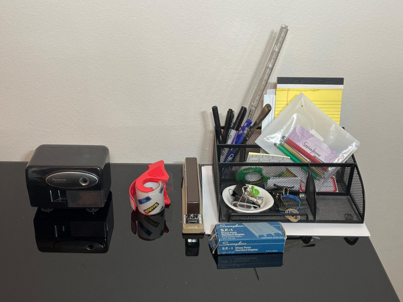 Office Desk, Chair, and Supplies Lot This lot includes the desk, chair, criss cross paper shredder, electric pencil sharpener, and a collection of various office supplies. The desk is 48" long, 24" deep and 30" tall with a glass top and wood legs. The chair is a faux leather and is 25 1/2" wide and 38" tall