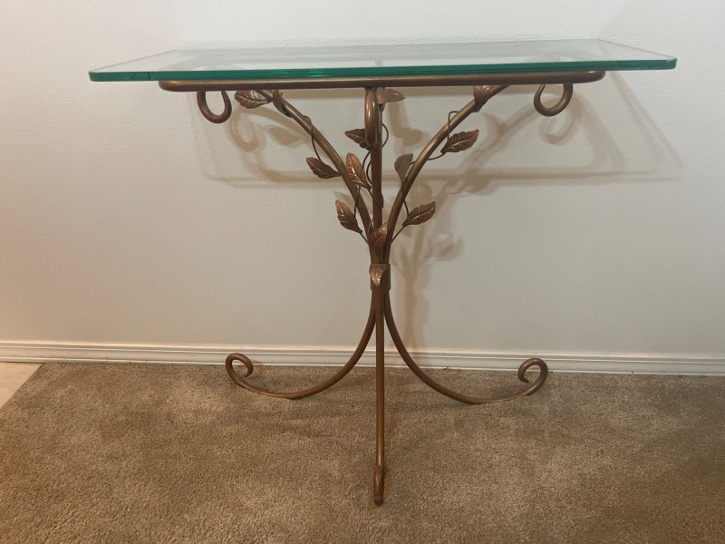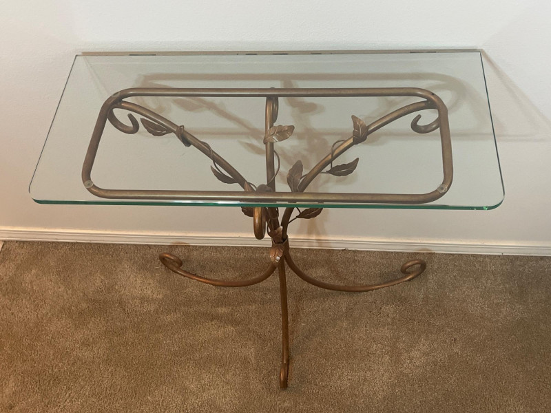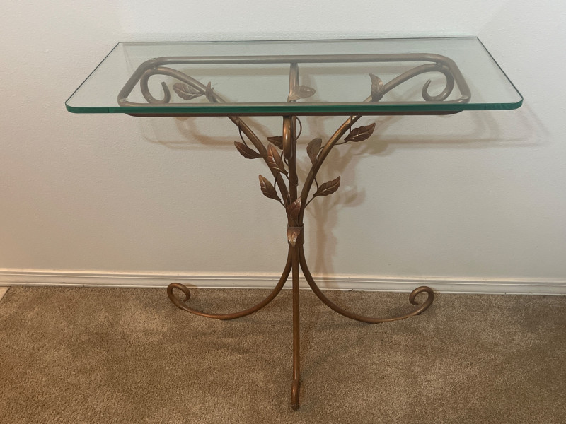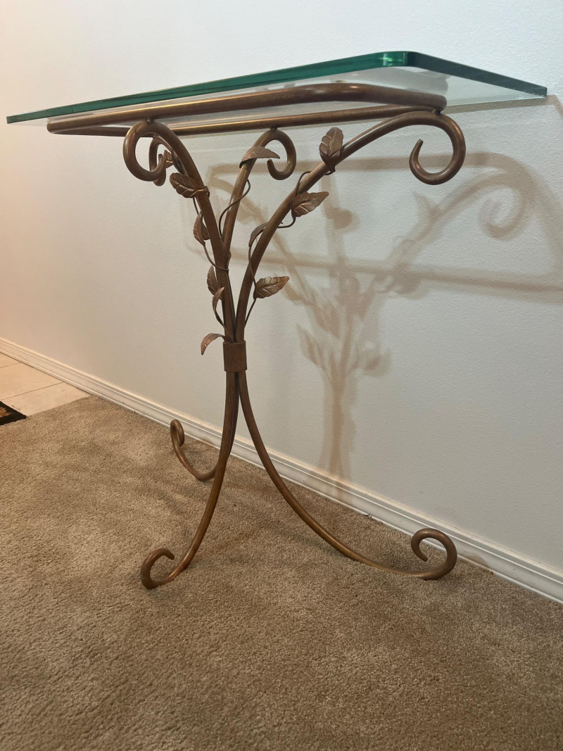 Gold Metal Scroll and Glass Console Table In good condition with no cracks or chips in the glass. Glass top is easily removable from the base. 30" wide, 13 1/2" deep, 29" tall