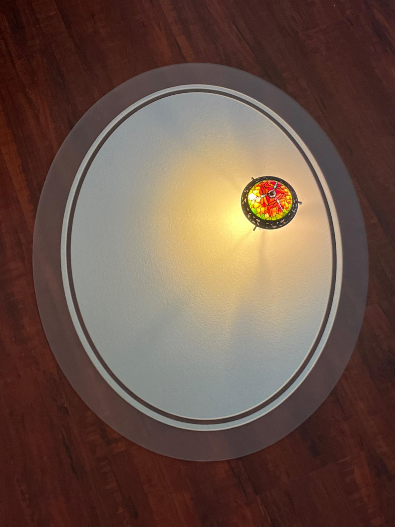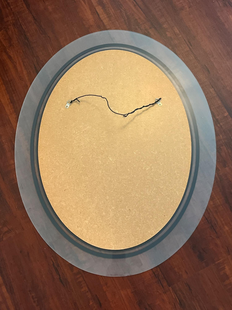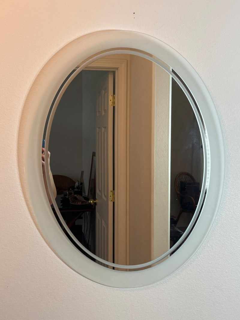 Oval Mirror with Frosted Trim 29" x 23" 29" tall and 23" wide. The trim of the mirror is frosted glass making this a lovely piece for darker colored walls.
