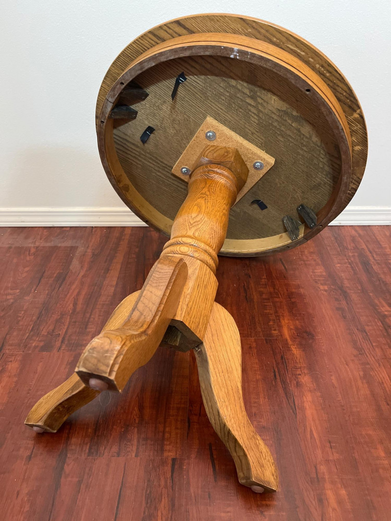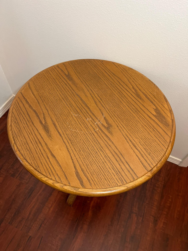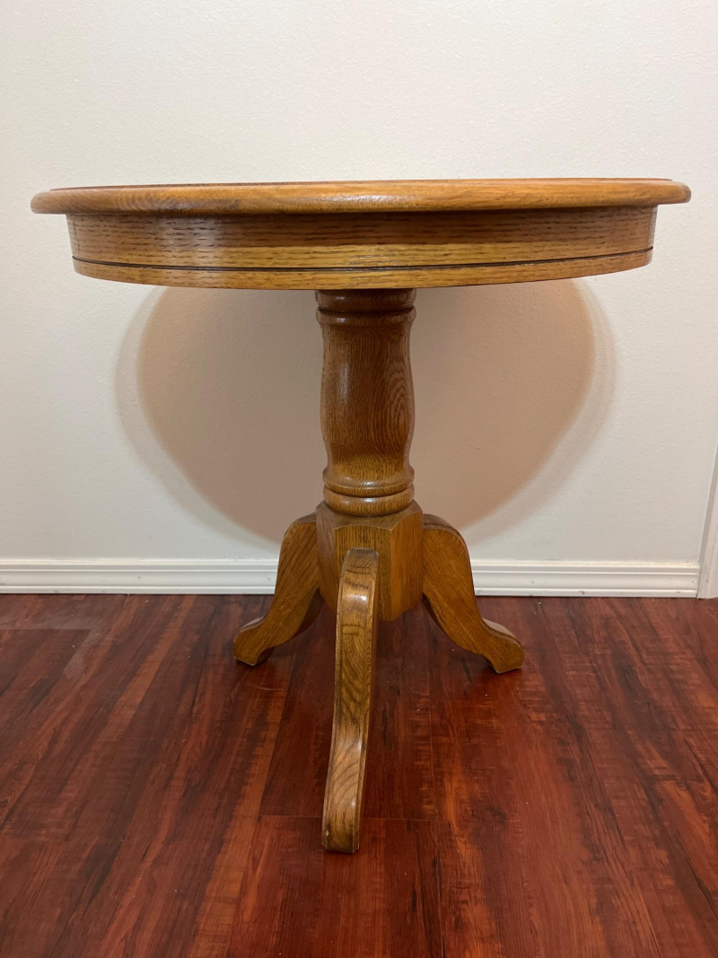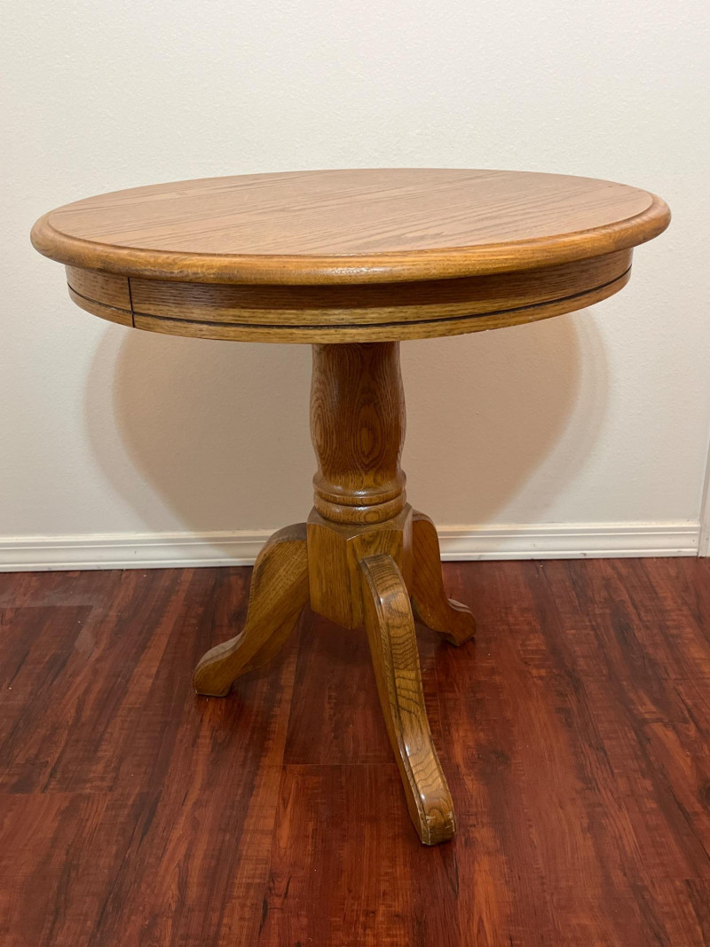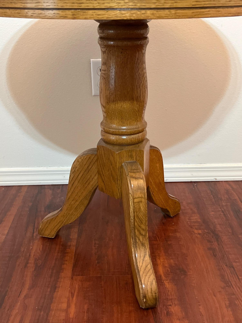 Pedestal Style Accent Oak Table Solid wood and very sturdy! Perfect for use as an end table or night stand.
