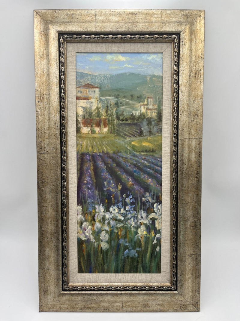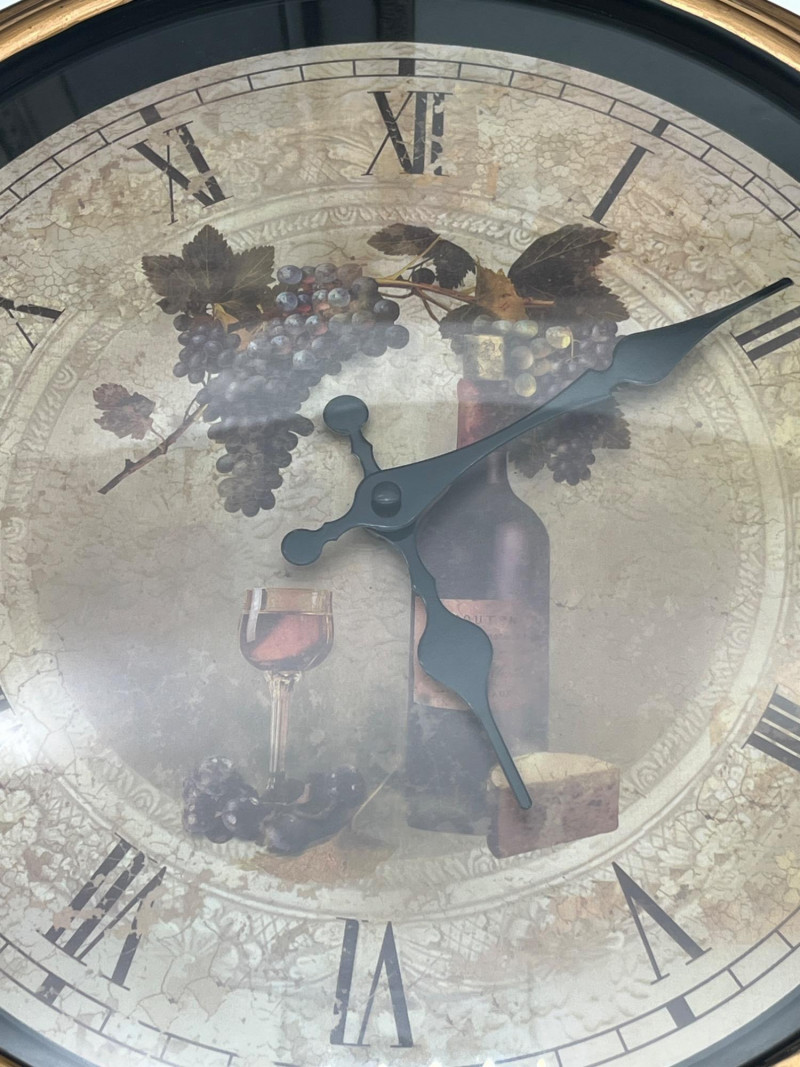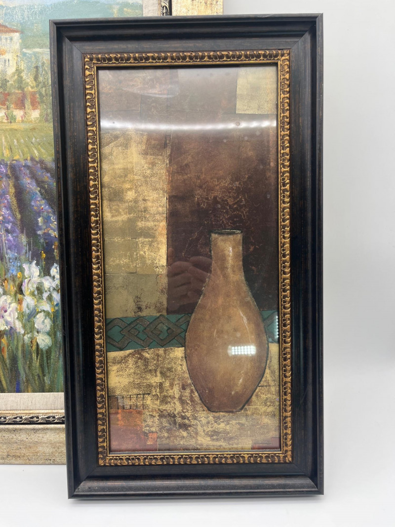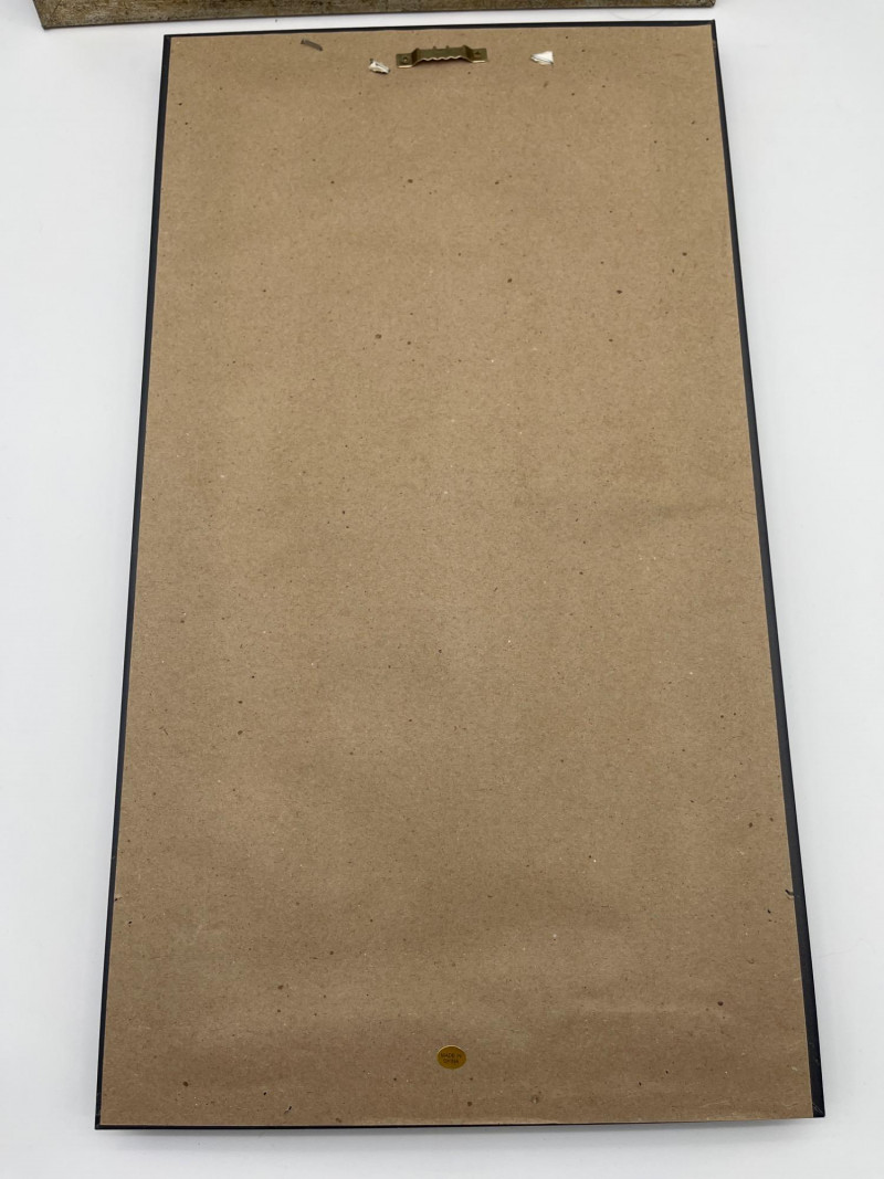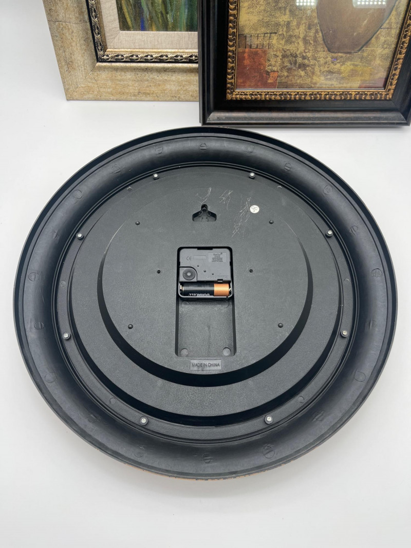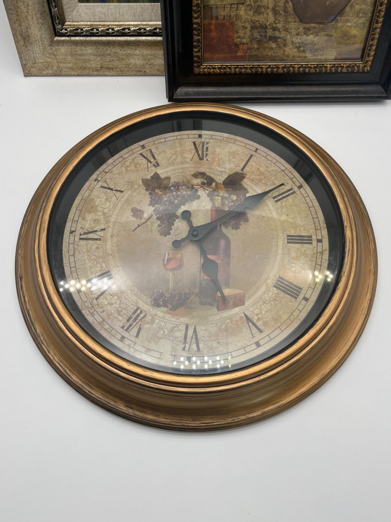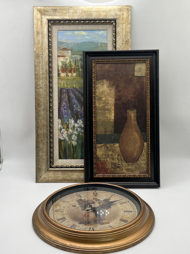 Mediterranean Decor Lot Featuring Battery Powered Clock Clock is in working order and measures 15 1/2" wide. The larger of the two pictures measures 26 1/2" tall and 14 1/2" wide while the smaller measures 20" tall and 11" wide.