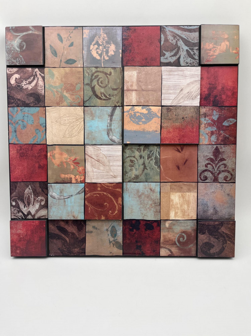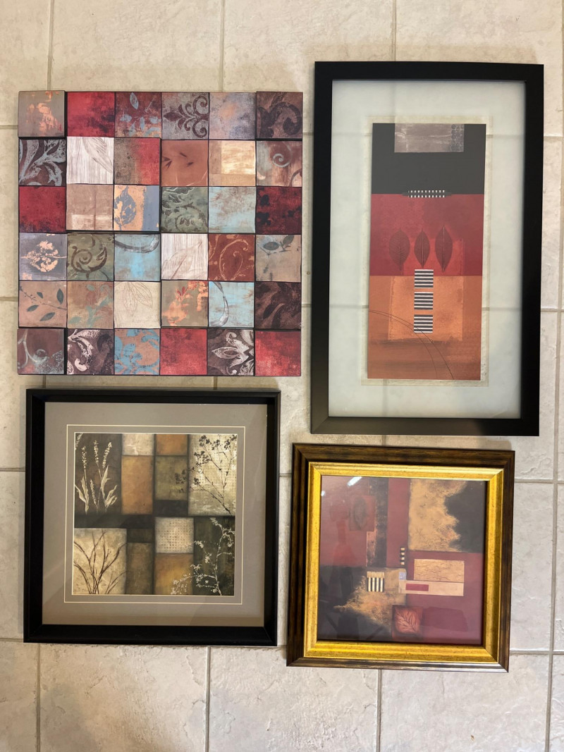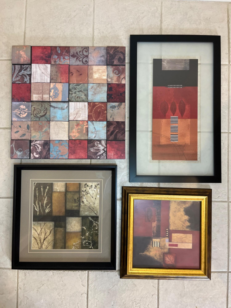 Contemporary Framed Art Tallest piece (in black frame) is 26" tall and 16" wide. Smallest piece (gold frame) is 15 1/2" square.