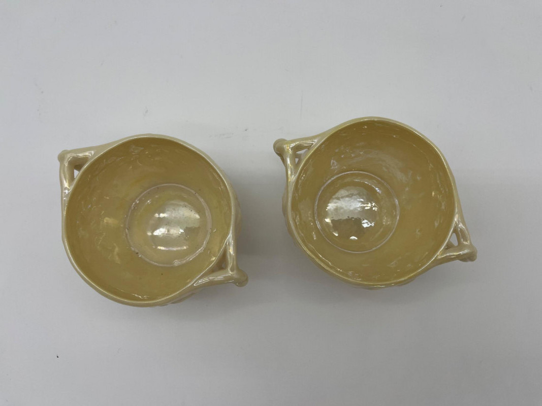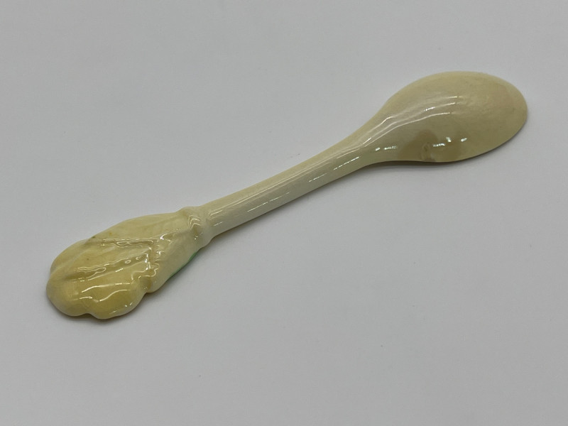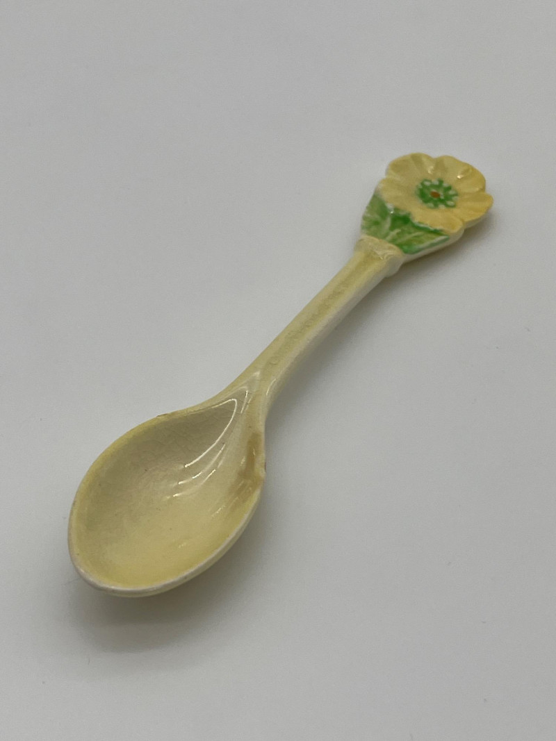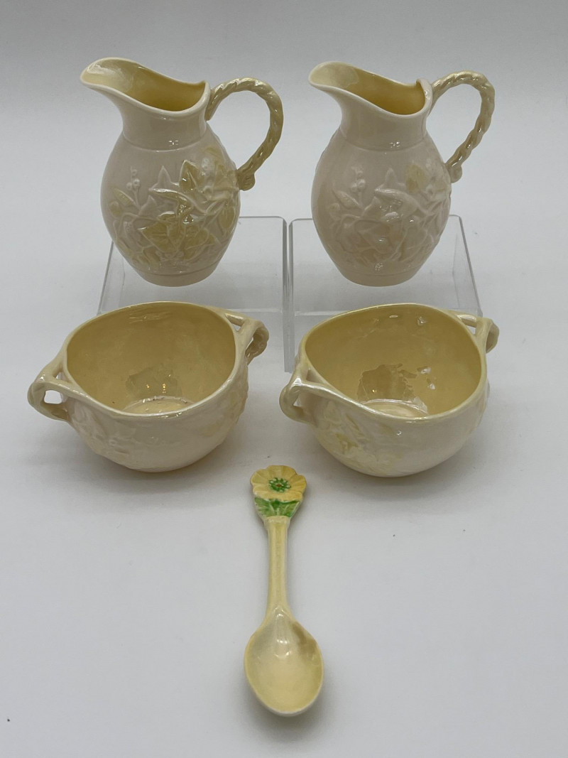 Two Belleek Creamer and Sugar Bowl Sets (5th and 6th Green Stamps) Both sets are in good condition with no cracks, chips, or crazing. Also included is a cute ceramic spoon with a yellow flower at the end. The spoon is not Belleek but very similar. The spoon does have a chip and stain on the edge which can been seen in photos.