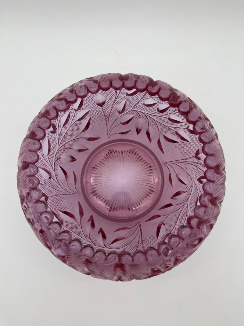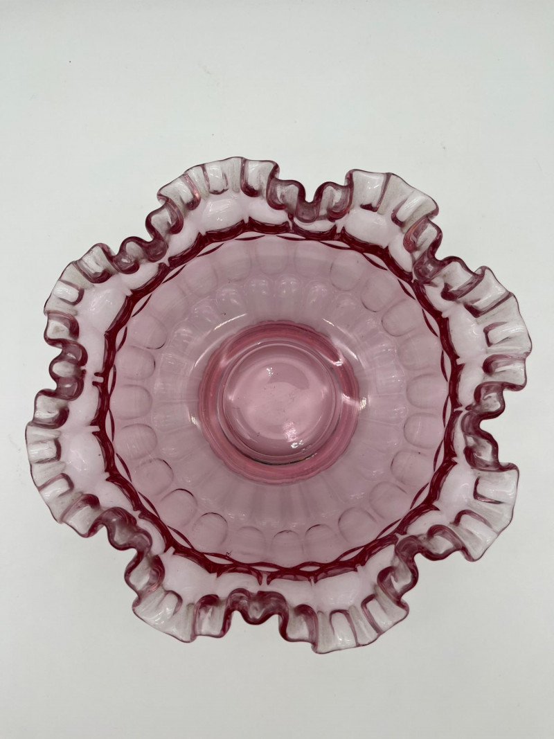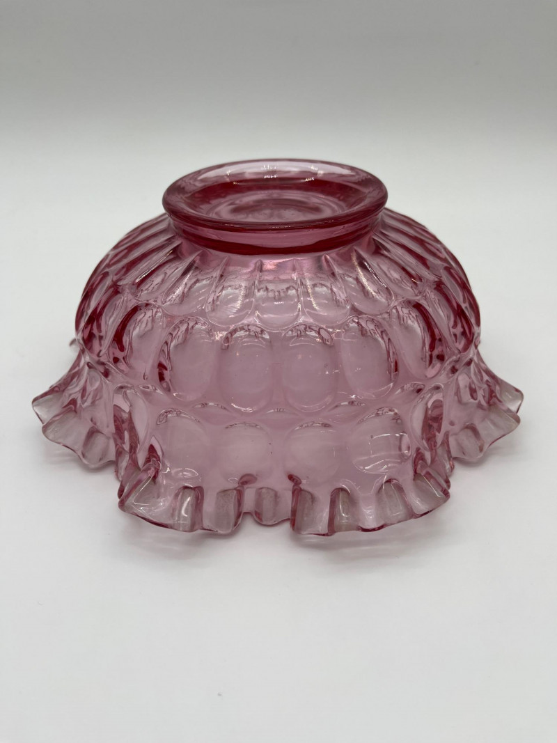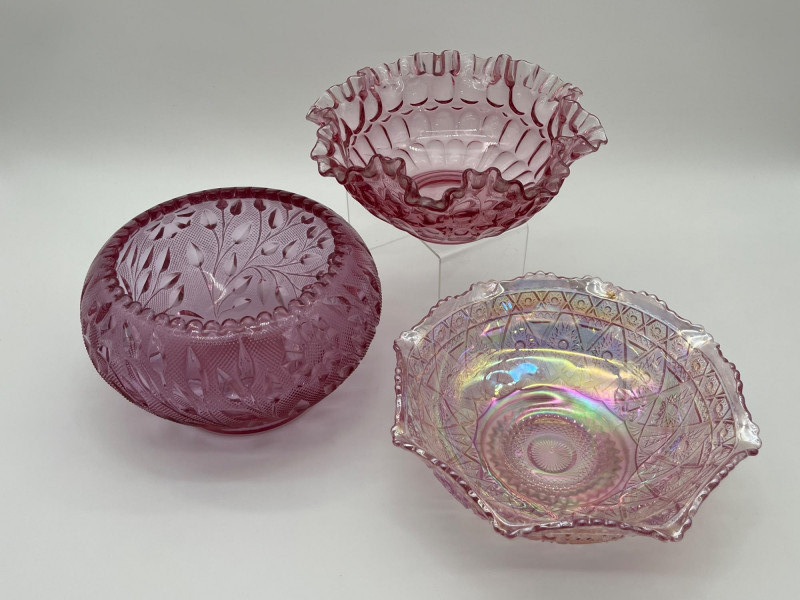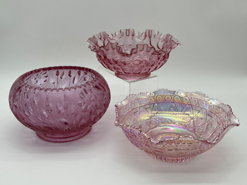 Pink Glass Bowls Lot Featuring Fenton Ruffled Thumbprint Bowl This lot includes: All three pieces are in very good condition with no cracks or chips.