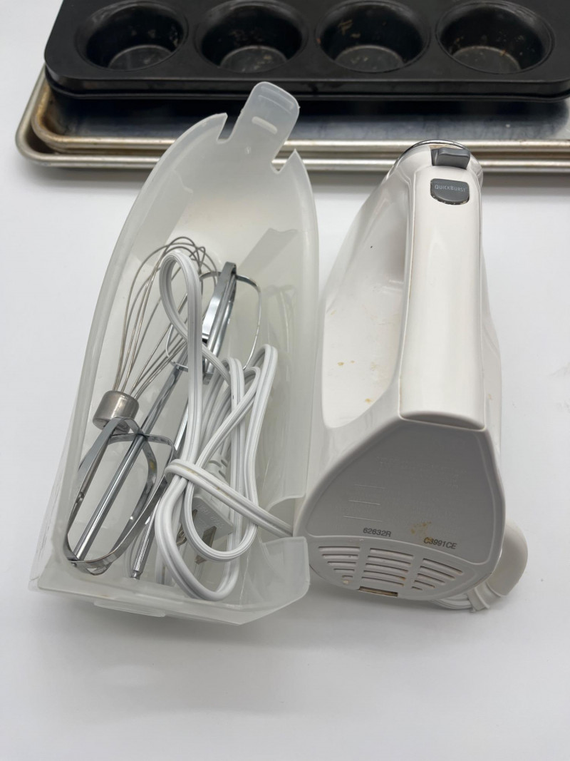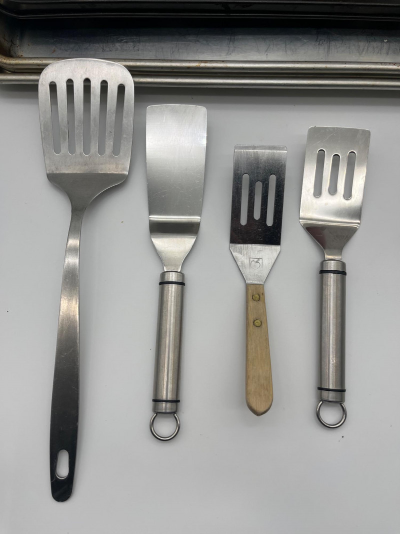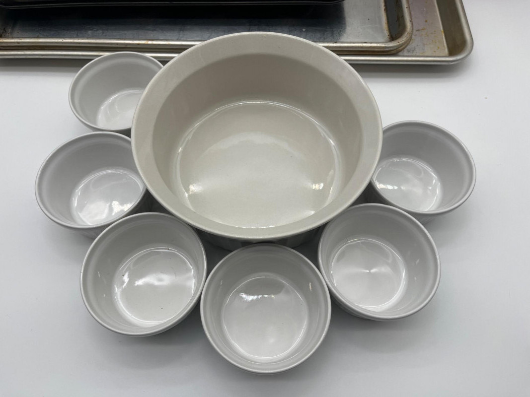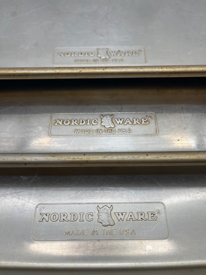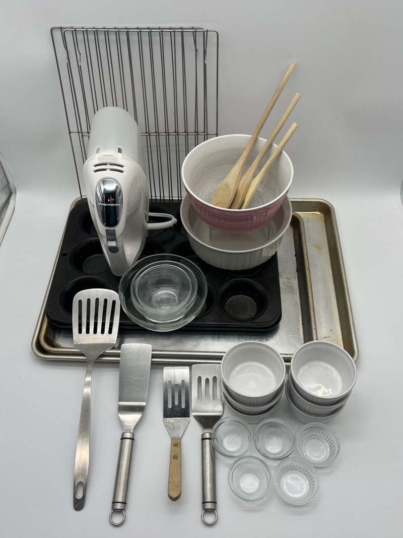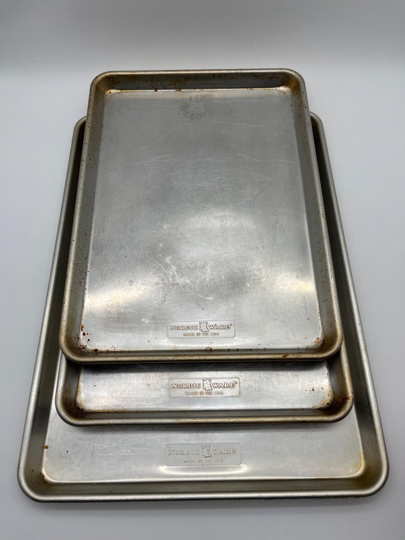 Baking Lot Includes everything shown including three Nordic Ware jellyroll pans, muffin tin, 7" mixing bowl, multiple portion bowls and metal spatulas. All items are used (and well loved!) but in good, usable condition.