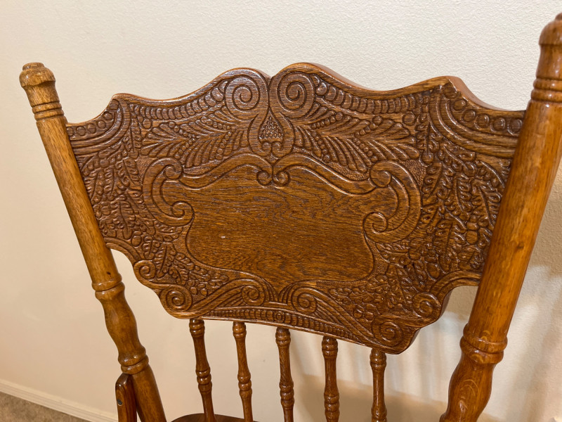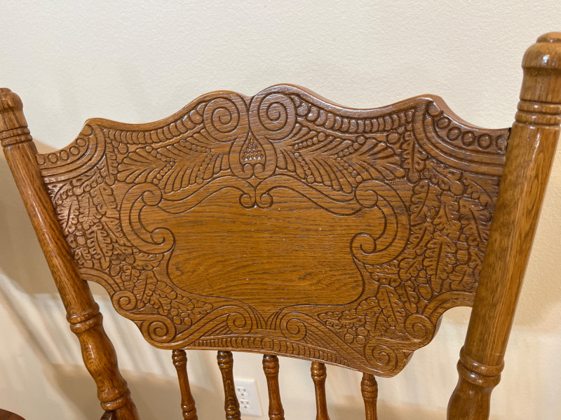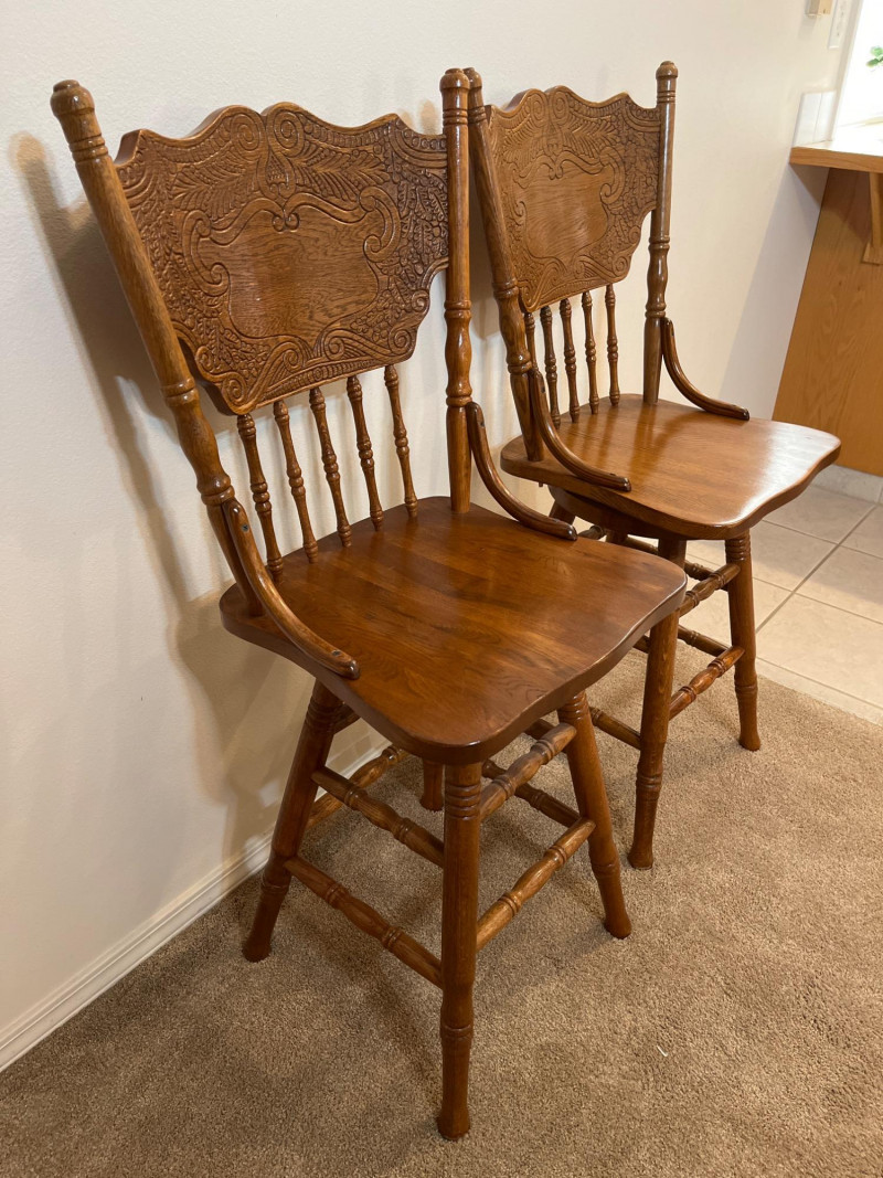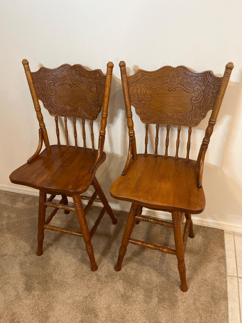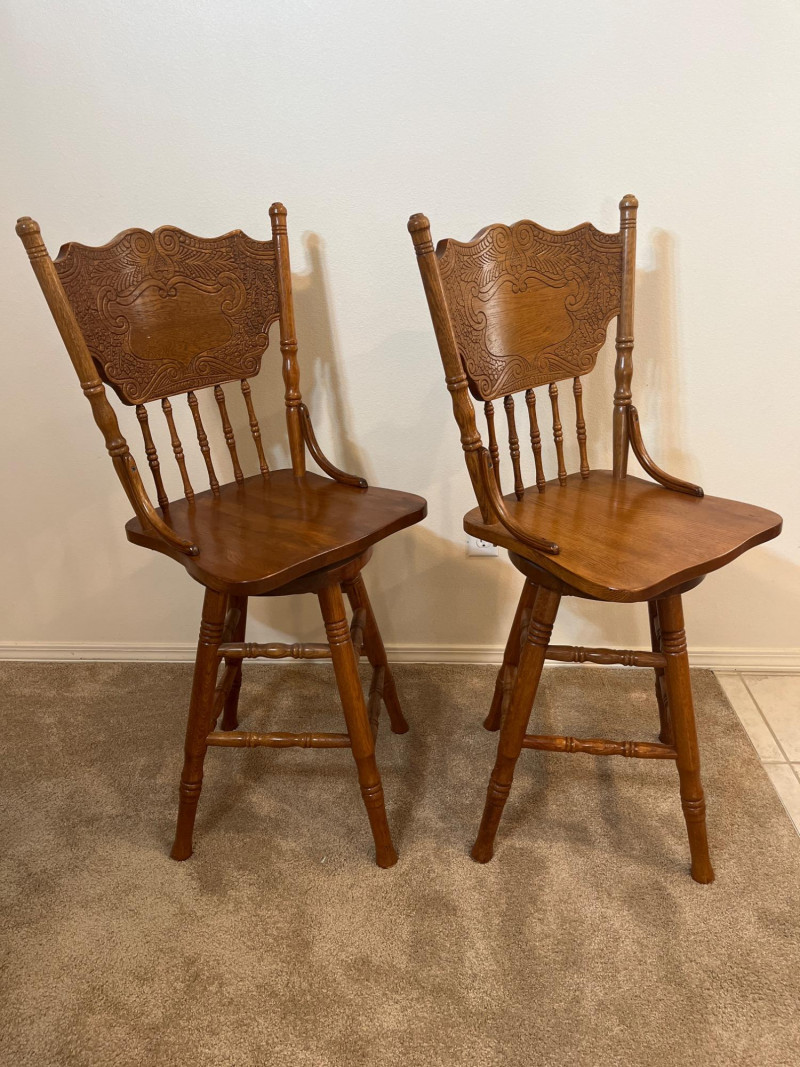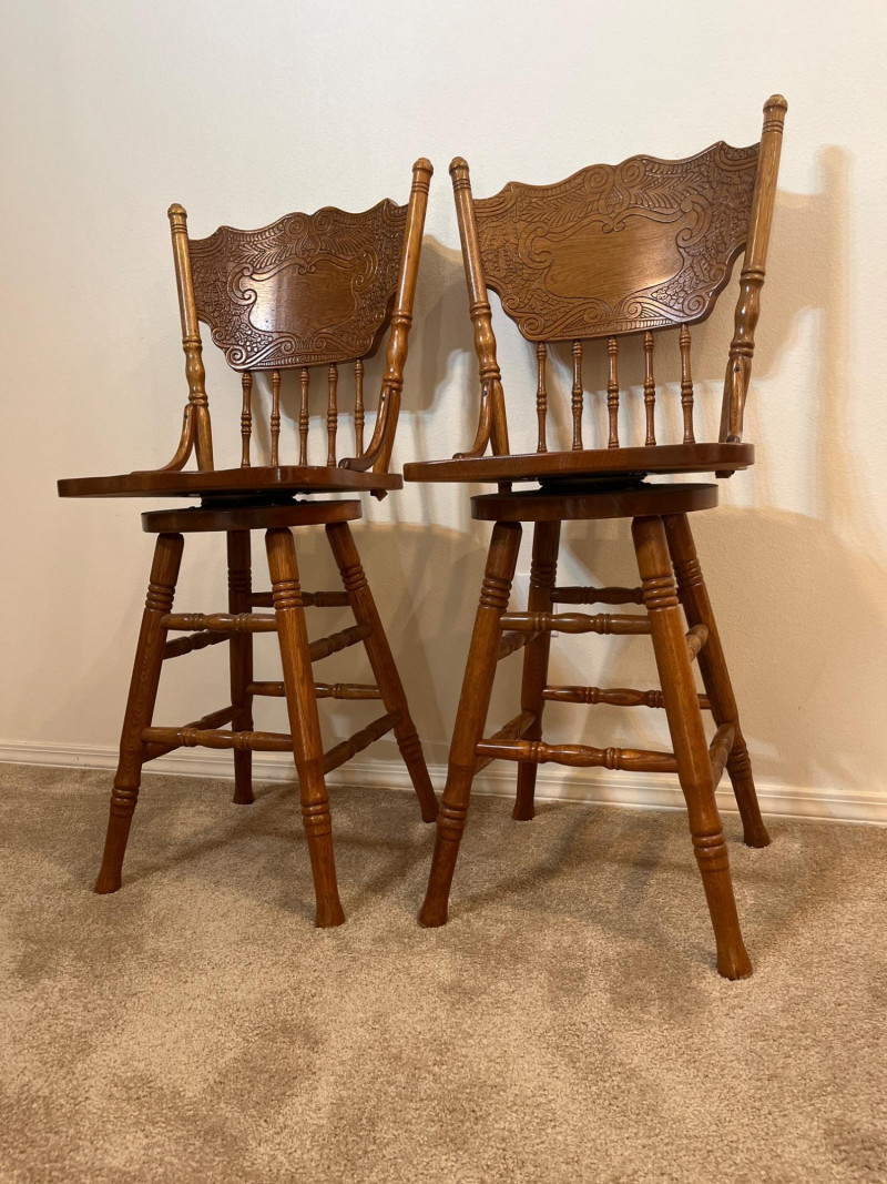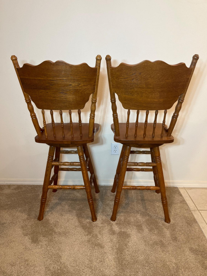 Amish Apple Grove Pressback Style Swiveling Oak Bar Stools Both are in very good condition with no damage seen. Both chairs swivel freely.